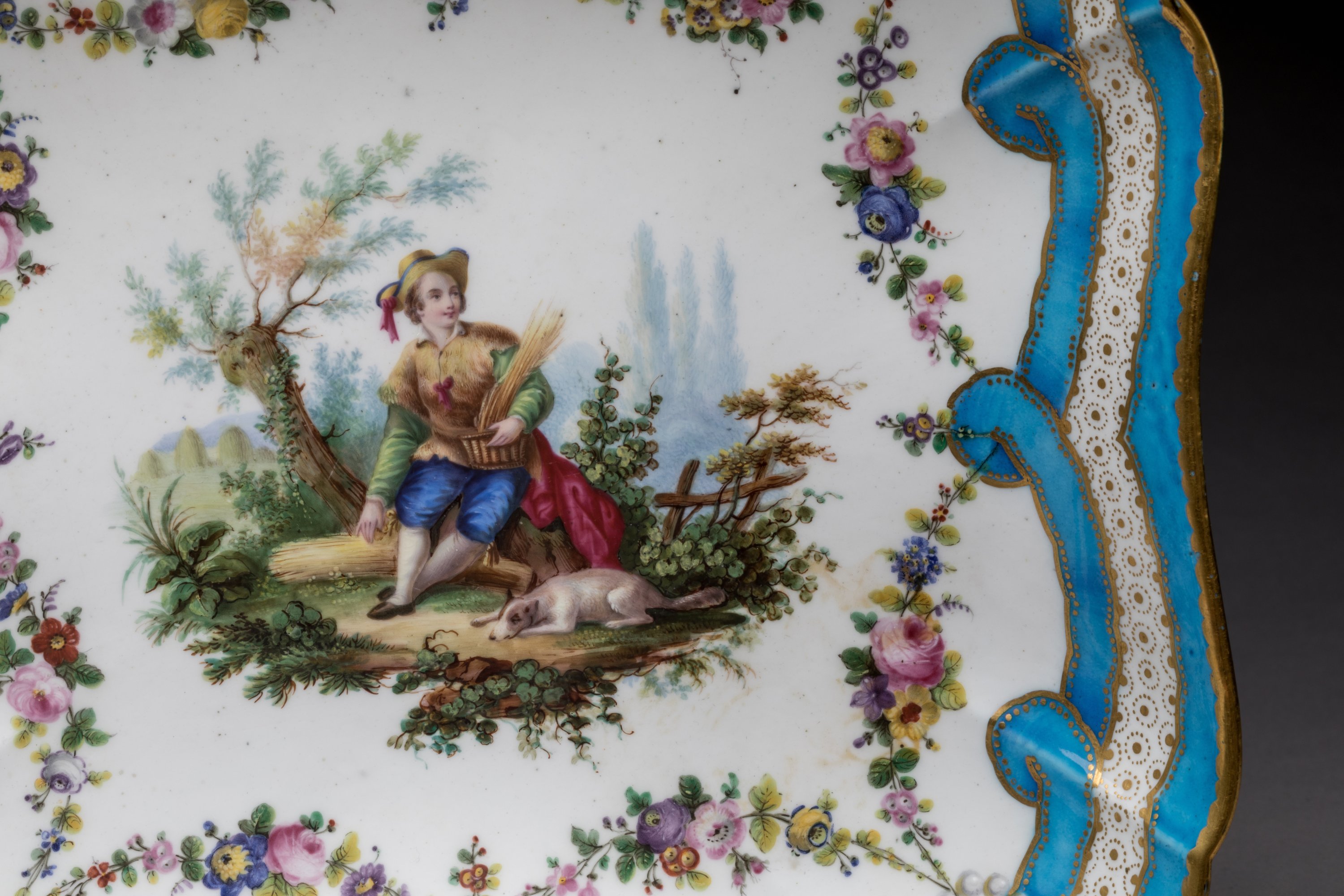 en porcelaine tendre à décor polychrome et or au centre de scènes champêtres figurant un jeune moissonneur assis à côté d'un chien et une jeune fileuse assise à côté de son agneau, sur les bords de guirlandes fleuries accrochées à des rubans bleu céleste cernés de filets or alternant avec une bande décorée d'œil de perdrix or. Montures en bronze doré du XIXe siècle.