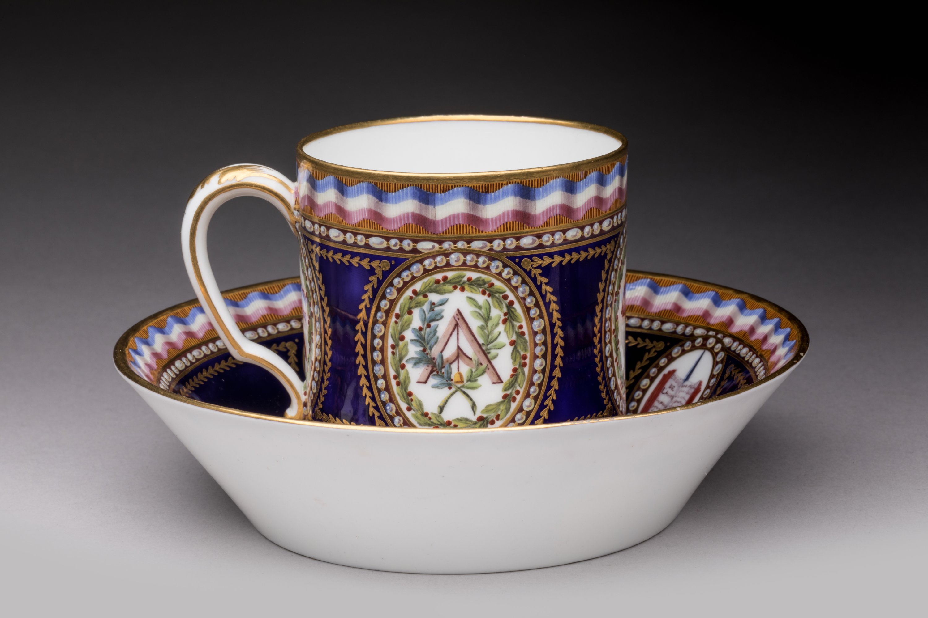 Important "litron" cup and saucer, by the painter Guillaume Noël. Rare and rich decoration in Sèvres during the revolutionary period in 1794.