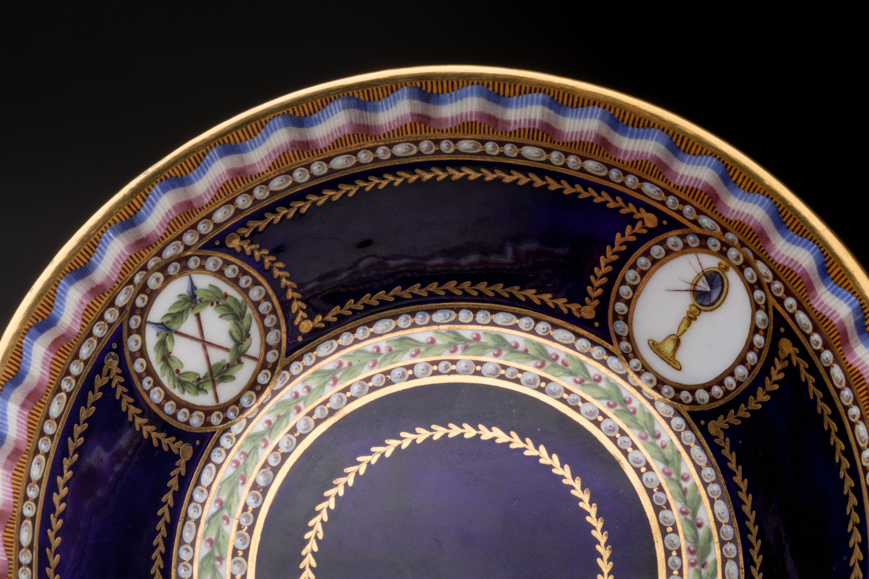 première grandeur, en porcelaine tendre, à fond beau bleu sur lequel se détache un très riche décor de quatre médaillons ovales ornés de symboles révolutionnaires et maçonniques (faisceau de licteur, bonnet phrygien, niveau) cernés de filets or, de frises de perles, et de frises feuillagées stylisées or.