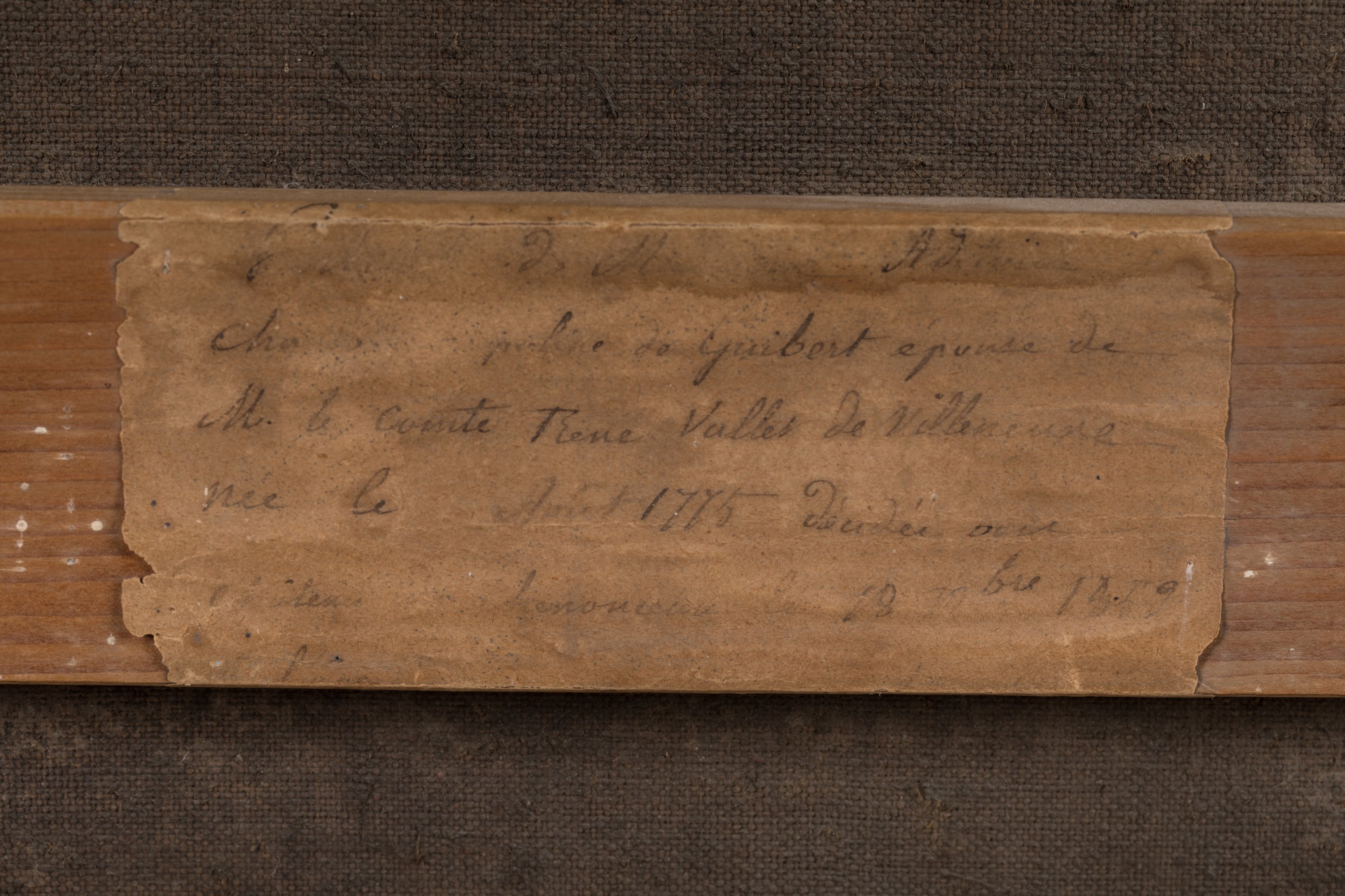 Apolline Charlotte Adélaïde de Guibert (1776-1852) épouse en 1795 René, François Vallet, comte de Villeneuve (1777-1863), qui hérite par sa tante Louise Dupin du château de Chenonceau en 1799. Comte d'Empire et Chambellan de la Reine Hortense, Villeneuve est également le tuteur de George Sand. Fille d'un maréchal des camps de Louis XVI, Apolline de Villeneuve devient dame du Palais de la Reine Hortense, future reine de Hollande. Elle pose pour ce portrait avec une triple fraise de dentelle, un foulard créole et des boucles d'oreilles en perle noire, symbole de son attachement à la maison de la fille de Joséphine de Beauharnais.