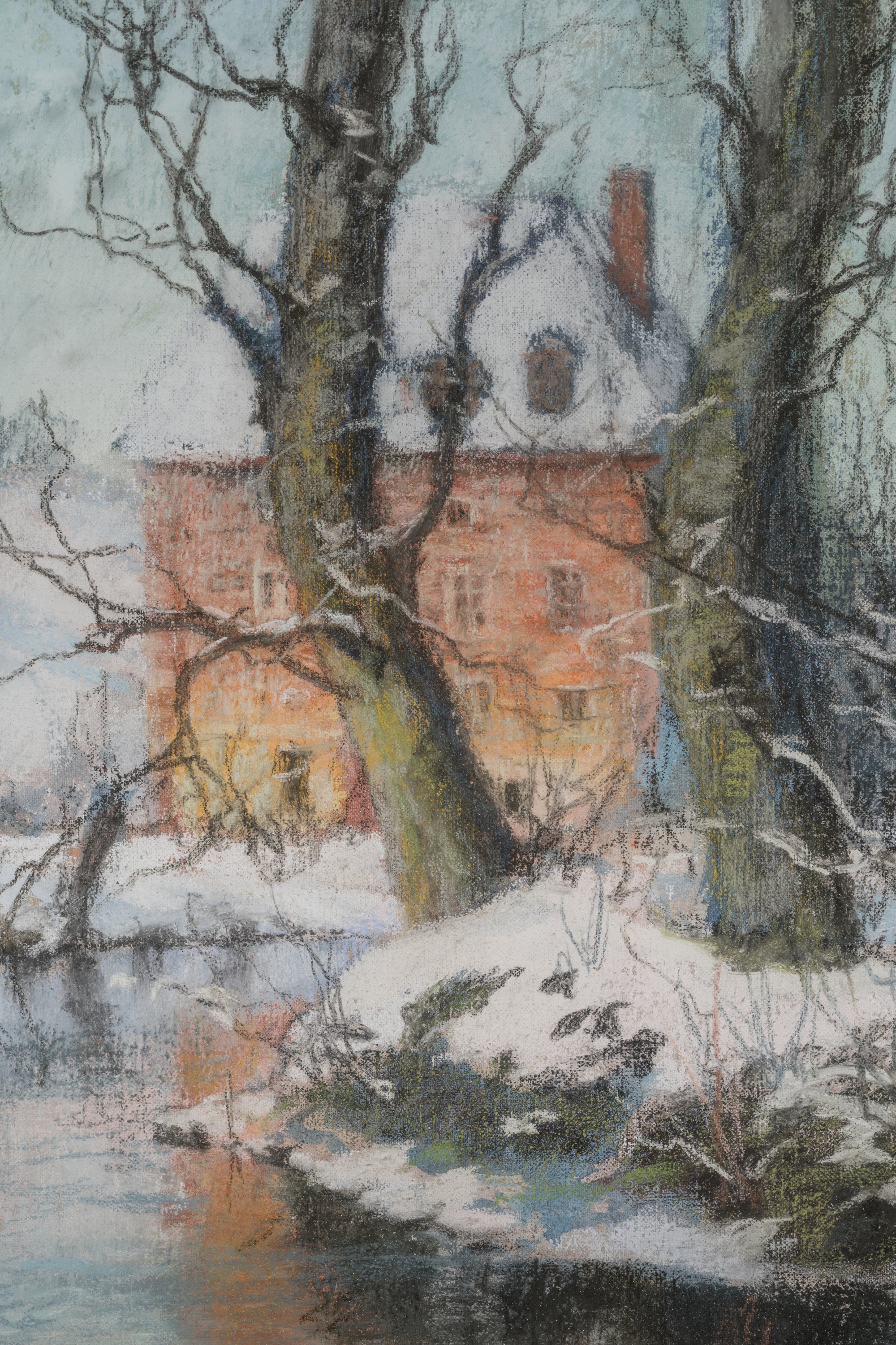 River under the snow, a pastel by Frits Thaulow around 1895.
