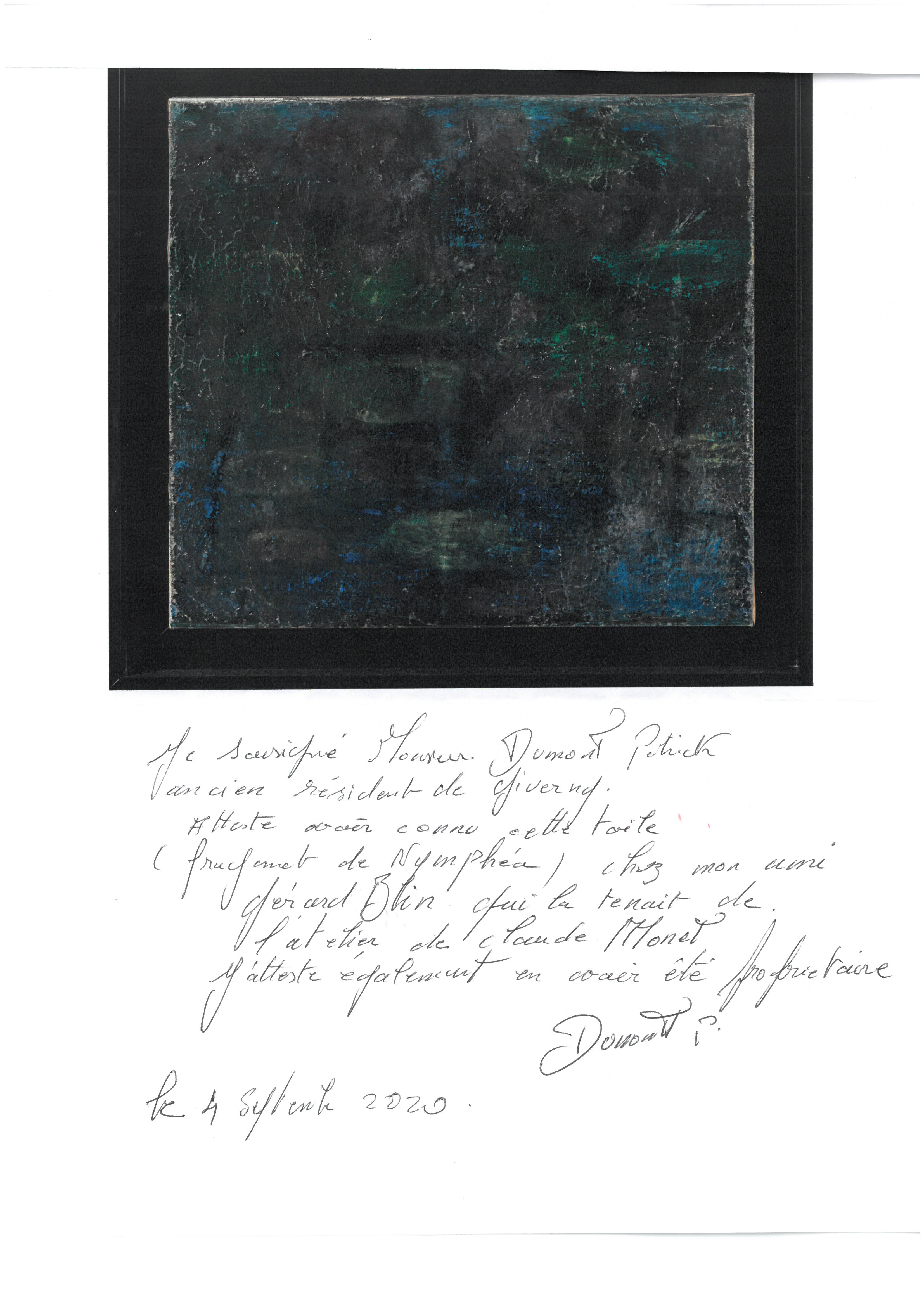 À la mort de Michel Monet, le fils du peintre, les Blin disposent de l'usufruit de la maison de Giverny et reçoivent ces toiles. Le fragment que nous présentons appartenait à un camarade de Gérard Blin, le fils du jardinier du peintre, ainsi qu'en témoigne leur directrice d'école dans une lettre autographe. Il est à rapprocher d'un autre fragment exposé en 1992 à la Stadthalle à Balingen lors de l'exposition "Claude Monet" (n°32), puis vendu à Paris le 21 novembre 2011 (Me Millon, n°63). Ces feuilles de nénuphars posées sur l'eau nous éclairent tel un phare de l'histoire de l'Art, symboliquement sauvegardées par celui qui avait la charge de prendre soin du sujet de ce cycle.