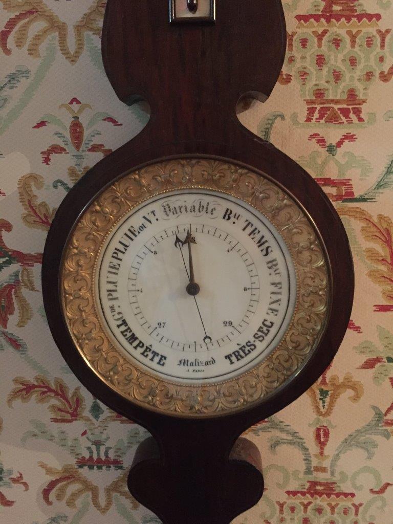 BAROMÈTRE en bois teinté noir. Le cadran entouré d'une frise en métal. Le cadran signé Malizard à Paris.