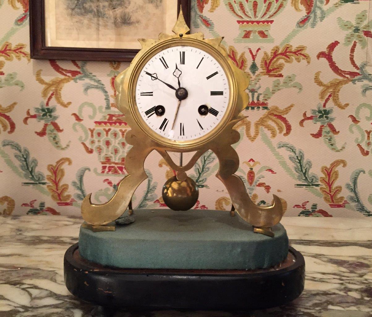 PENDULE SQUELETTE en laiton. Le cadran émaillé indiquant les heures...
