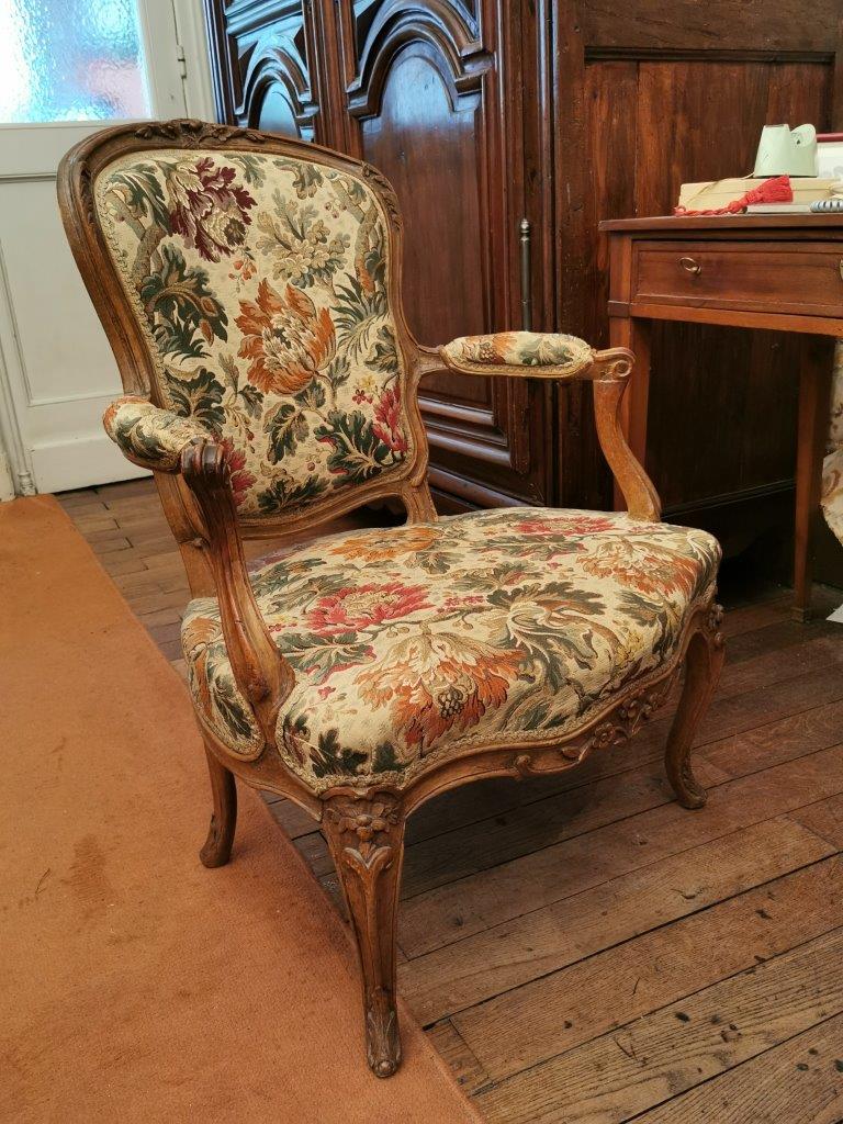 JOINT : FAUTEUIL CABRIOLET en bois naturel, le dossier de forme violoné, les accotoirs à manchettes. Quatre pieds galbés. Époque Louis XV. Haut. 85, Larg. 62, Prof. 64 cm.