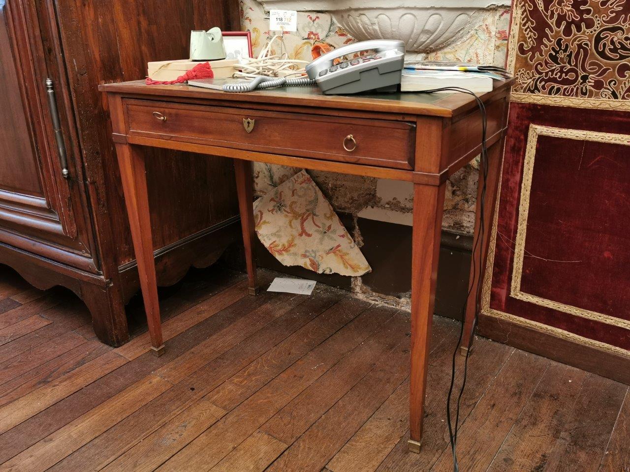 Petit BUREAU en placage d'acajou ouvrant par un tiroir. Quatre pieds gaines. Le dessus foncé d'un cuir vert. Ornementation de laiton.