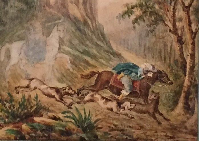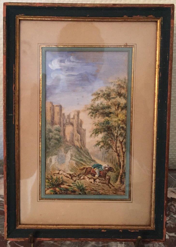 Jehanne GONDOUIN (1851-1942)Chasse à courre en contre plongé d'un château.Aquarelle...