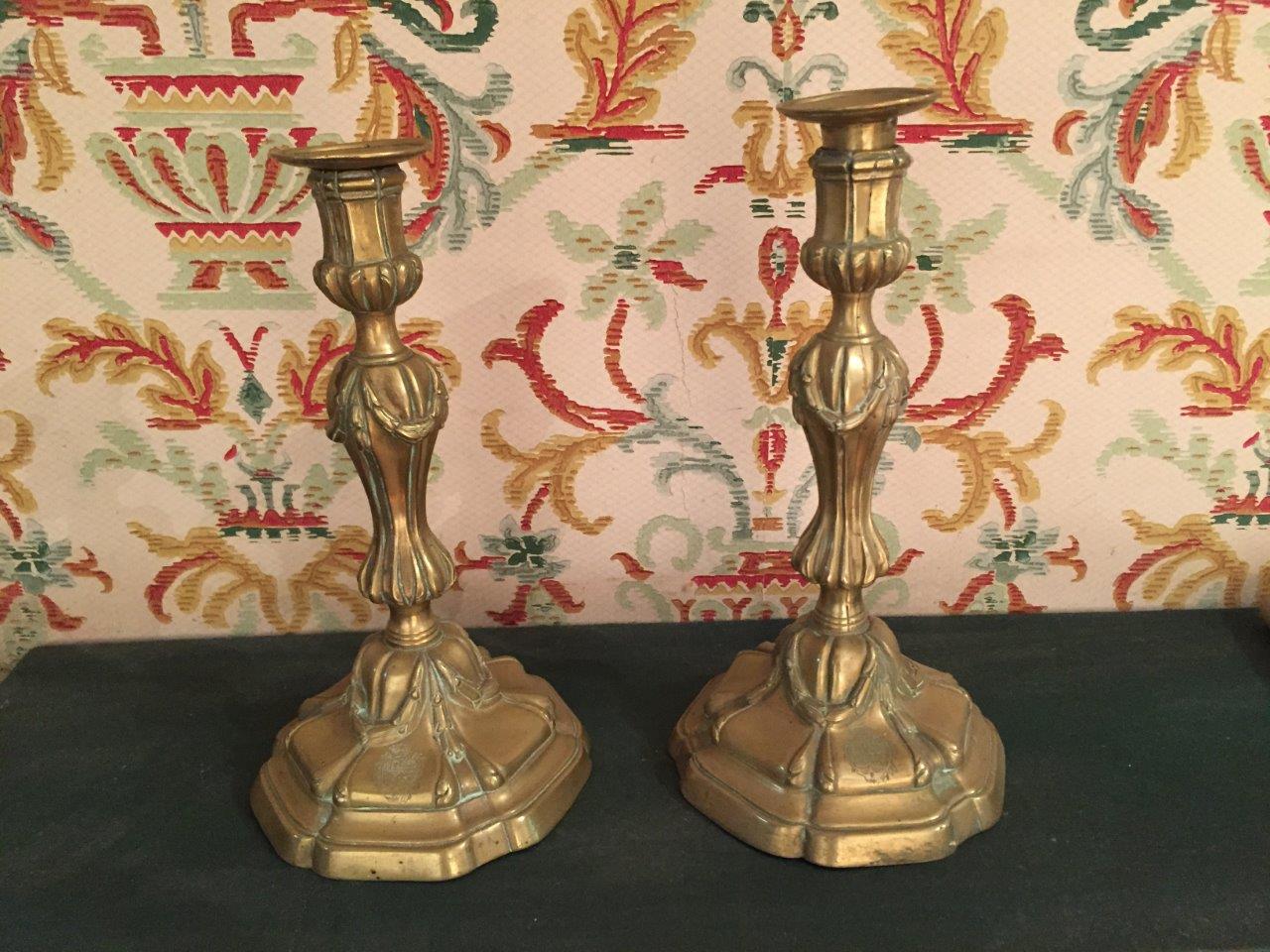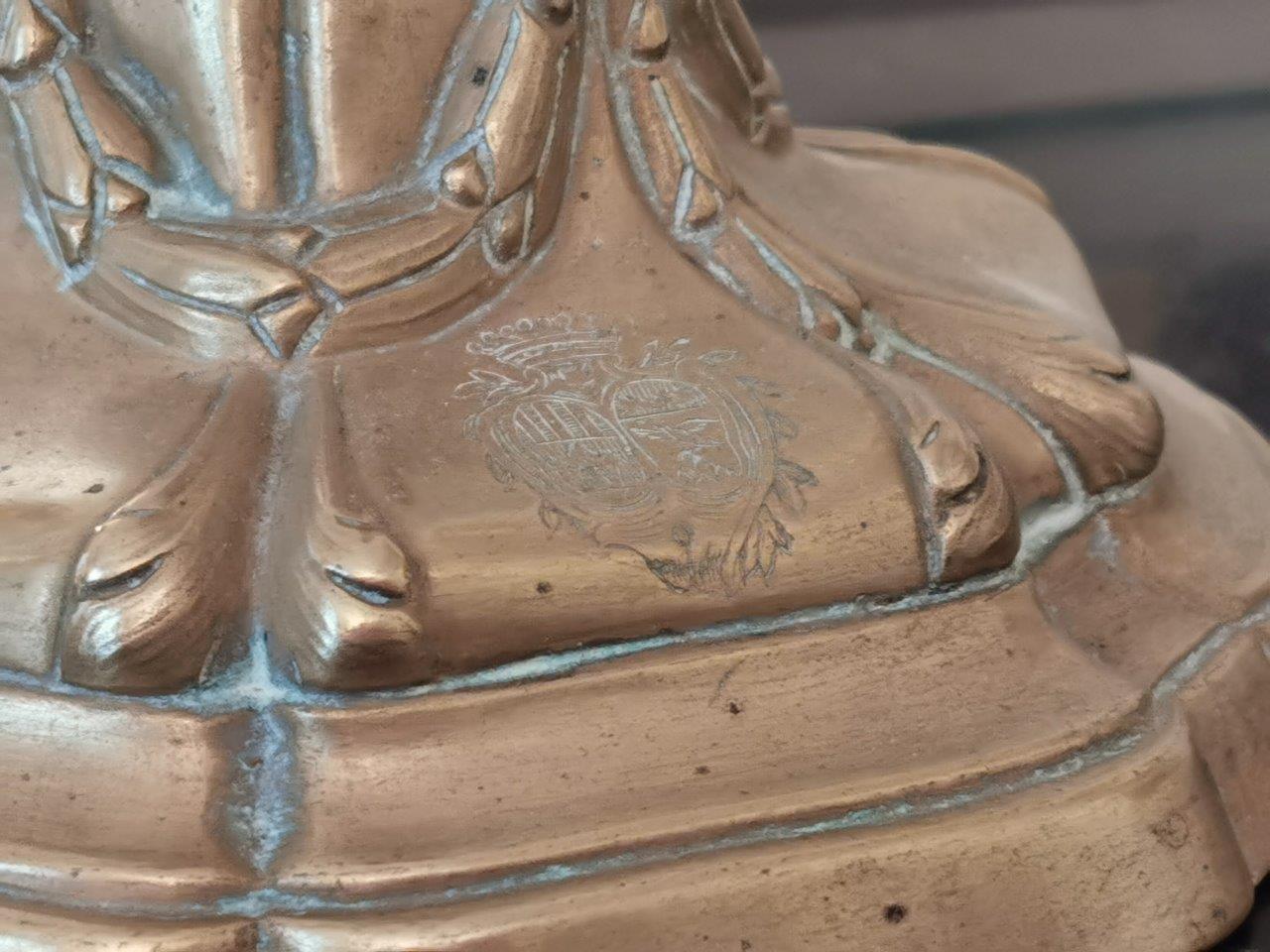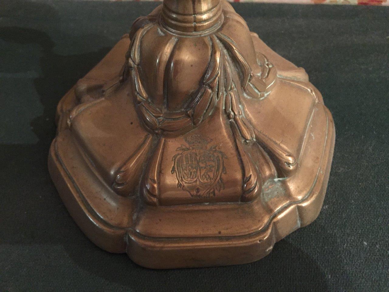 PAIRE de FLAMBEAUX en bronze doré à la forme mouvementée à décor de guirlande. La base ornée d'armes d'alliances surmontées d'une couronne comtale.