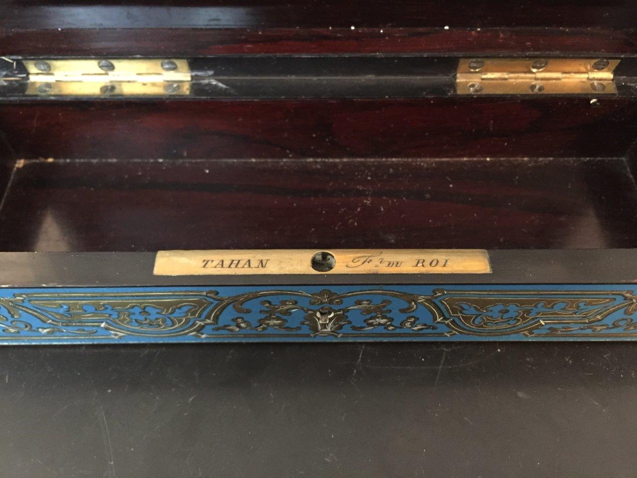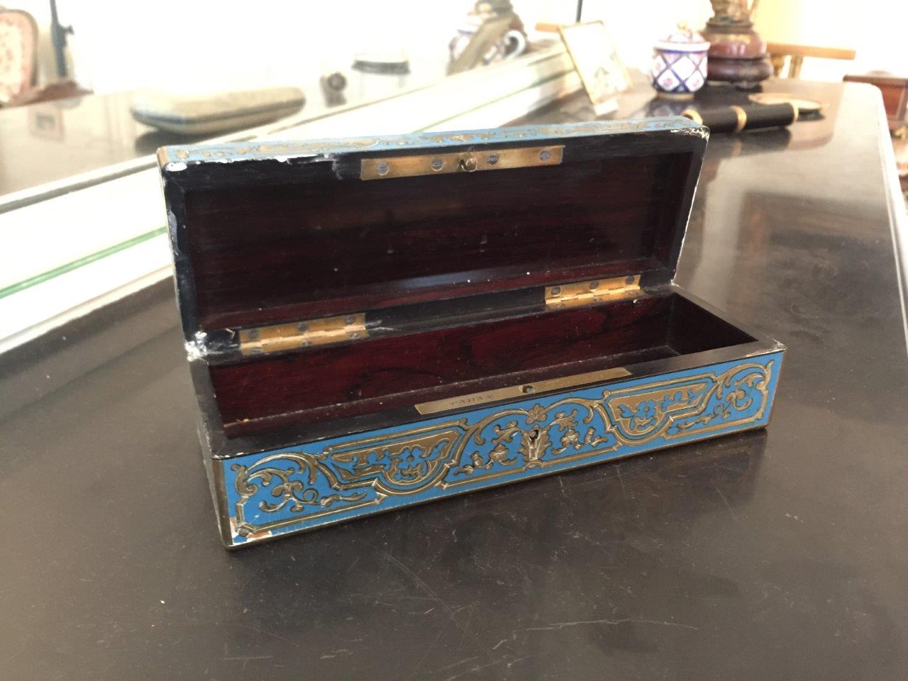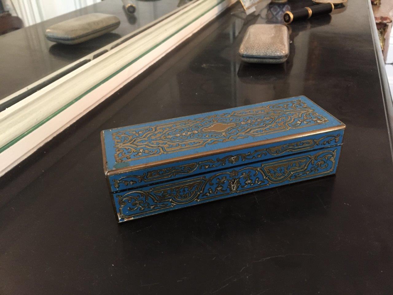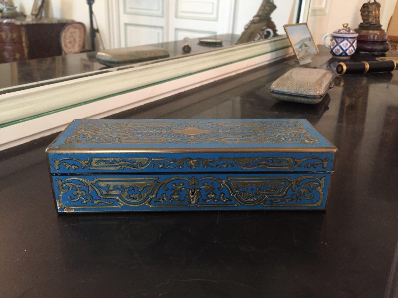 BOÎTE À GANTS en marqueterie dite Boulle à filets de laiton et bois laqué bleu.
