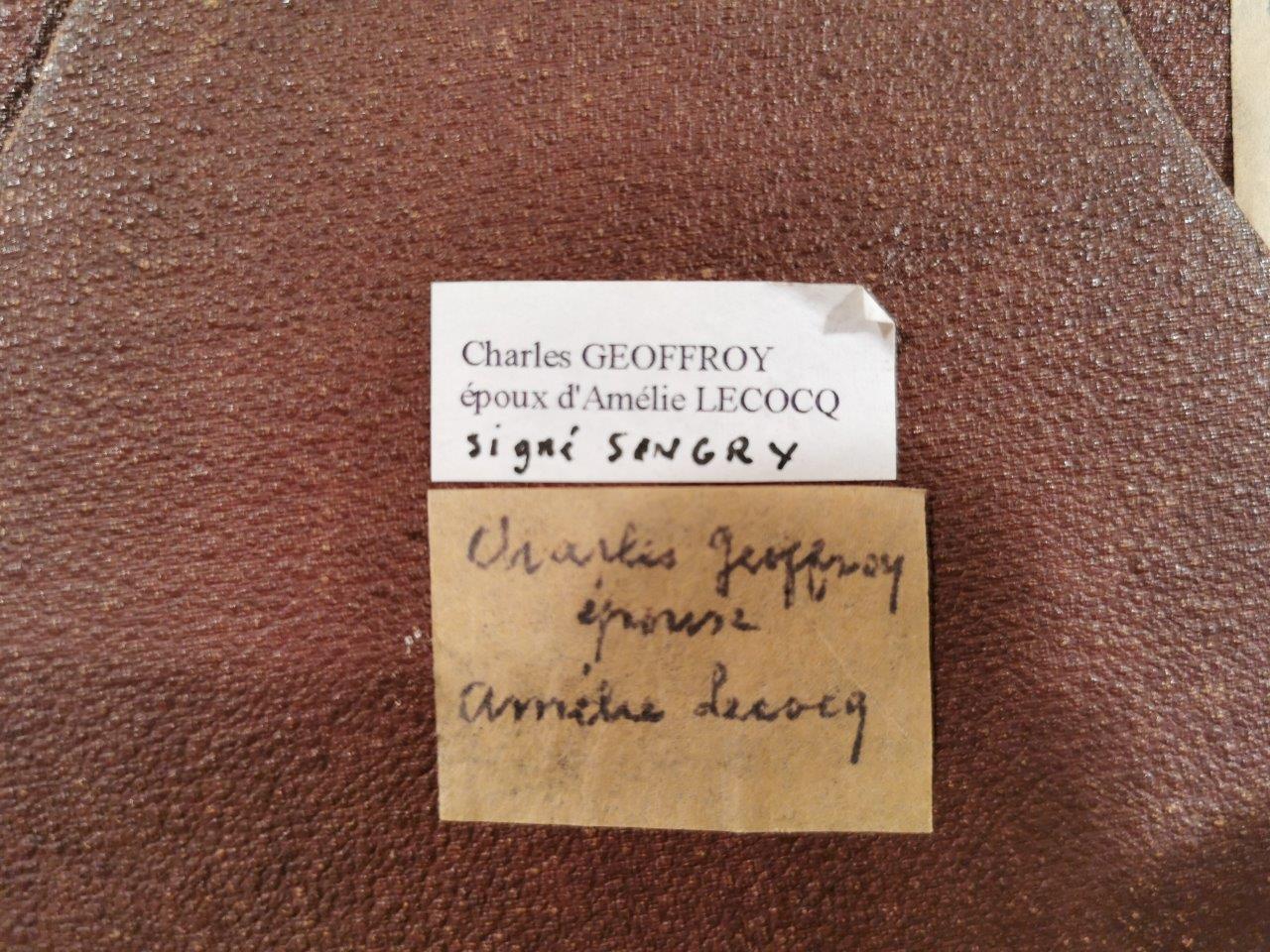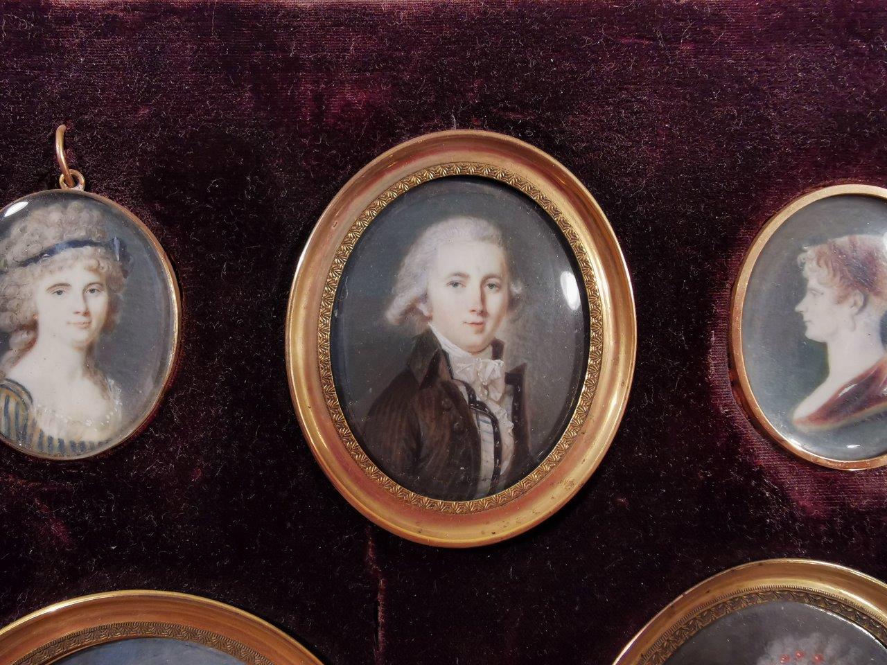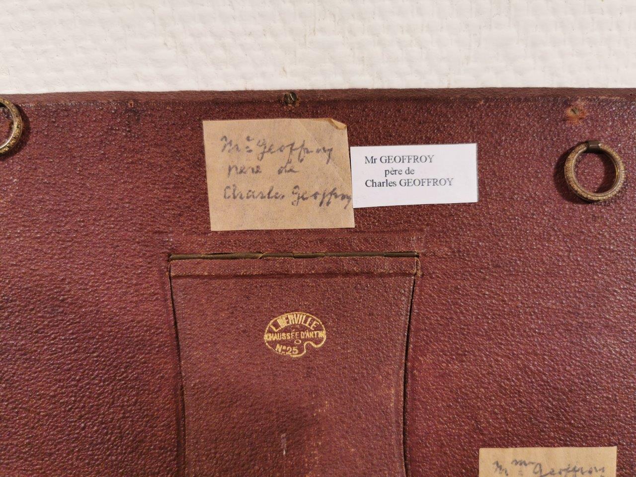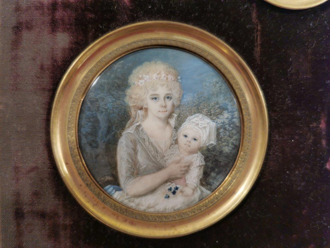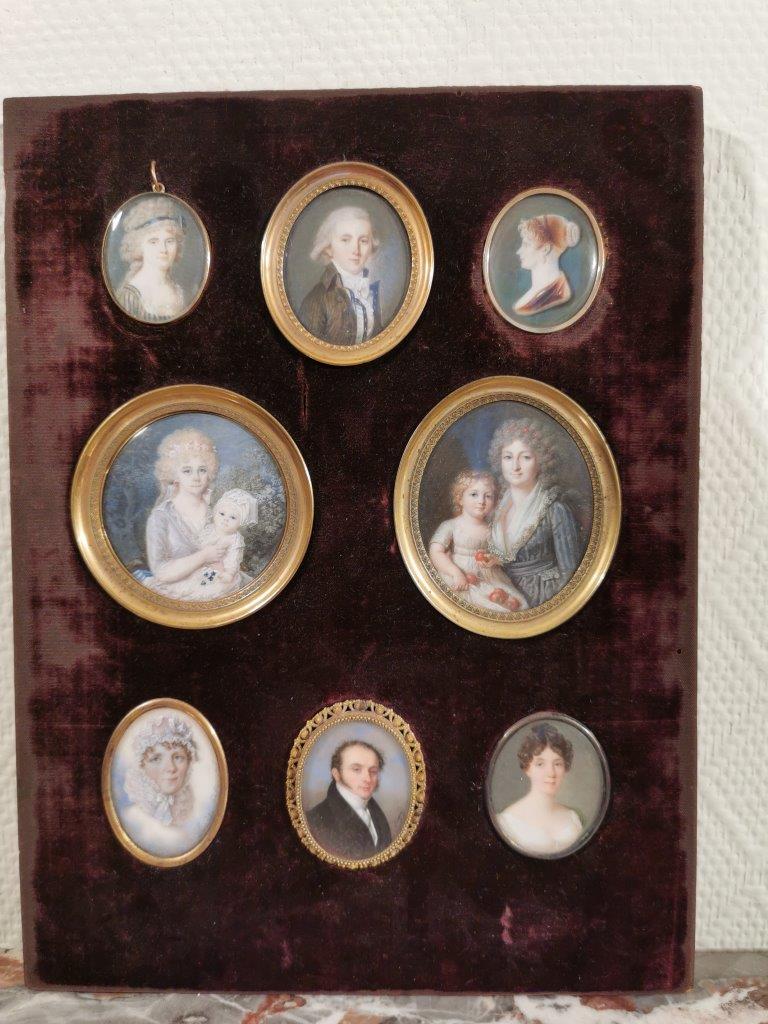 HUIT MINIATURES de la famille de Charles et Amélie GEOFFROY réunies dans un encadrement fondé d'un velours cramoisi, certaines signées "SINGRY" ou "BOUDIN". En haut les parents de Charles Geofffroy, au centre Mme Geoffroy avec dans ses bras la future madame Blangini, ainsi que Marie-Claude Lecocq et sa fille Mme Compans ou Mme Ruty, e bas Charles Geoffroy et son épouse Amélie née Lecocq pendant sa dernière maladie.