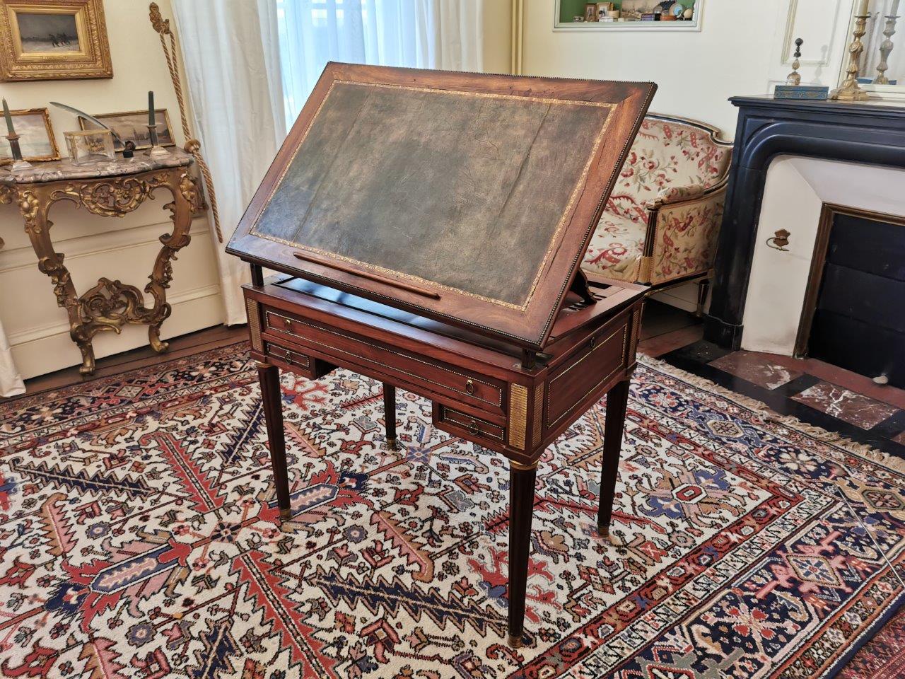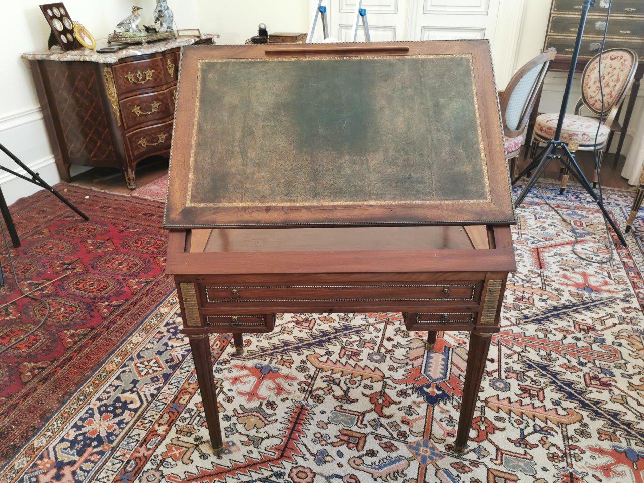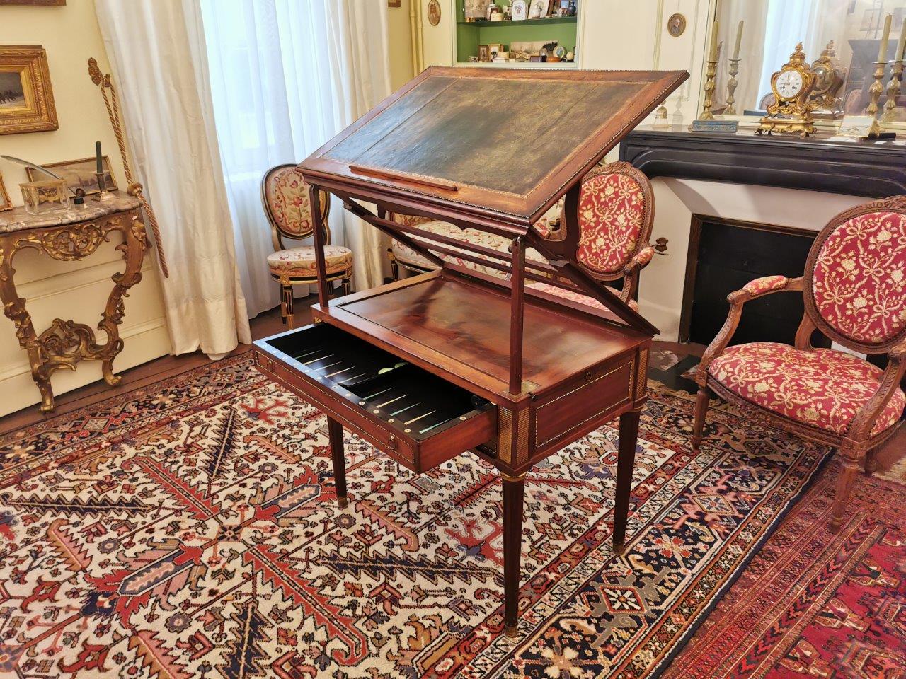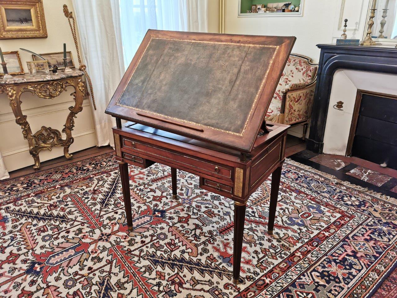 Le plateau, foncé d'un cuir décoré à la roulette, est à double inclinaisons : d'une part pupitre et d'autre part équipée d'un système mécanique à crémaillère pour monter jusqu'à hauteur des yeux d'un homme.