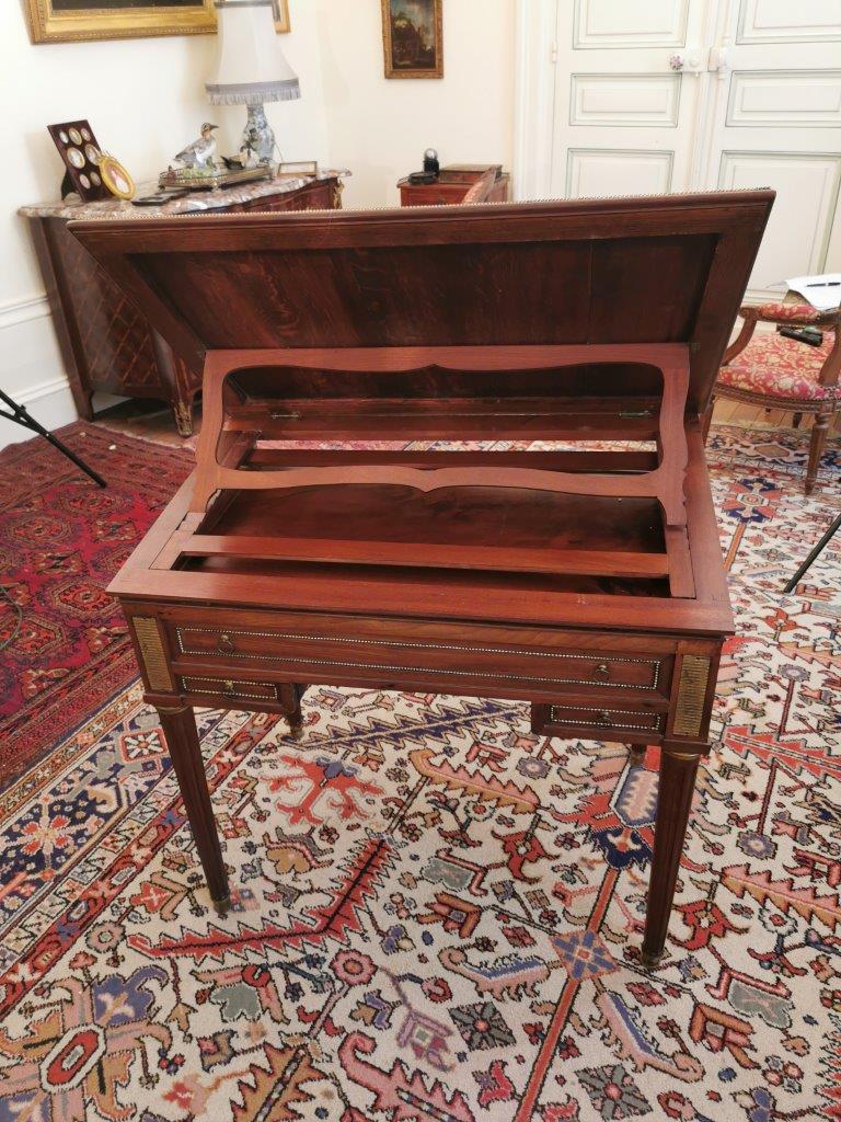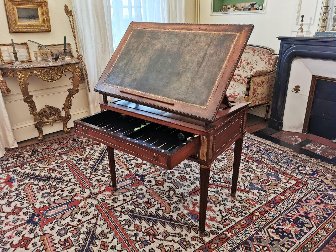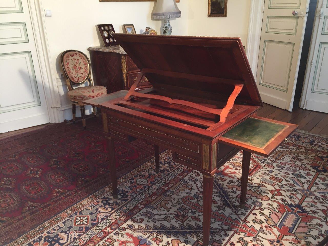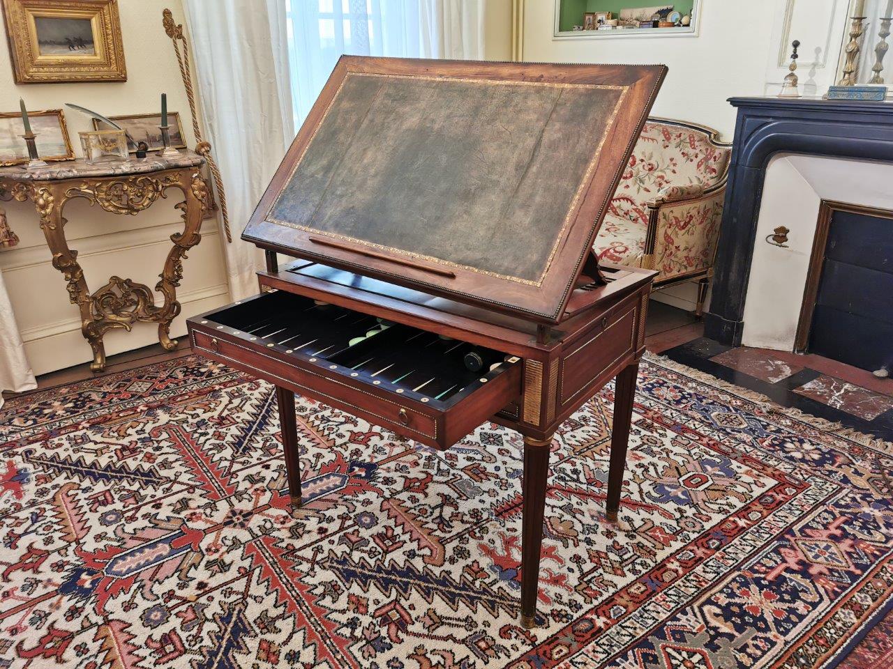 Le plateau, foncé d'un cuir décoré à la roulette, est à double inclinaisons : d'une part pupitre et d'autre part équipée d'un système mécanique à crémaillère pour monter jusqu'à hauteur des yeux d'un homme.