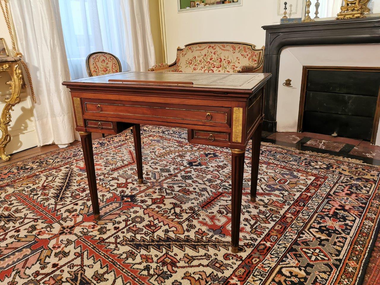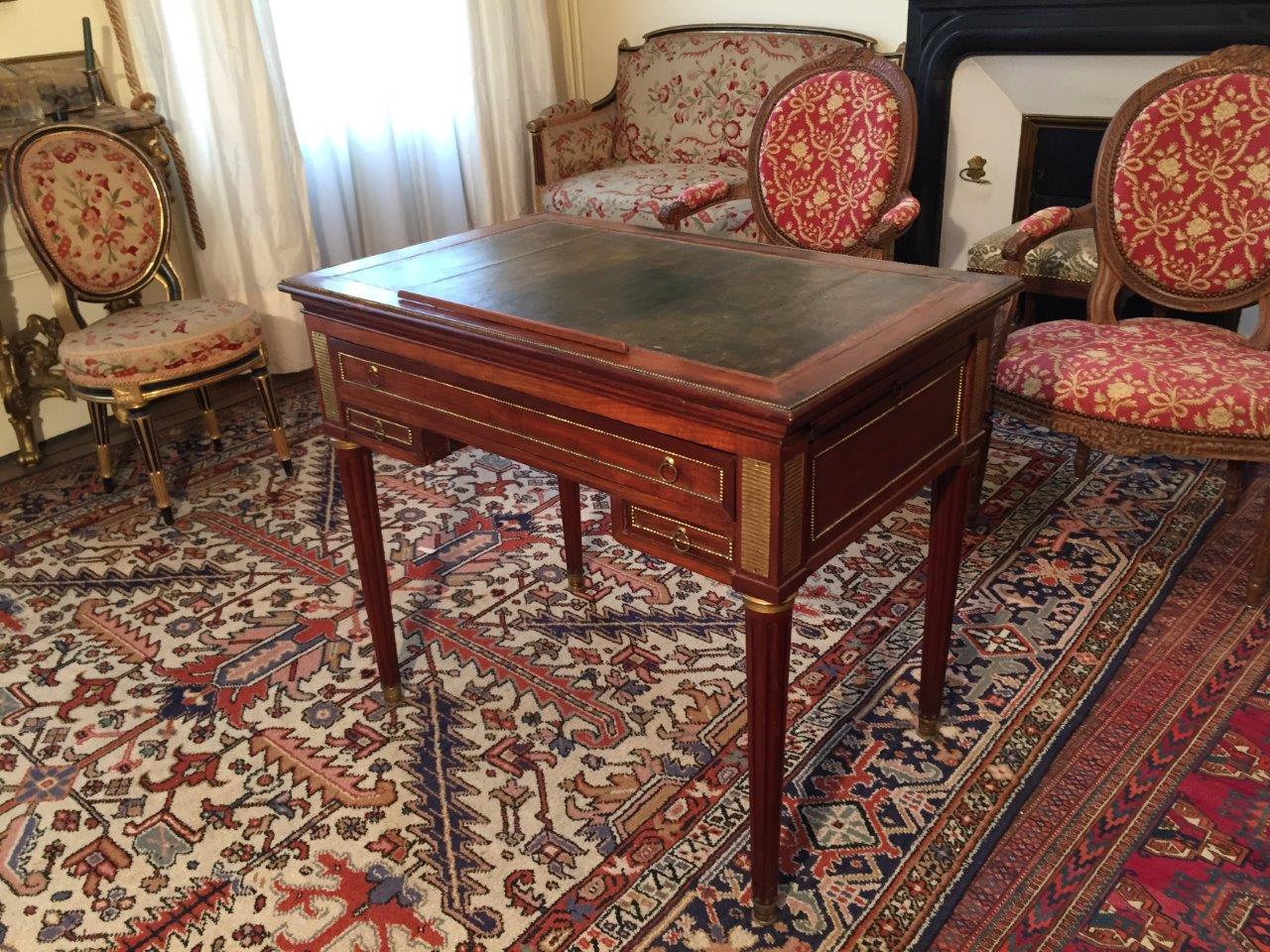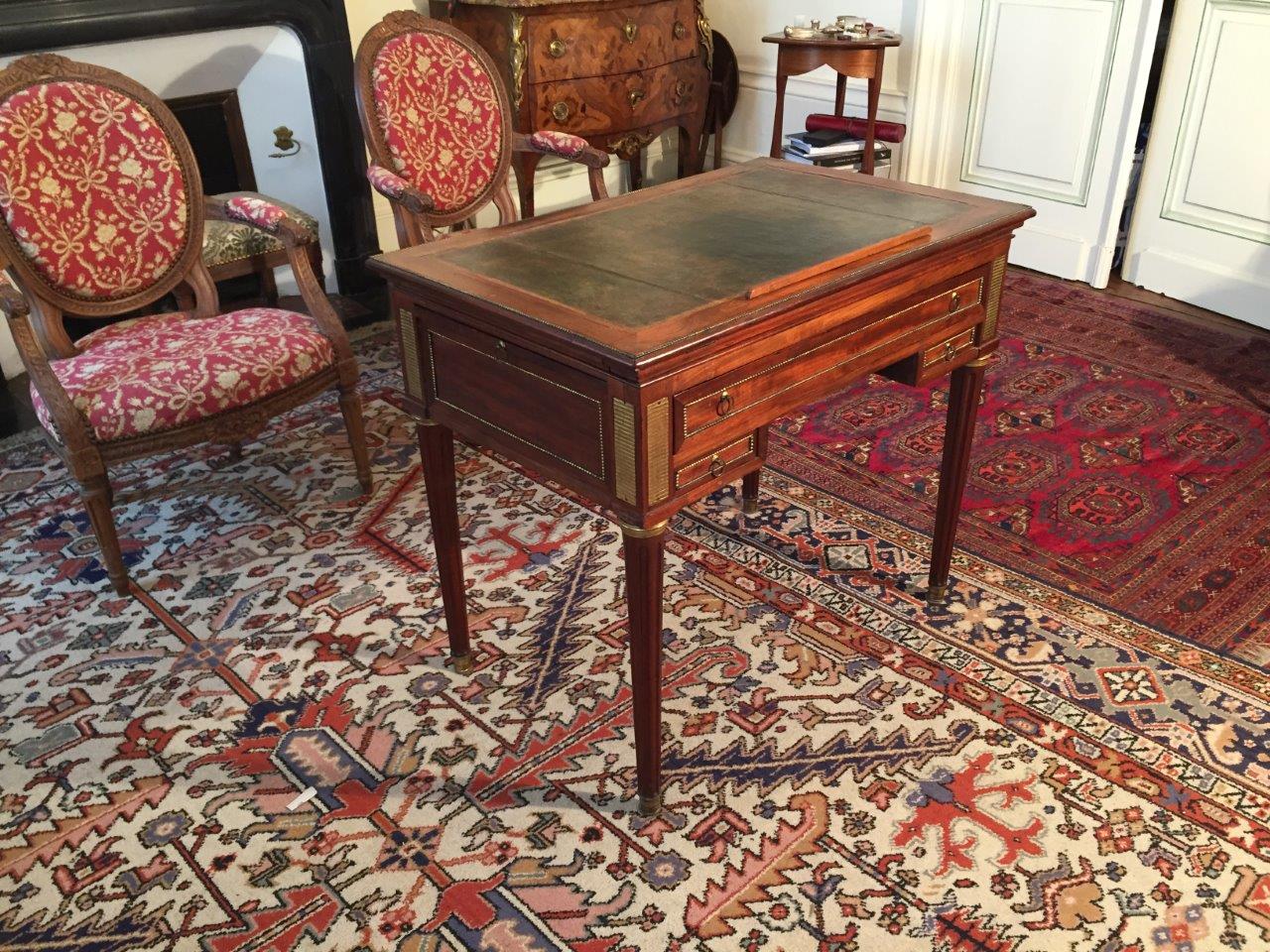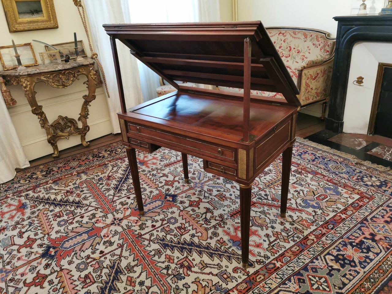 Le plateau, foncé d'un cuir décoré à la roulette, est à double inclinaisons : d'une part pupitre et d'autre part équipée d'un système mécanique à crémaillère pour monter jusqu'à hauteur des yeux d'un homme.