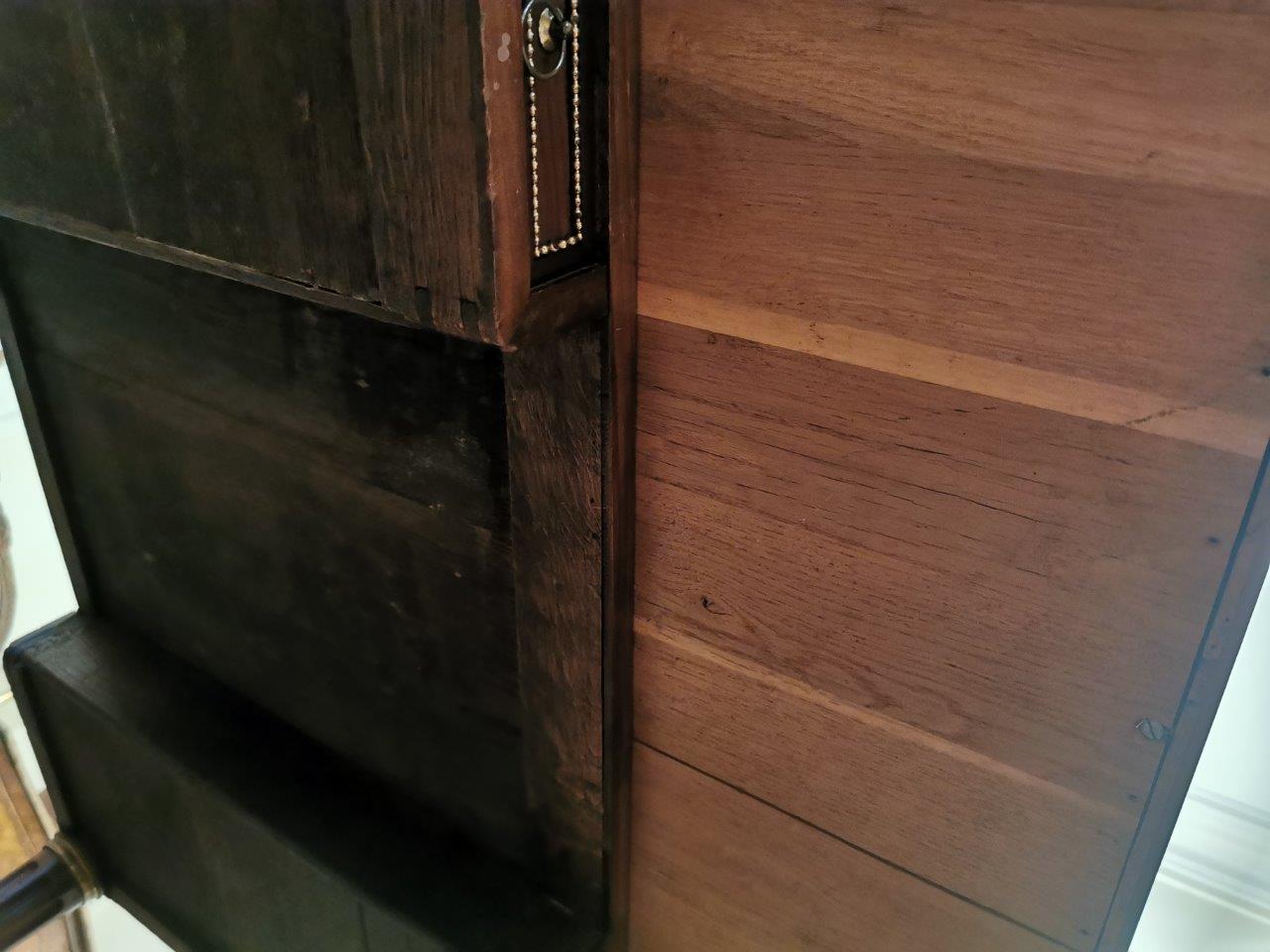 La ceinture ouvre par trois tiroirs sur deux rangs et deux tablettes latérales ; le tiroir central a été aménagé postérieurement pour accueillir un plateau de Backgammon.