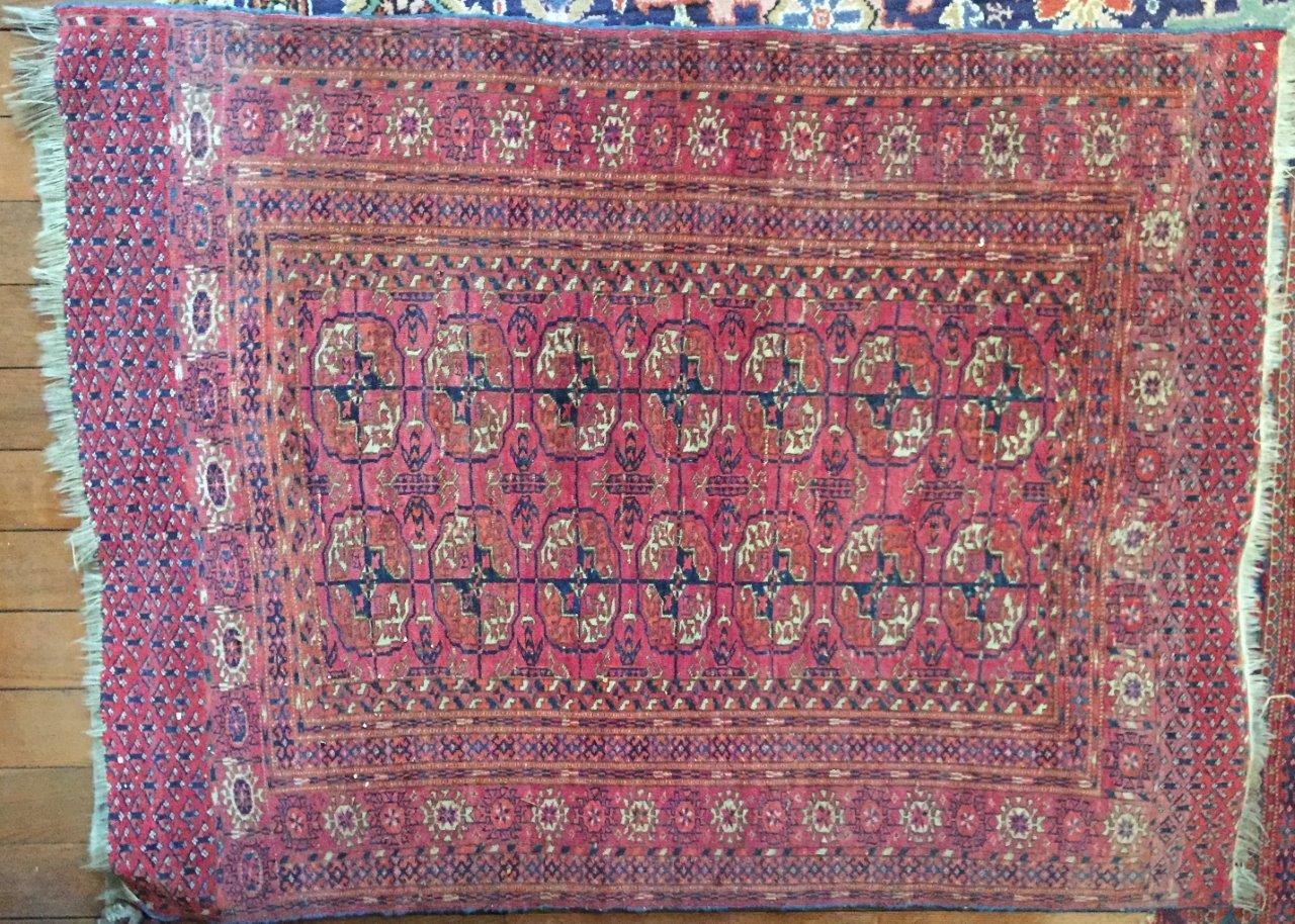 TAPIS Boukhara, fond rouge, décor de deux rangées de sept guls, multiple bordures.