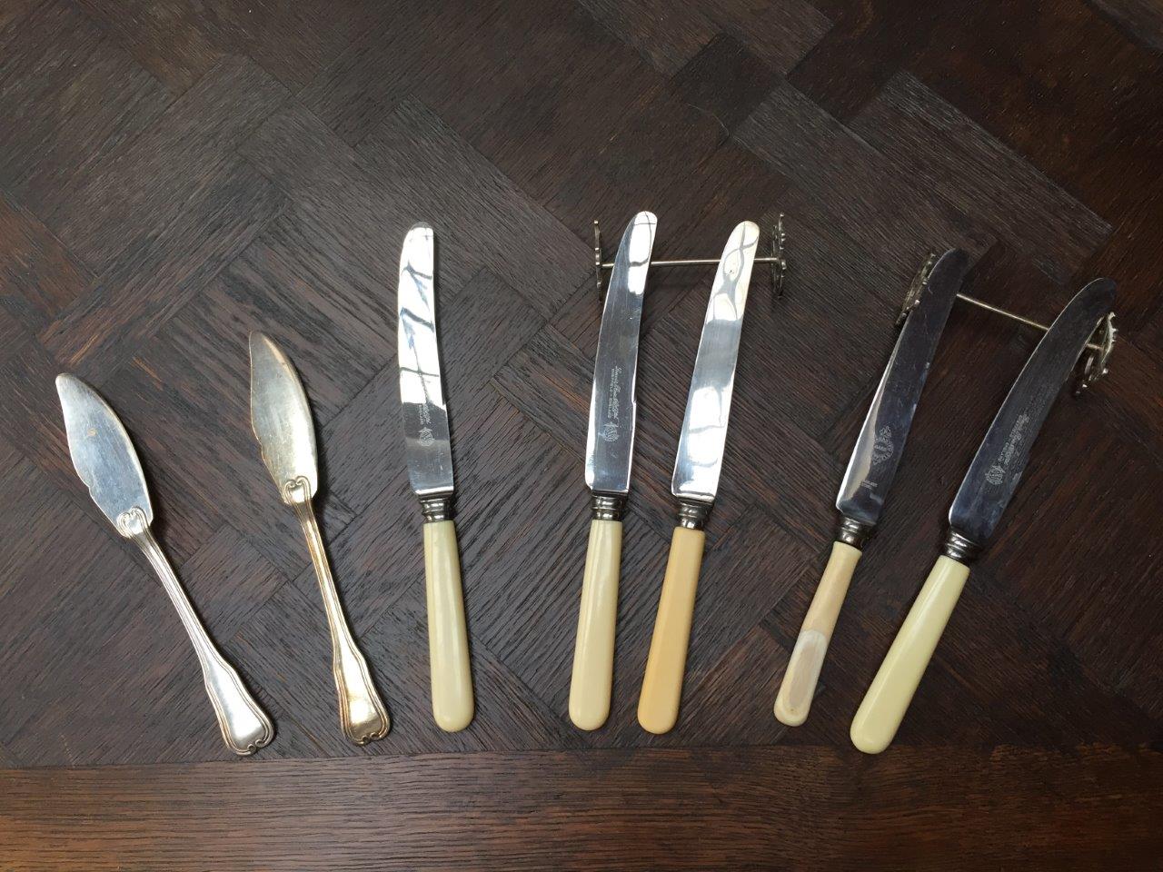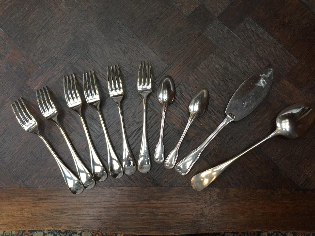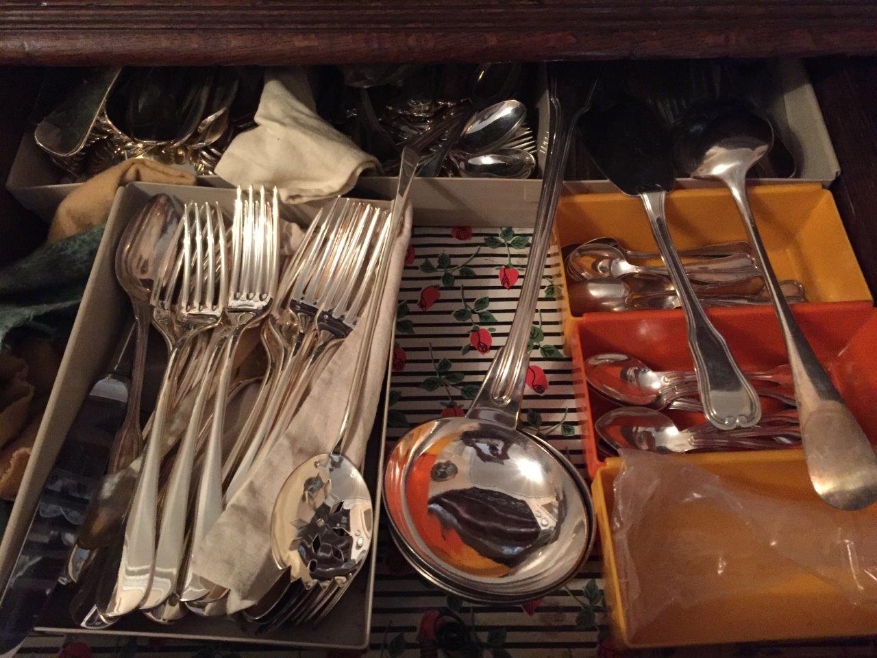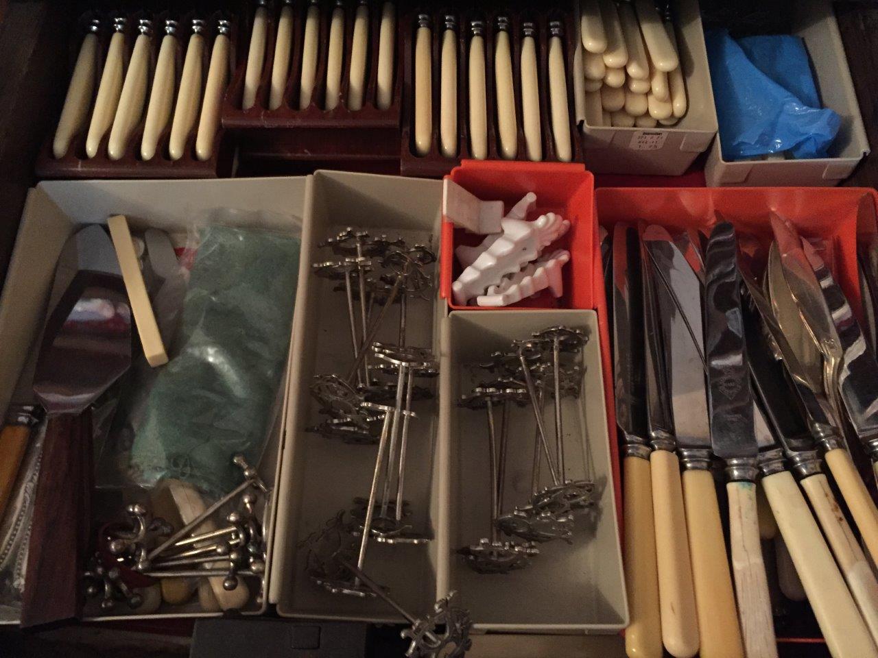 ENSEMBLE de pièces en MÉTAL ARGENTÉ dans les tiroirs du BUFFET du SALON comprenant notamment : une SUITE de COUTEAUX au manche à l'imitation de la corne, PORTE-COUTEAUX, PASSE-THÉ, COUVERTS À POISSON, PELLE À GATEAU, SUITE de COUVERTS modèle uniplat, LOUCHES, PELLE à GATEAU, COUVERTS à DESSERT modèle filet contour.