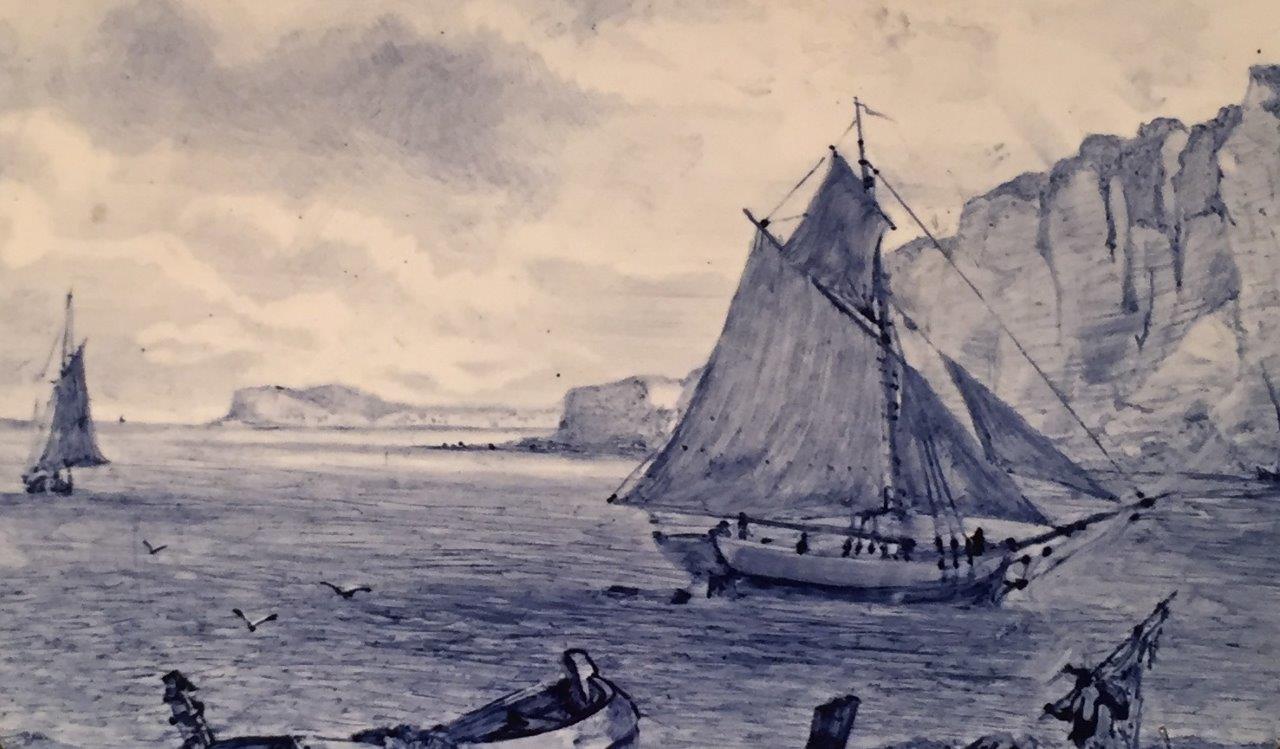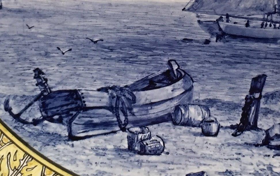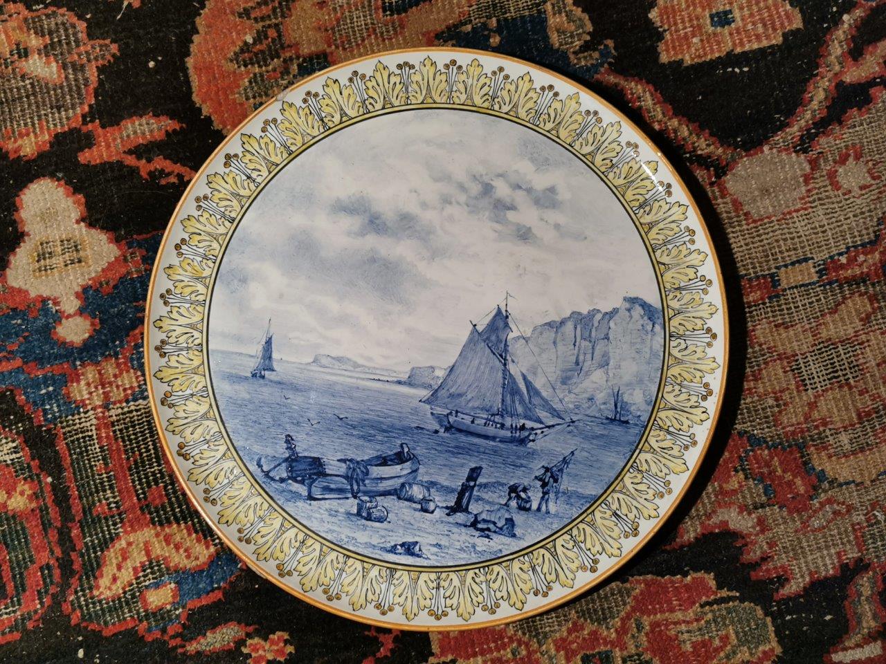 GIEN. L. ROBERT. PLAT en faïence émaillée représentant une marine, la bordure ornée d'une frise de feuilles d'acanthe.
