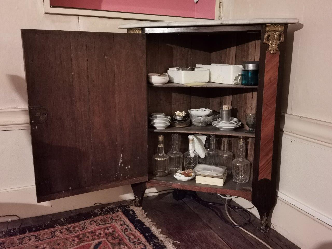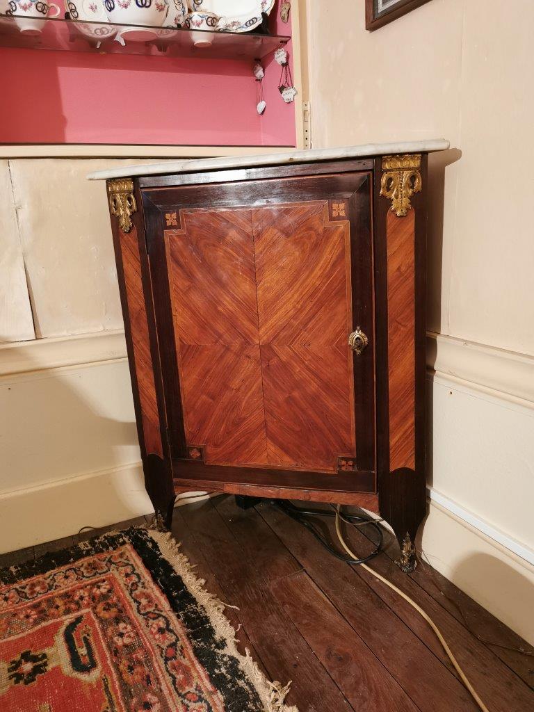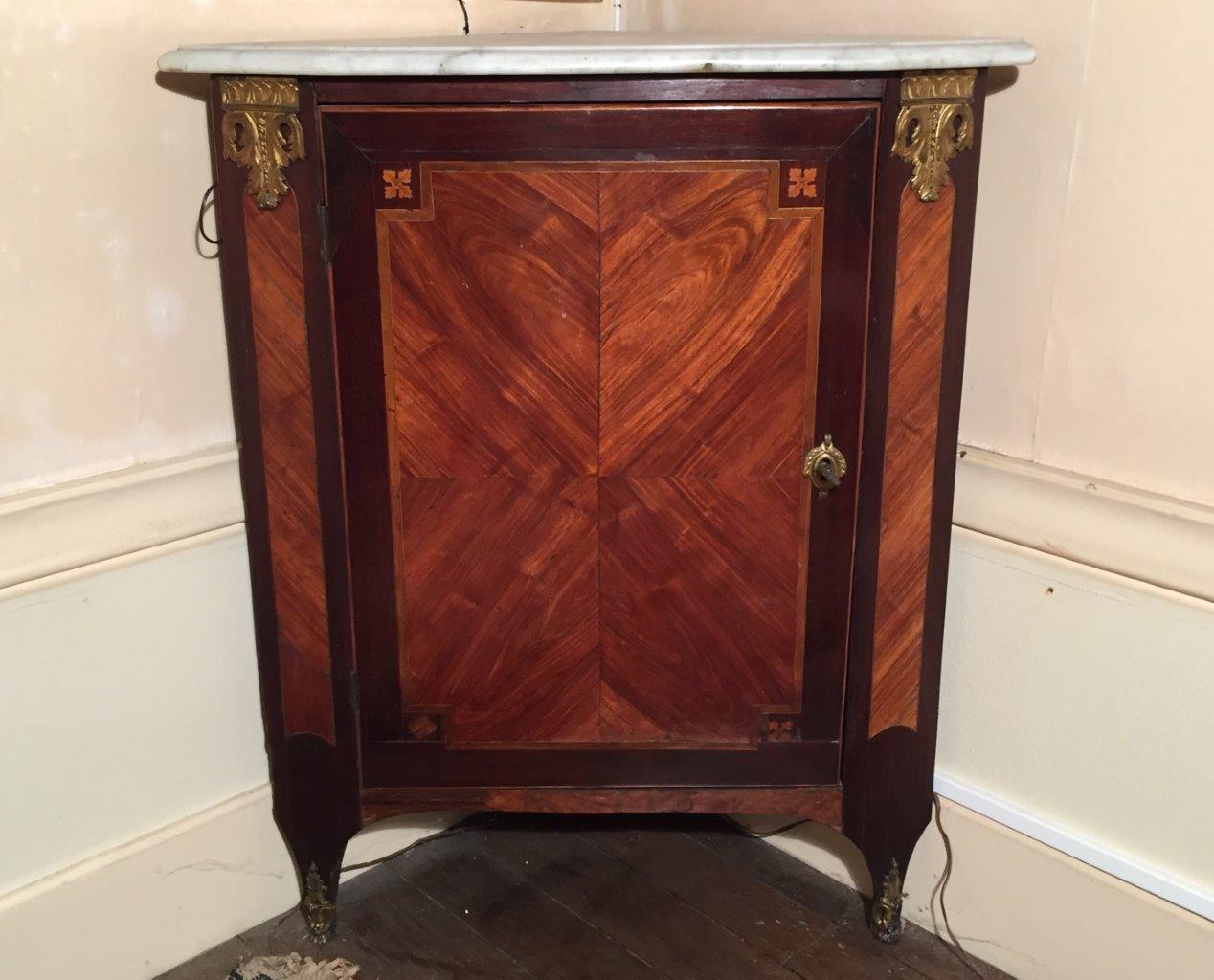 ENCOIGNURE en bois de placage, décor marqueté de frisage. Ornementation de bronze doré comme entrée de serrure et sabots.