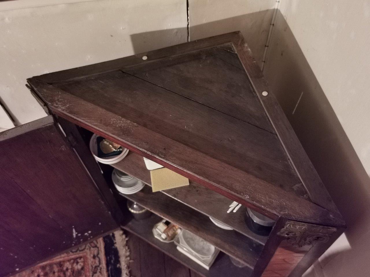 ENCOIGNURE en bois de placage, décor marqueté de frisage. Ornementation...
