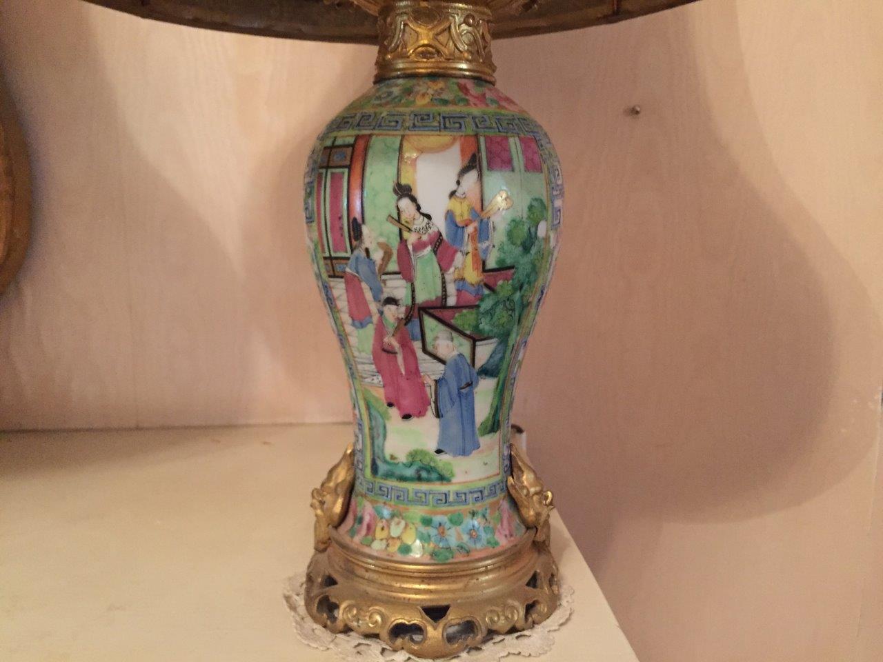 CHINE, Canton. Deux VASES balustres en porcelaine et monture en bronze doré. Transformés en lampe.