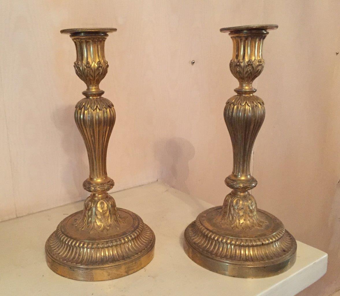 Paire de FLAMBEAUX en bronze doré, le binet cannelé à décor végétal, des feuilles d'eau coiffent le fût se terminant par une bague à feuilles de laurier, la base à décor de feuilles d'acanthe et godrons.