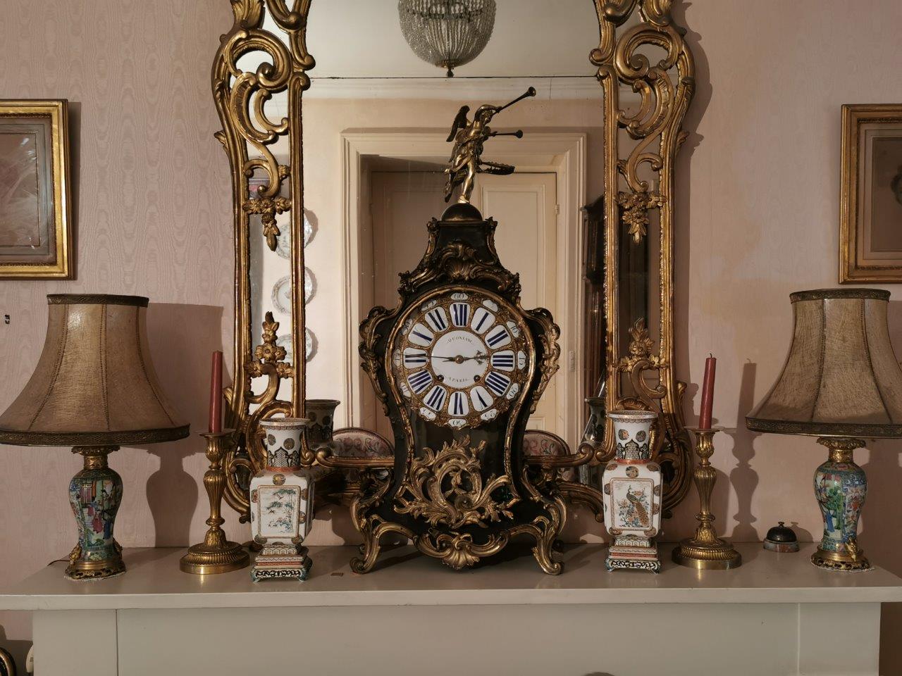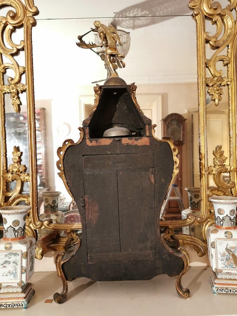 CARTEL en bois noirci et bronze doré, l'amortissement à décor d'une figure de la Renommée Le cadran à treize vingt-cinq plaques émaillées sur fond de laiton doré, indique les heures par des chiffres romains, les minutes par des chiffres arabes.
