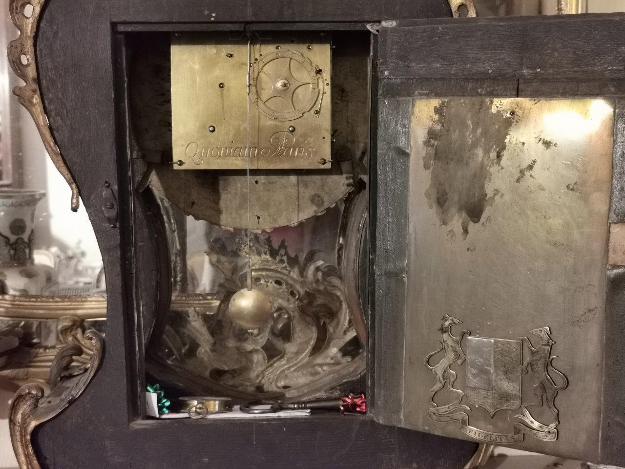 CARTEL en bois noirci et bronze doré, l'amortissement à décor...
