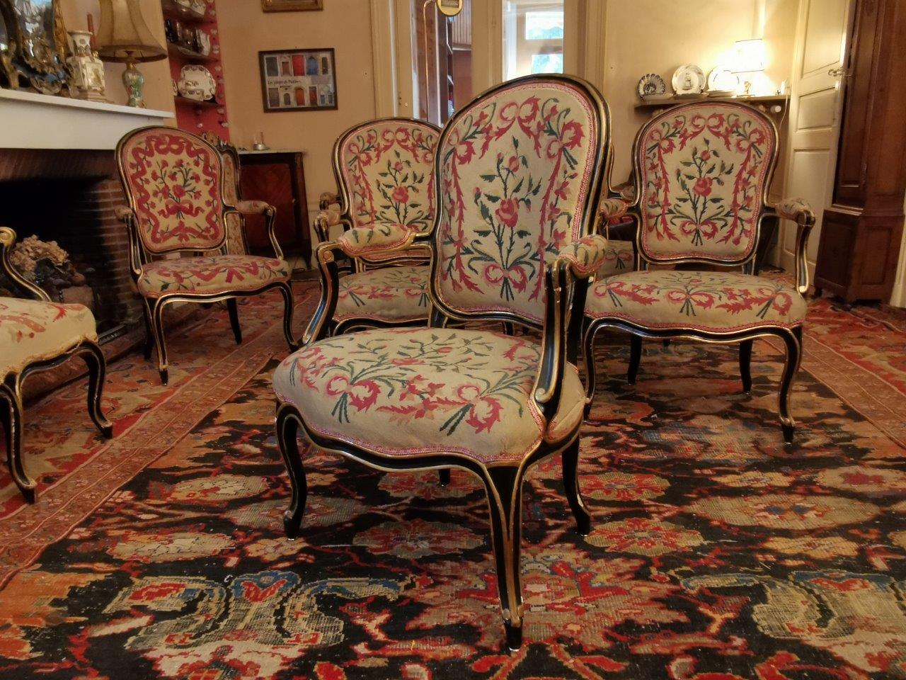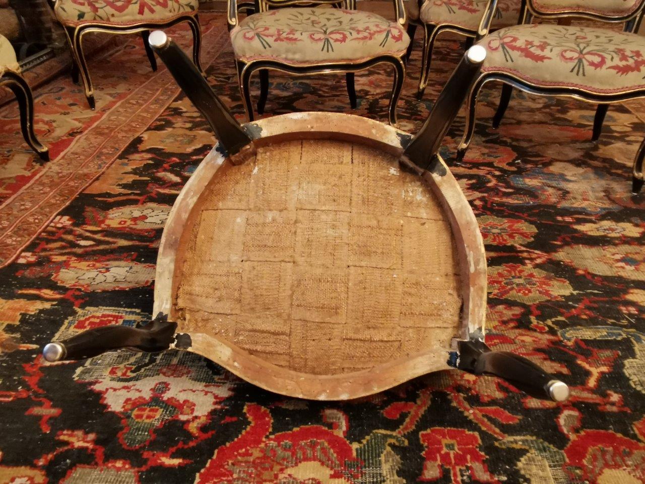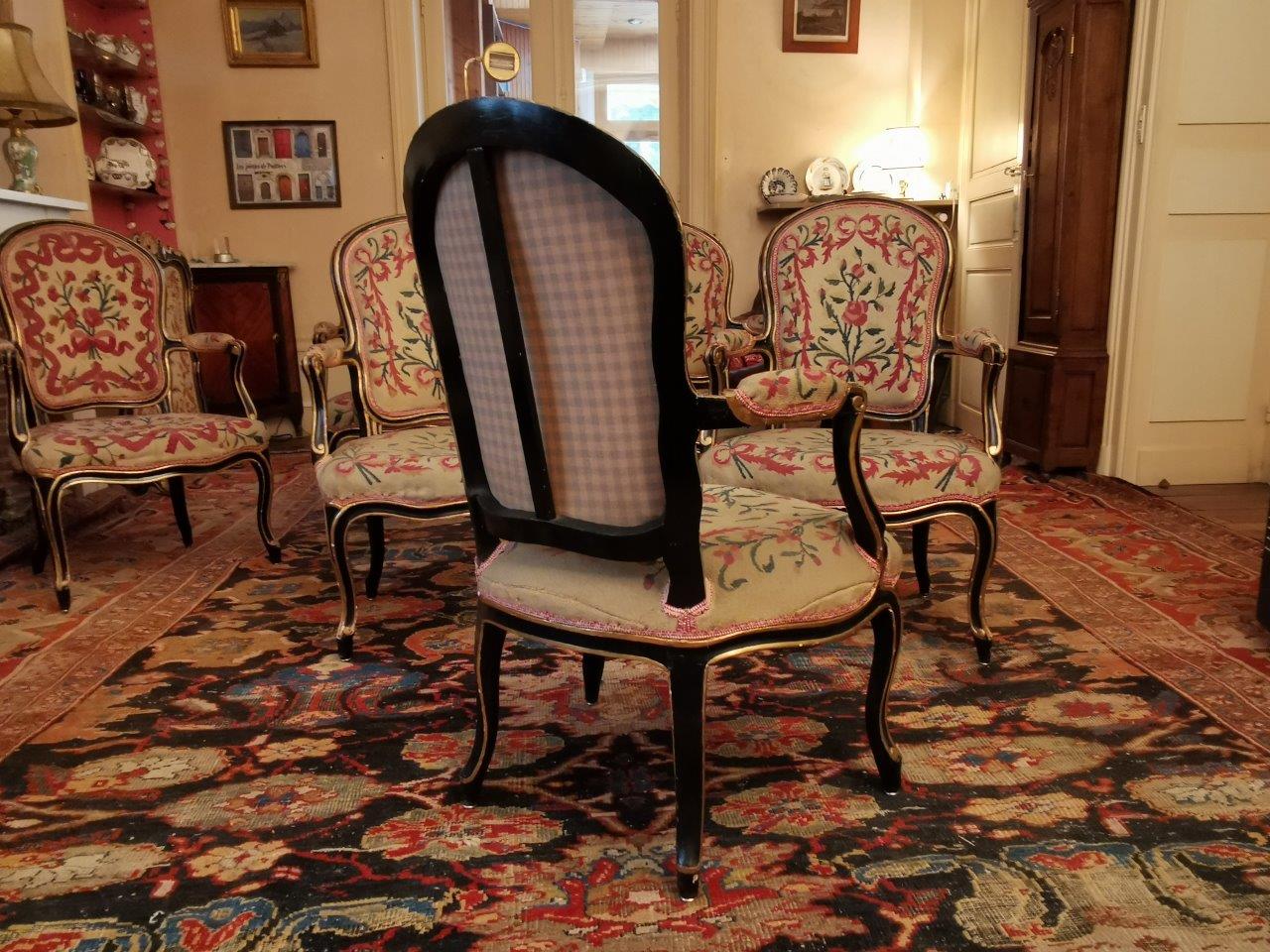 SALON comprenant UN CANAPÉ, HUIT FAUTEUILS en bois mouluré laqué noir et doré. Les sièges de forme mouvementée, le dossier violoné, les accotoirs à manchettes, les pieds galbés.