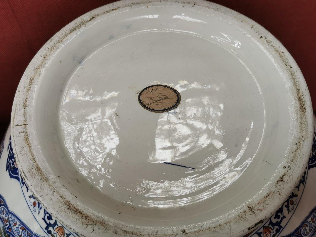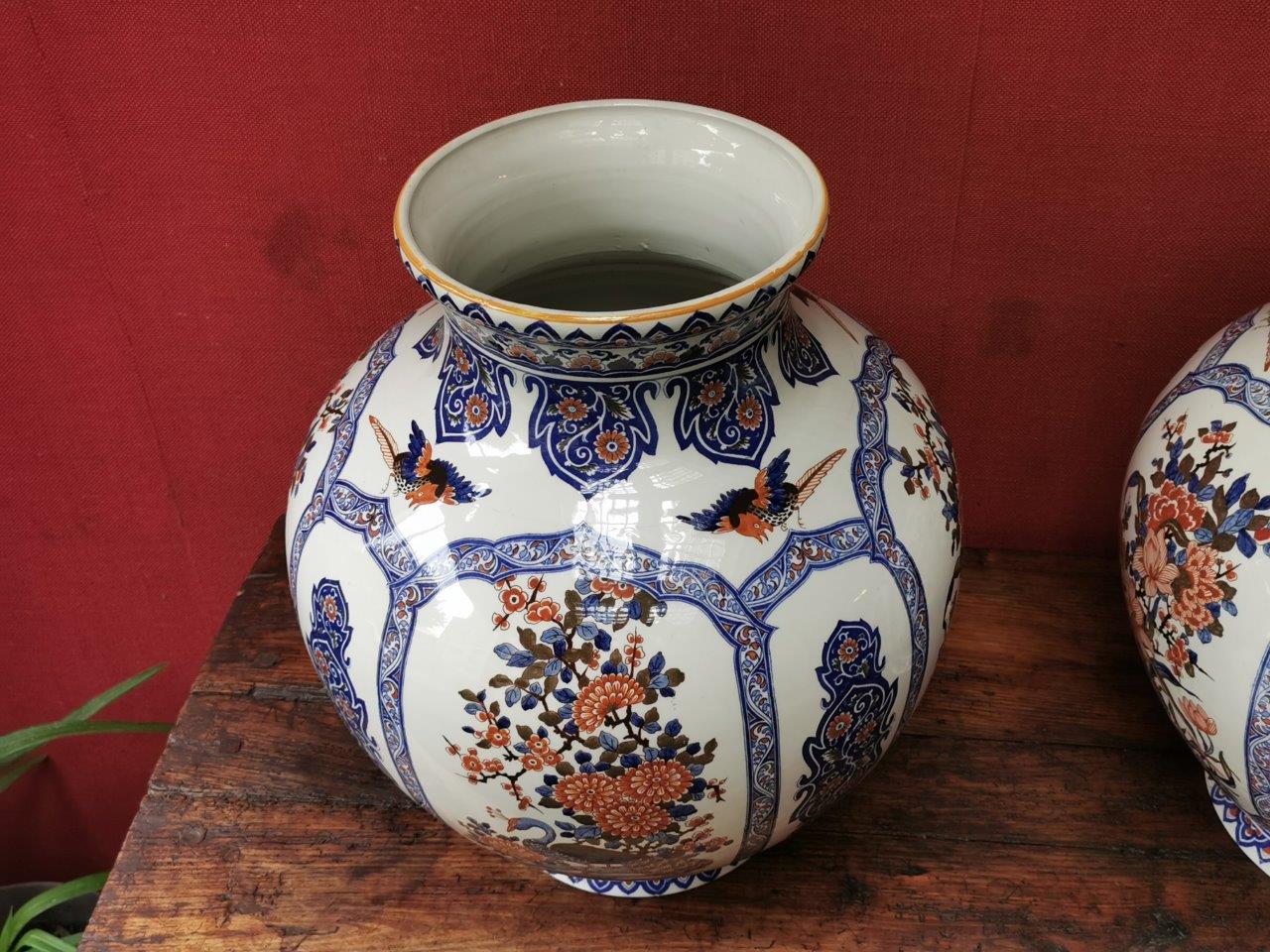 GIEN. PAIRE de grands VASES au décor de pivoines et volatiles inscrits dans des cartouches arabisants.