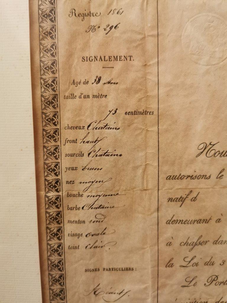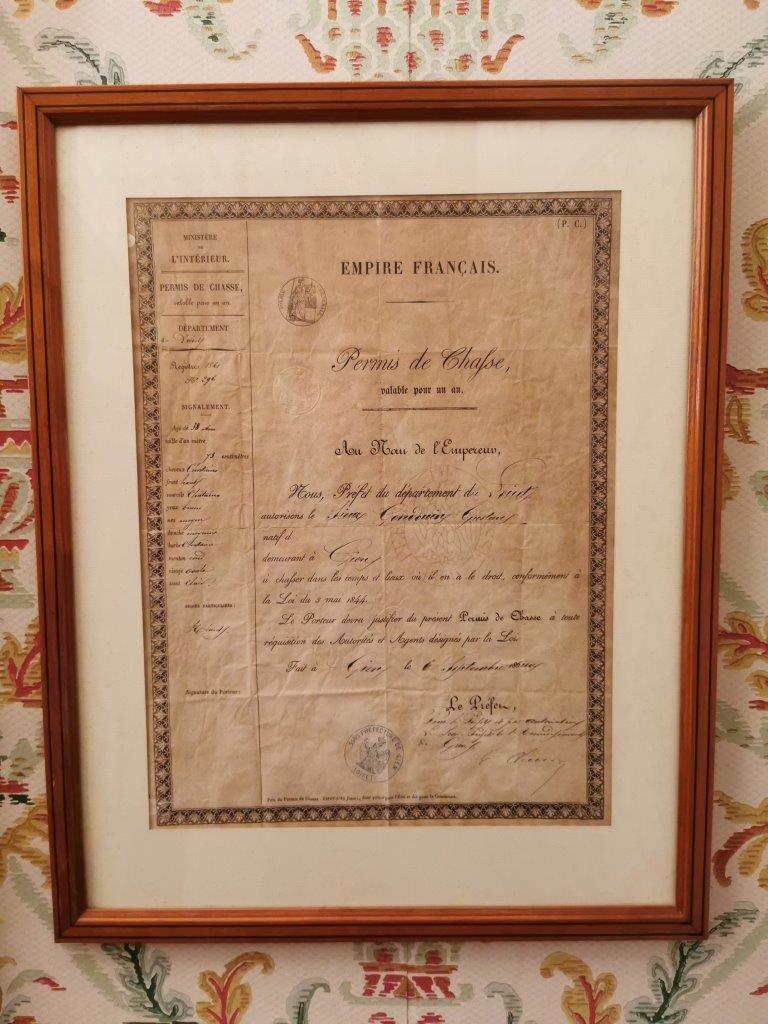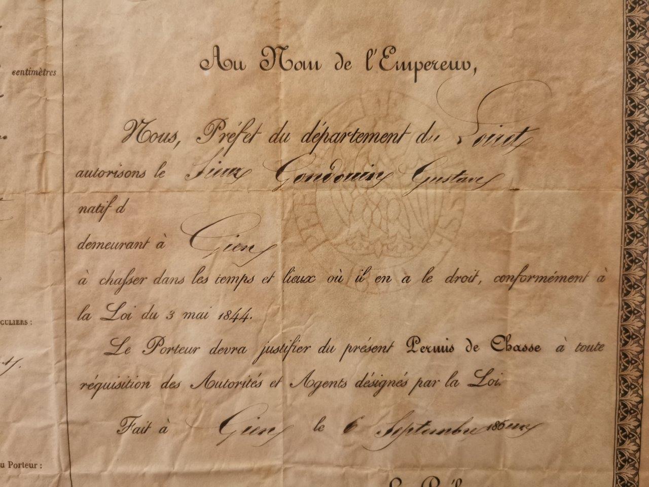 PERMIS de CHASSE de GUSTAVE GONDOUIN établie « au nom de l’Empereur » en 1864 par le Prefet du Loiret.