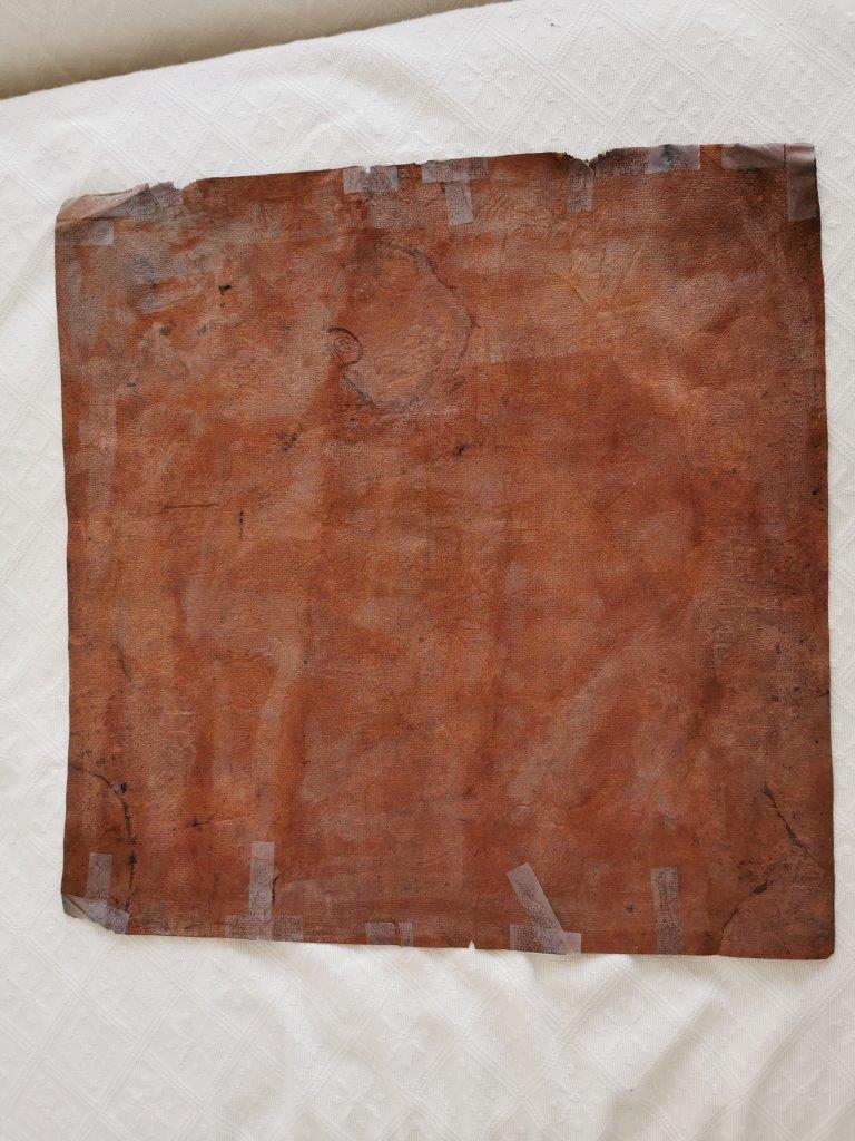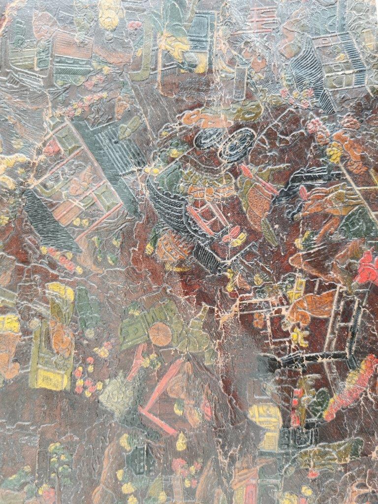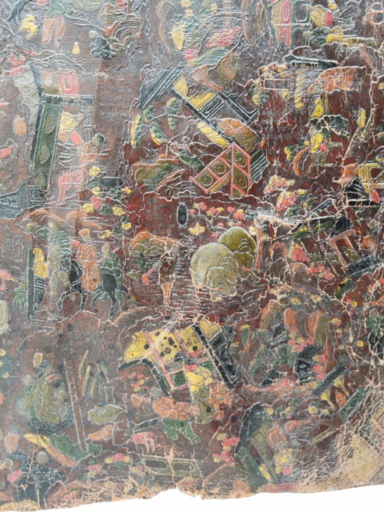 CHINE ? Plaque en cuir repoussé polychrome à décor de scènes animées.