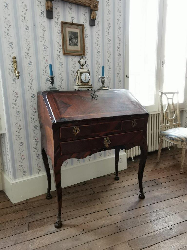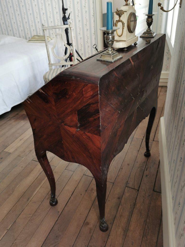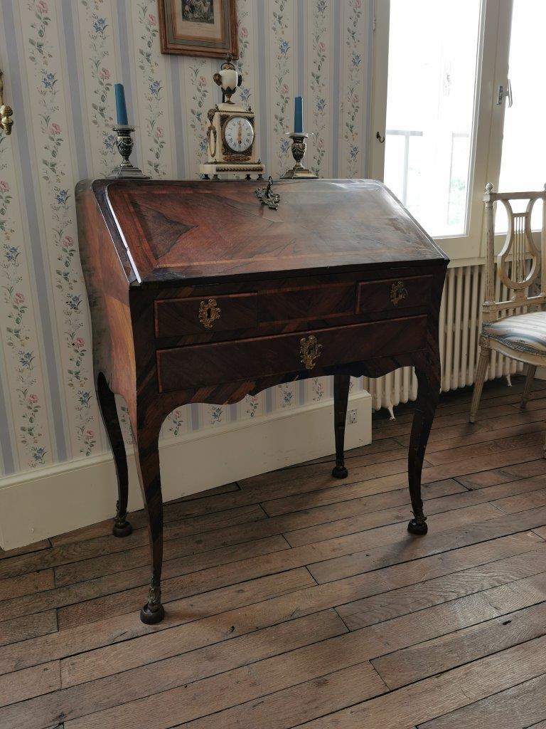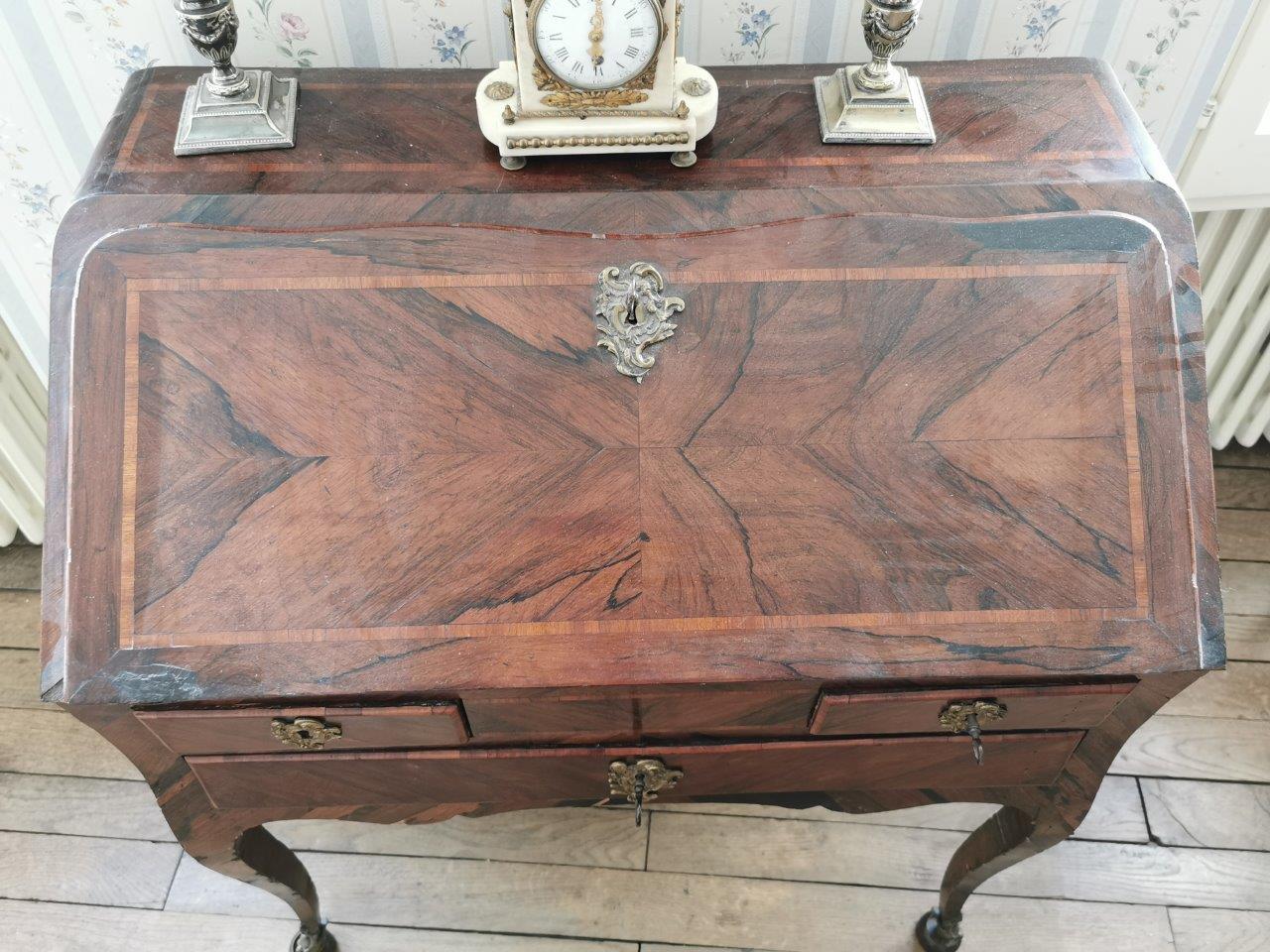 Charmant BUREAU DOS d’ÂNE galbé, marqueté toutes faces en palissandre, ouvrant par un abattant foncé d’un cuir et trois tiroirs en ceinture. L’intérieur dévoile quatre tiroirs et plusieurs compartiments dont un secret.