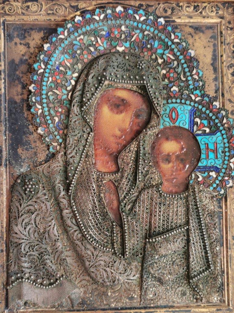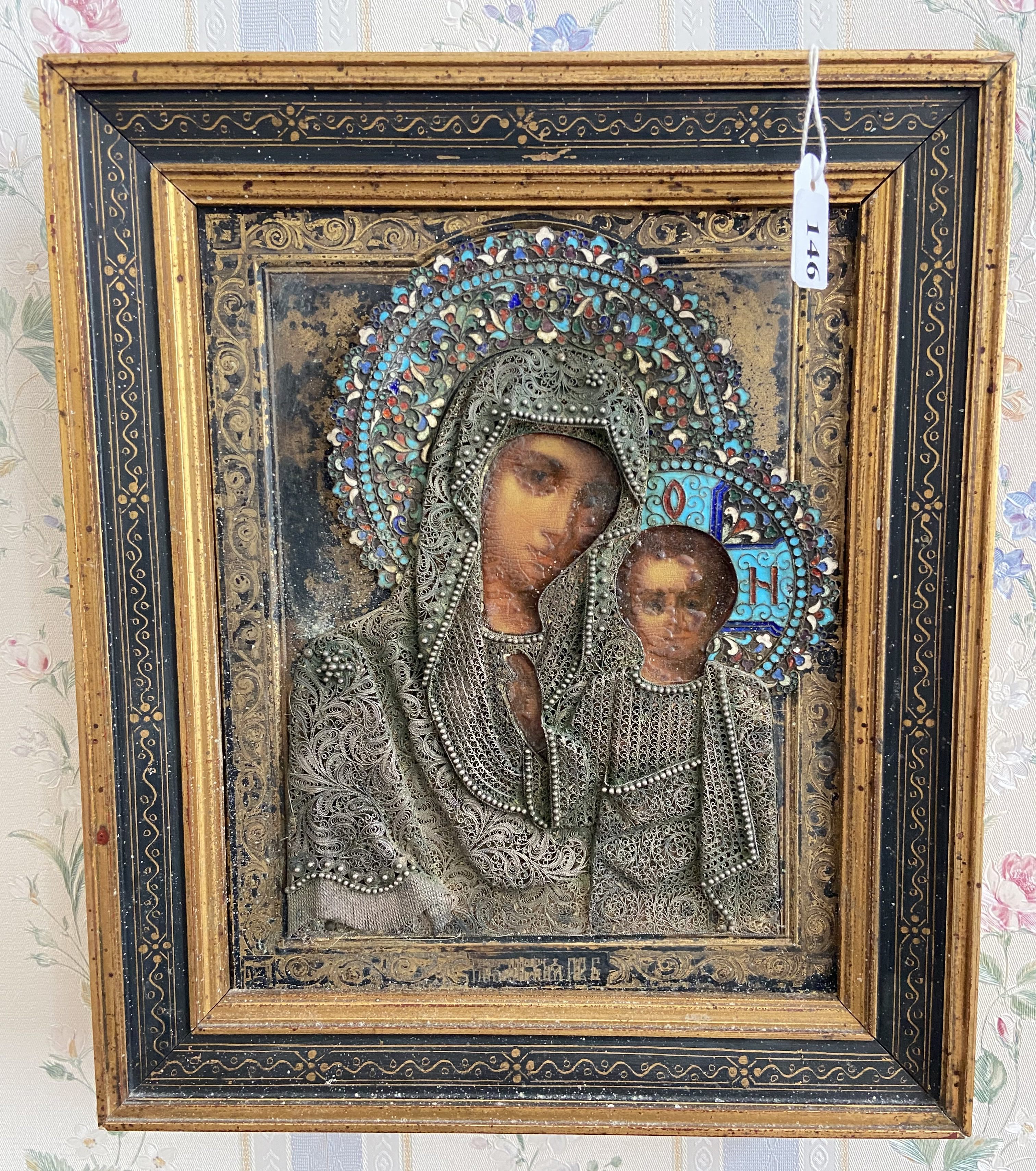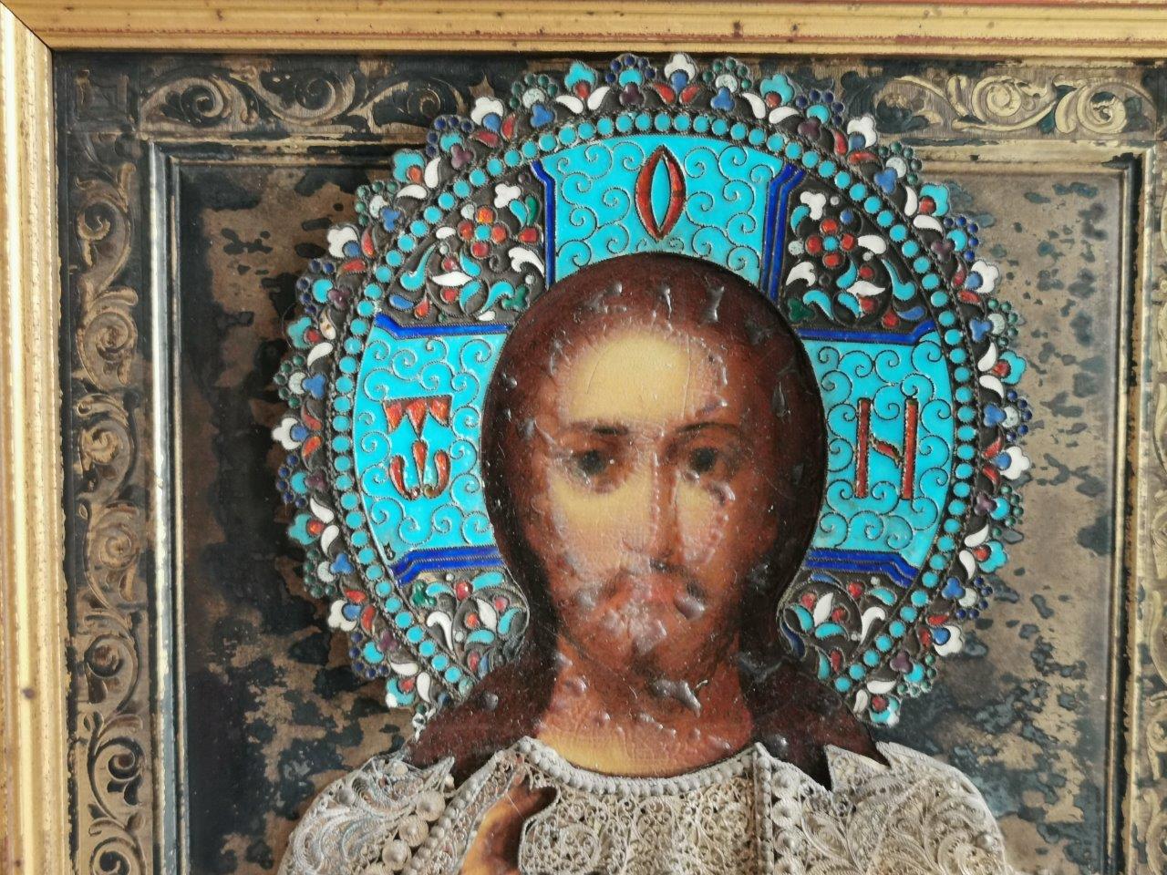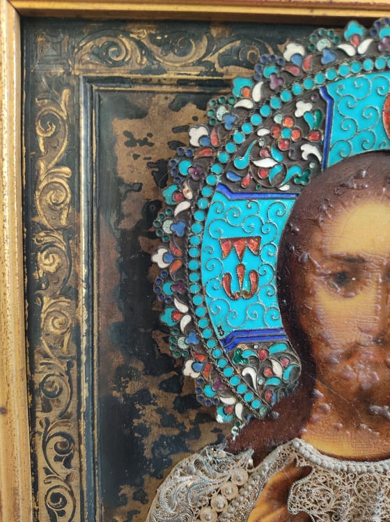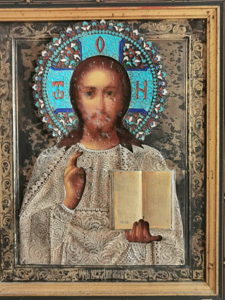 Paire huile sur panneau avec une riza en argent et émail cloisonné, dans un encadrement probablement postérieur.