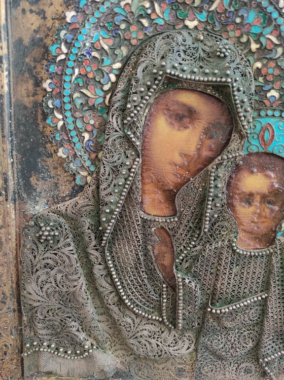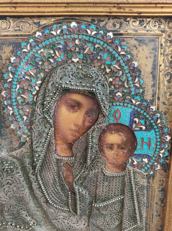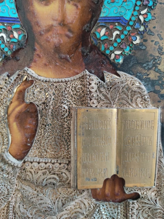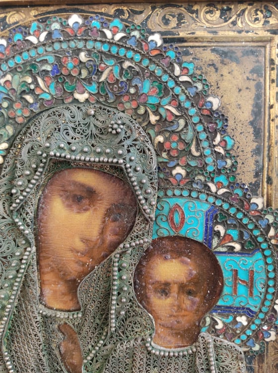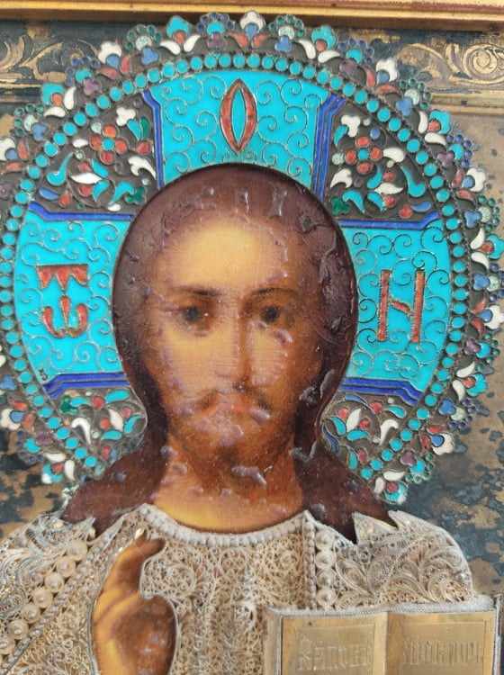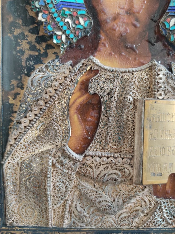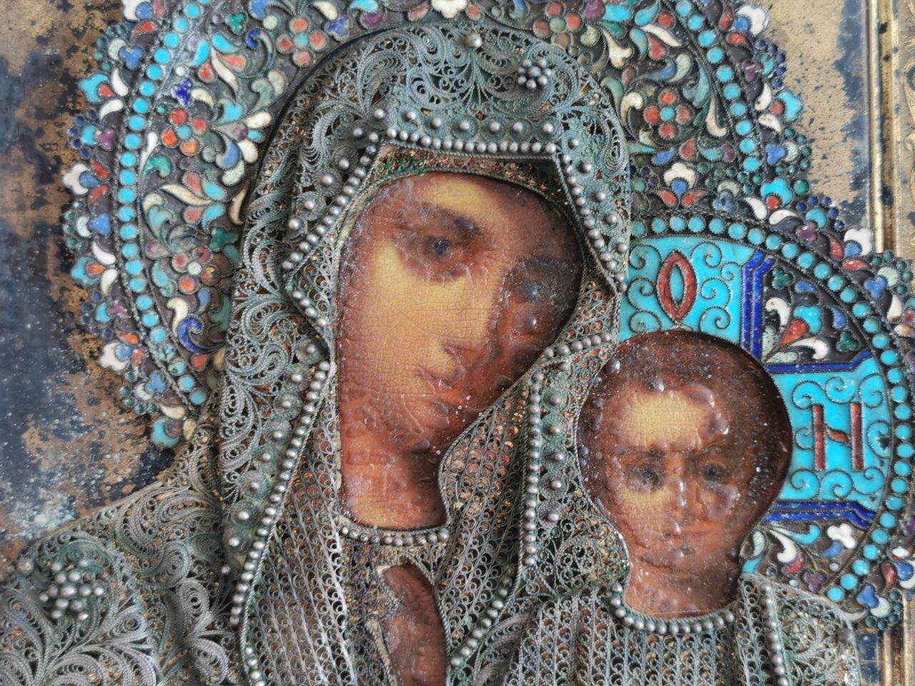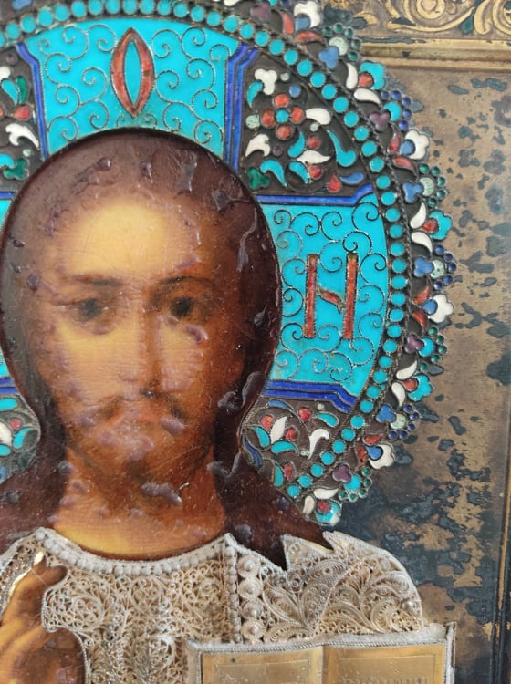 Paire huile sur panneau avec une riza en argent et émail cloisonné, dans un encadrement probablement postérieur.