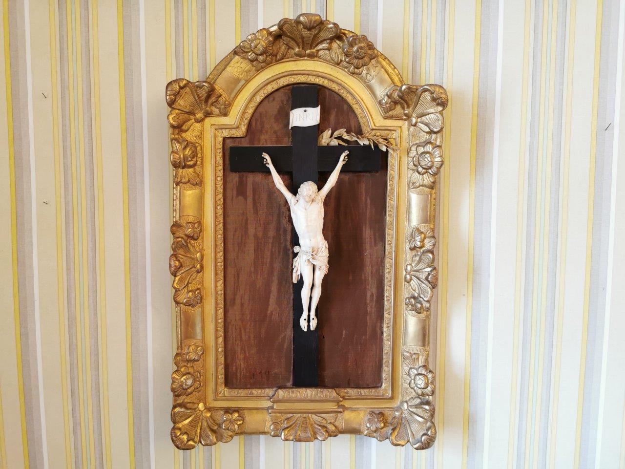 CRUCIFIX en ivoire sculpté sur une crois d’ébène dans un encadrement en bois sculpté et doré à motifs rocaille.