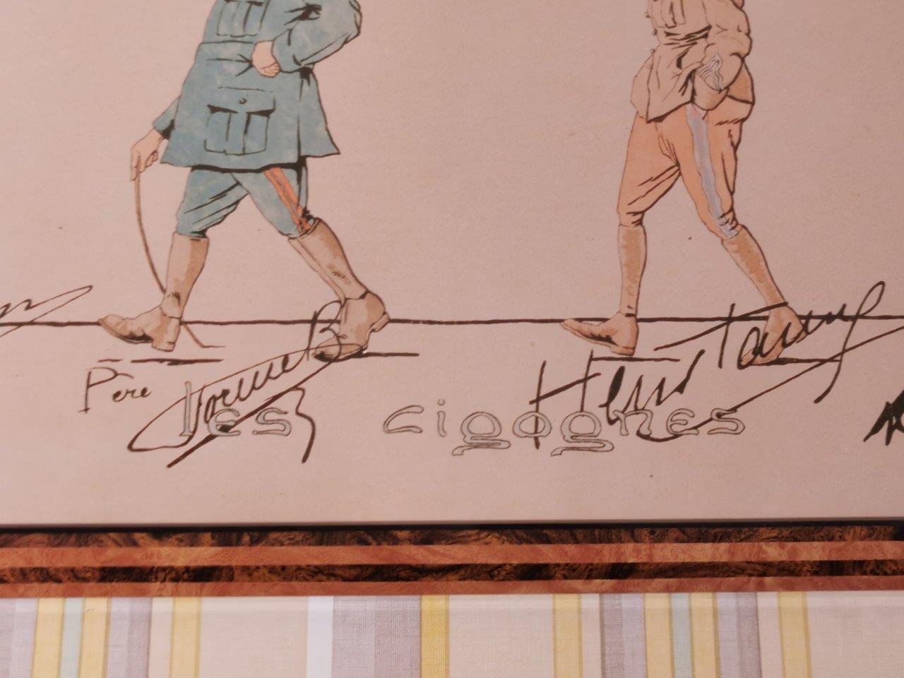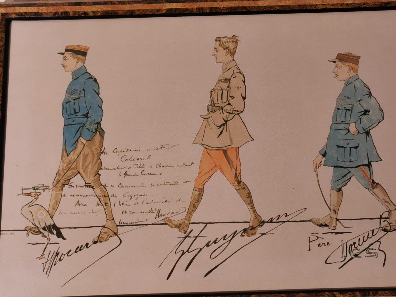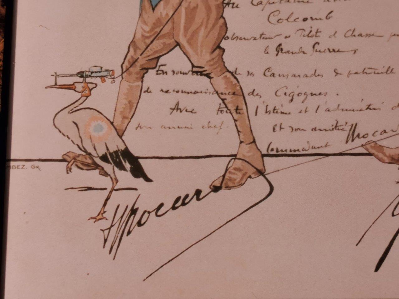 Reproduction d'après la lithographie éditée chez Devambez avec « Au capitaine aviateur Colcomb observateur et pilote de chasse pendant la grande guerre en souvenir des ses camarades et des patrouille de reconnaissance des Cigognes. Avec toute l’estime et l’admiration de son chef et son amitié. Commandant Brocard ».