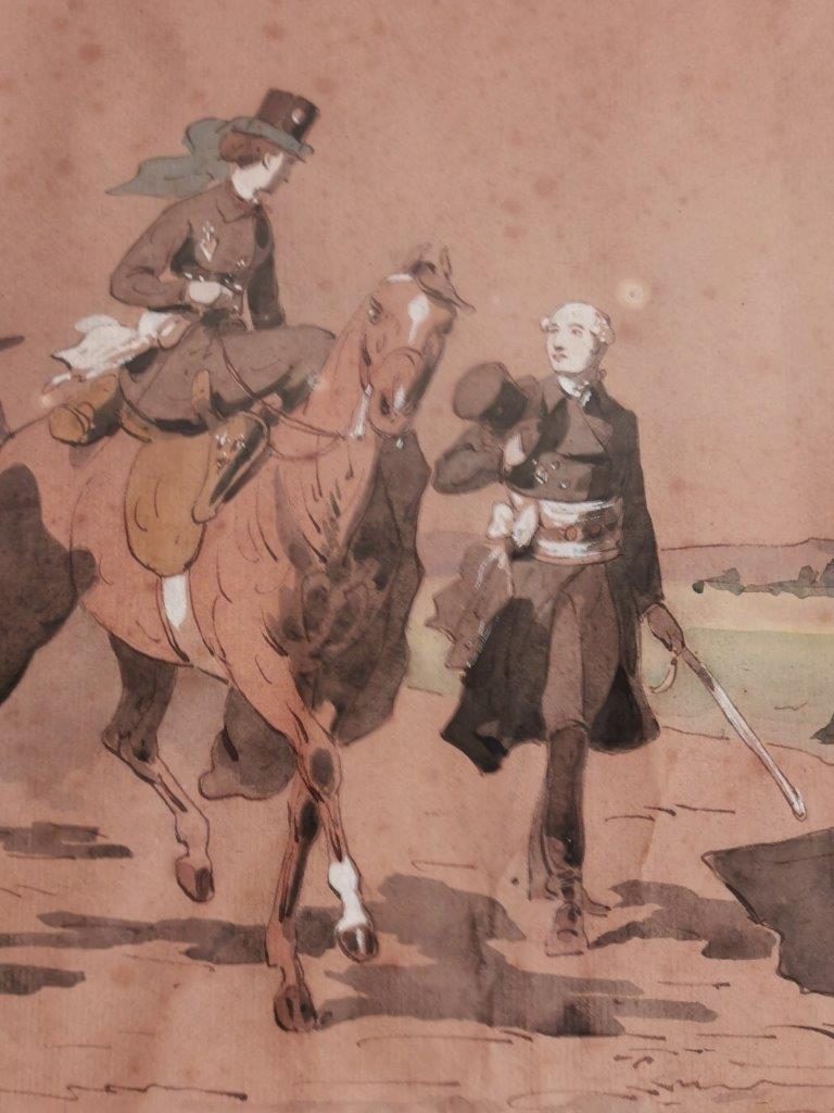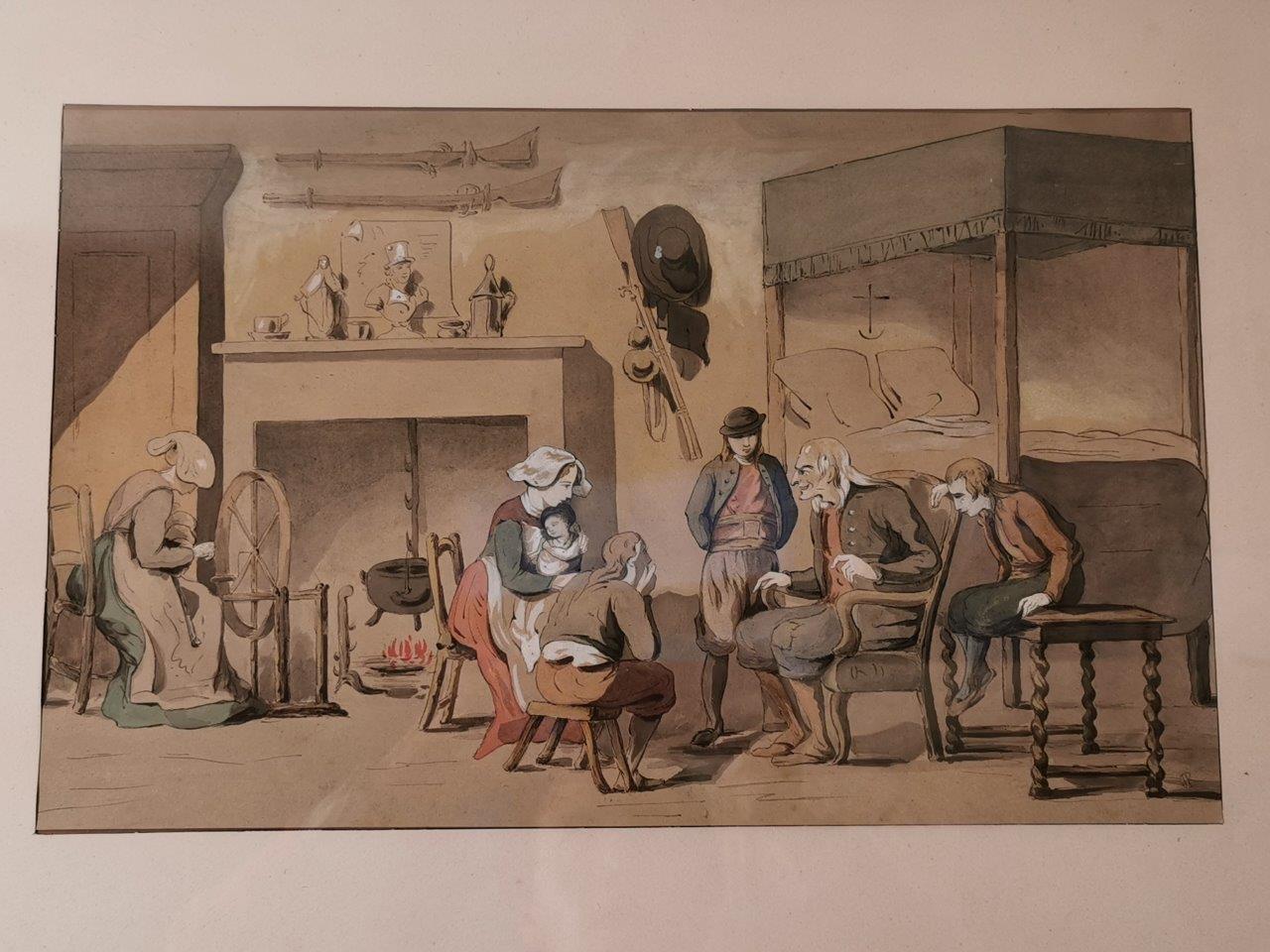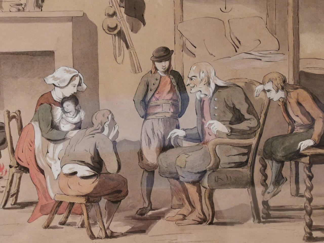 JOINT : Dans le goût de Septime LE PIPPRE (1833-1871), Le narracteur, aquarelle monogrammée JR (29,5 X 46,5 cm.).