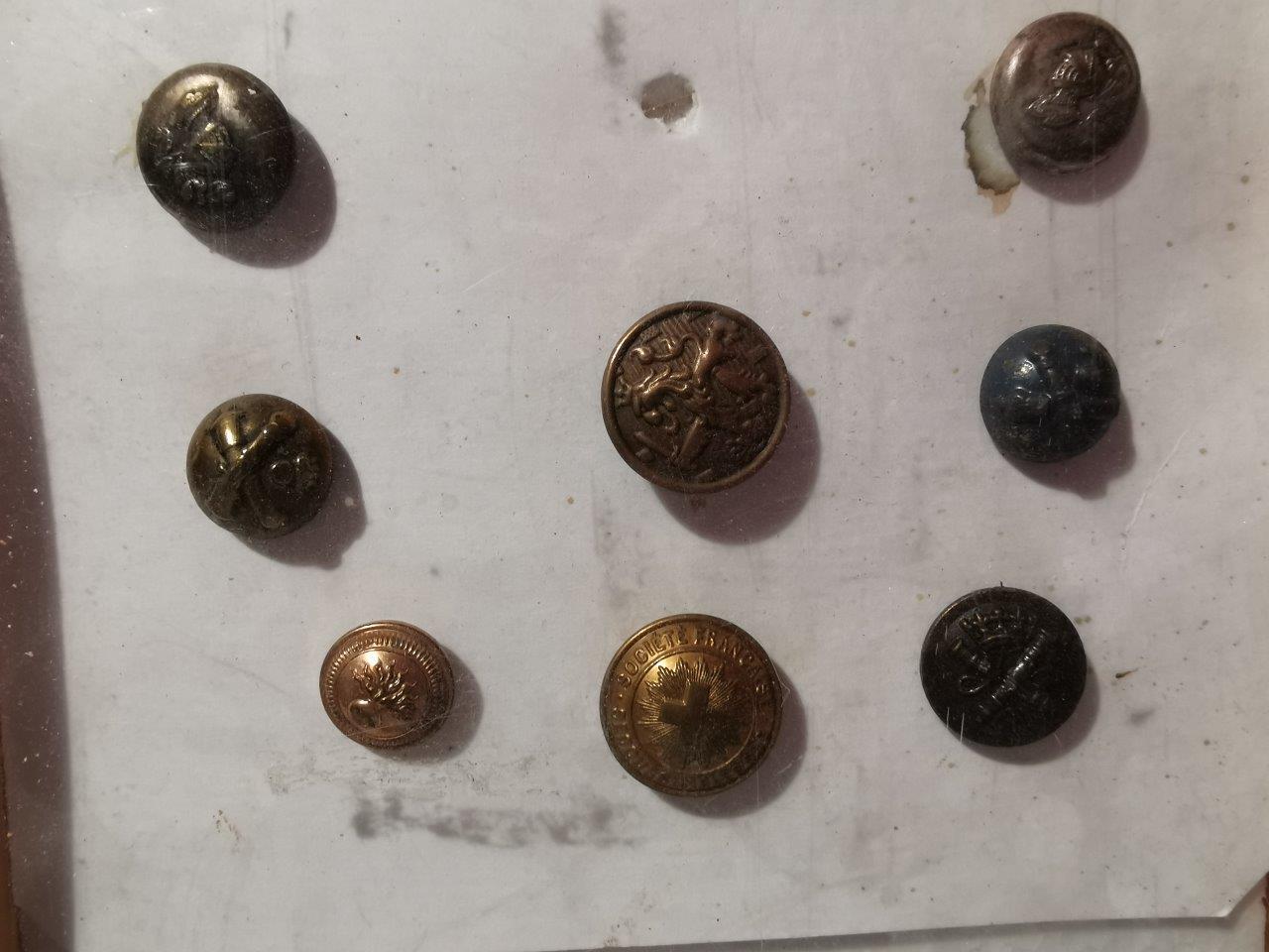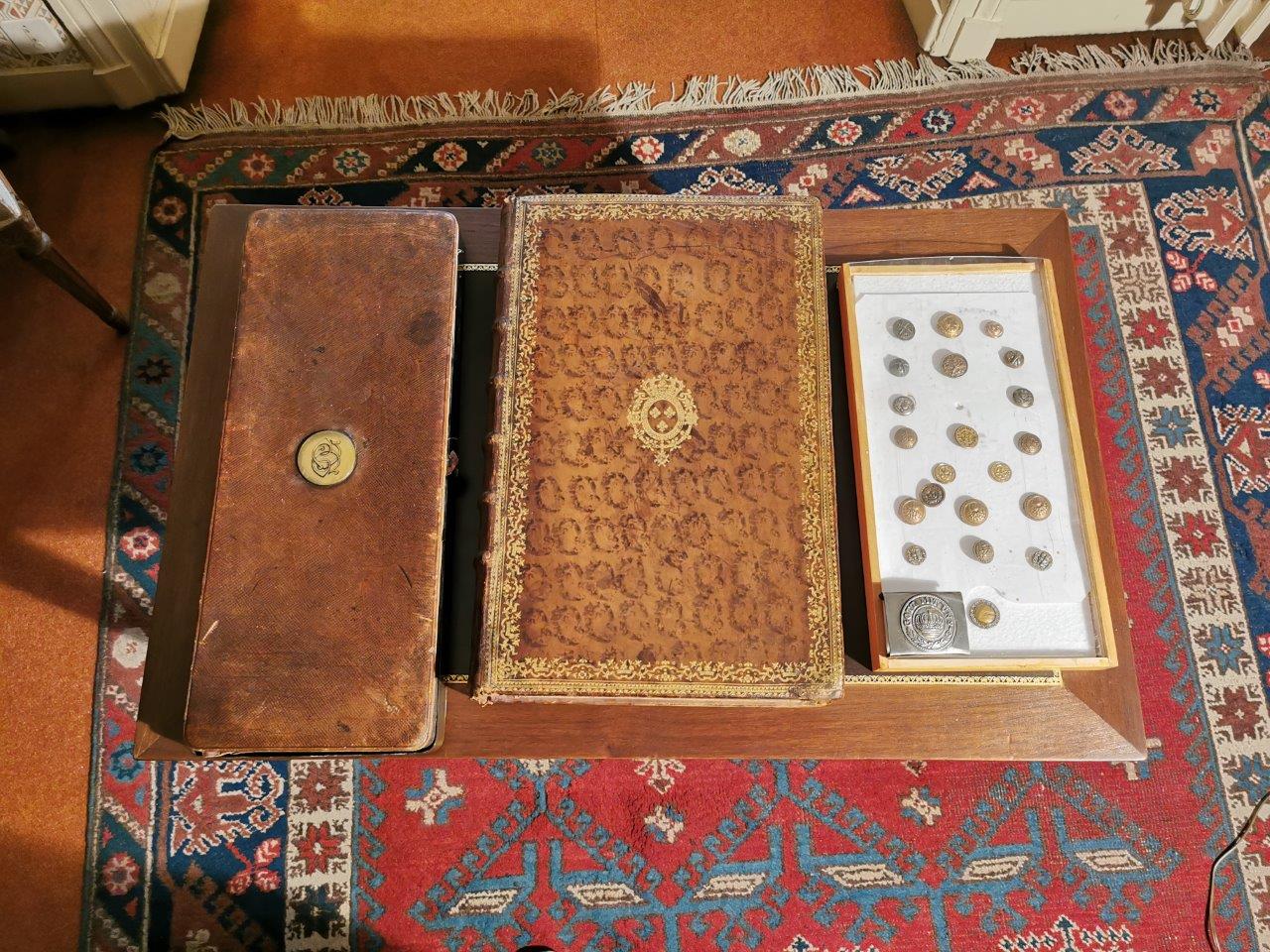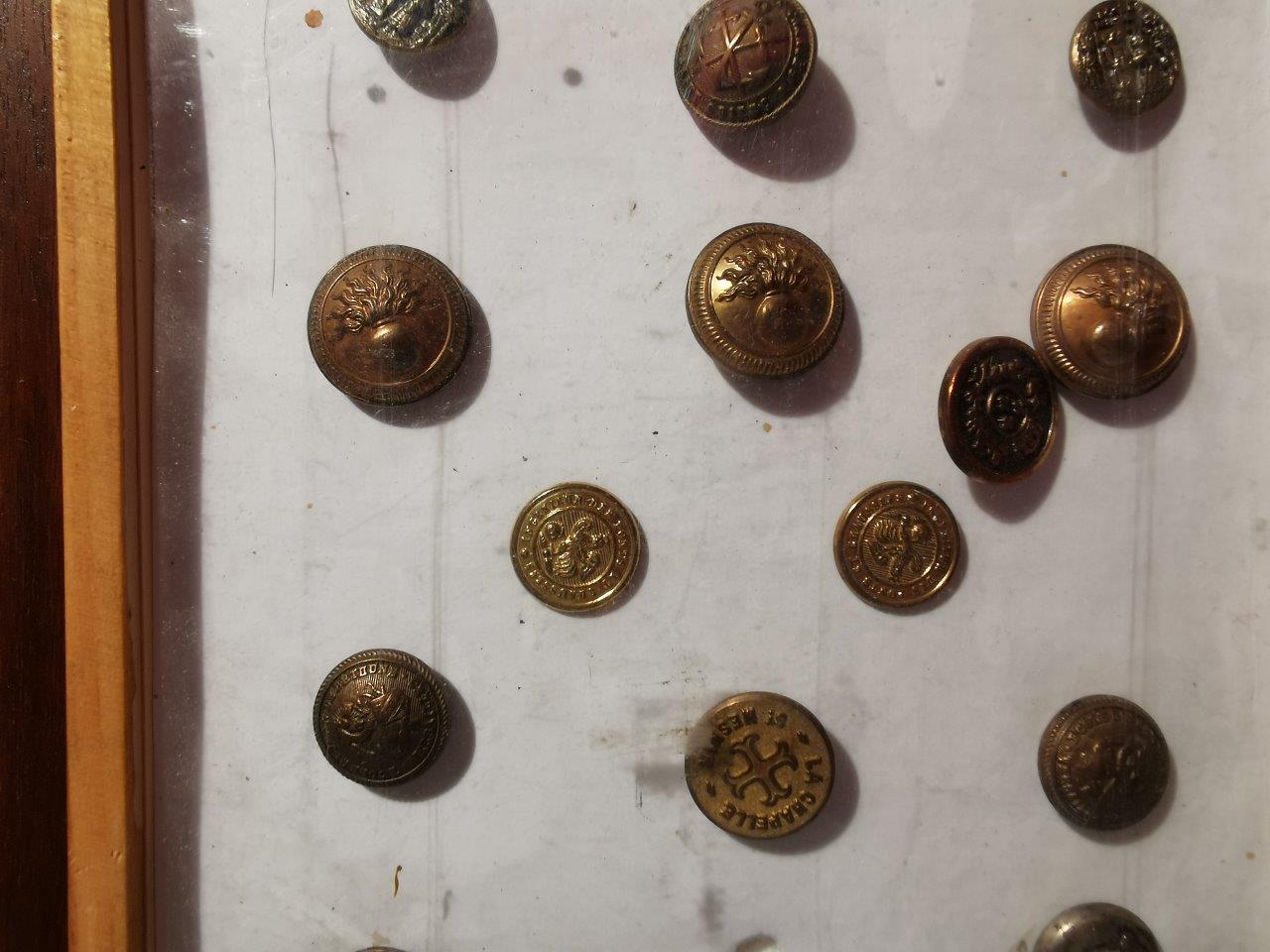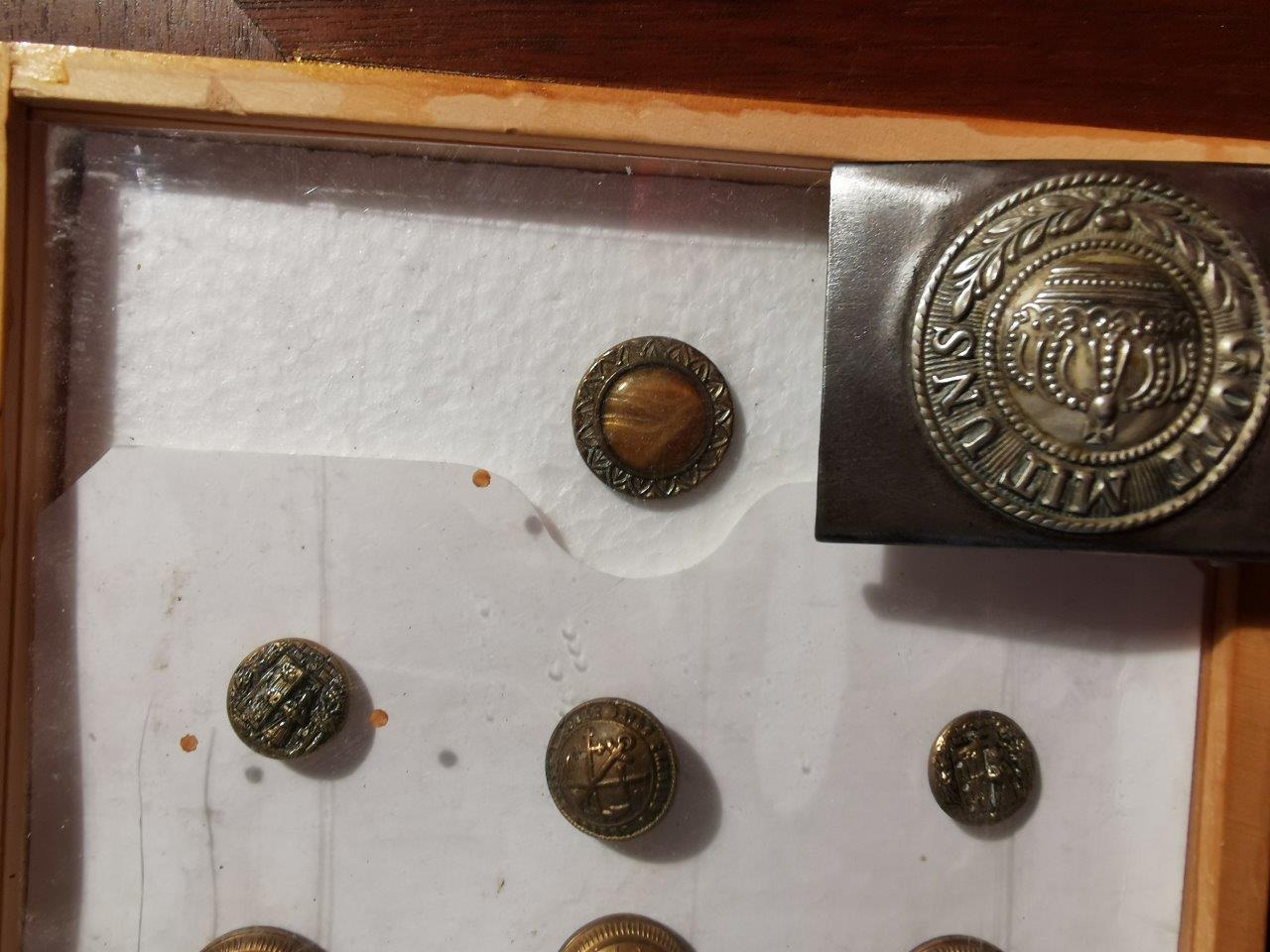 JOINT : COLLECTION de BOUTONS MILITAIRES, une BOUCLE de CEINTURE en métal et un petit COFFRET.