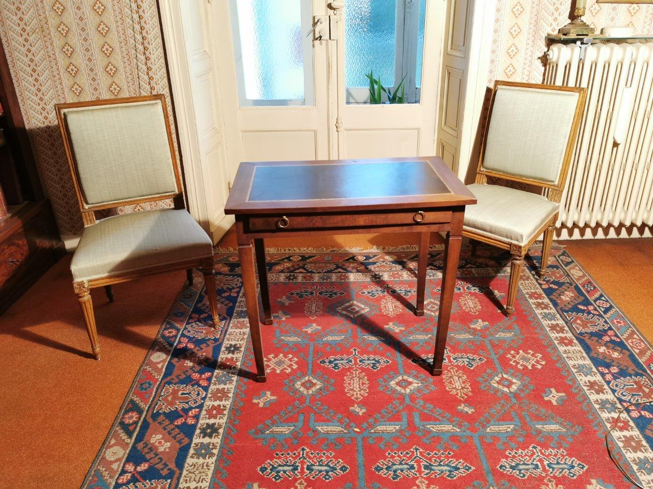 Petit BUREAU en bois teinté façon acajou reposant sur quatre pieds gaines. Dessus cuir vert.