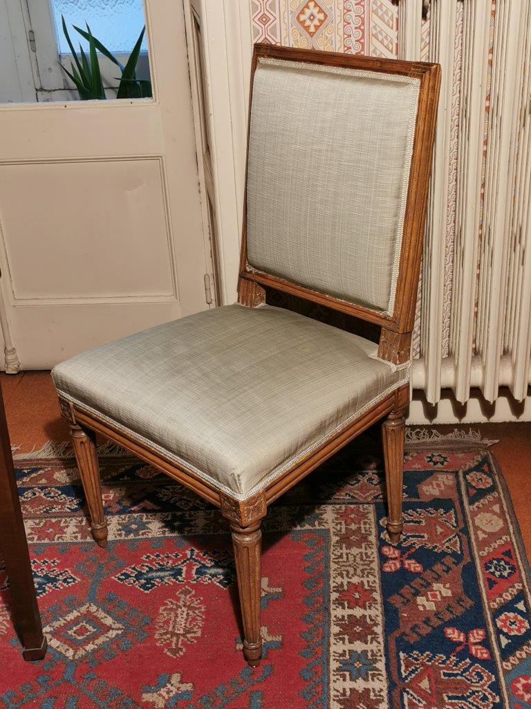 JOINT : Deux CHAISES en bois mouluré à pieds fuselés, cannelés. Style Louis XVI. (Haut. 88,5 Larg. 49, Prog. 50 cm) et un TAPIS en lain à fond rouge (Long. 350, Larg. 192 cm).