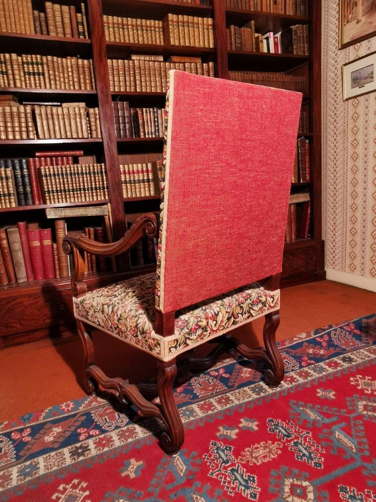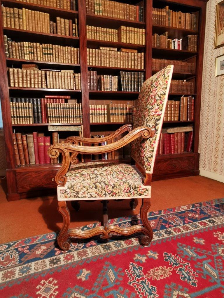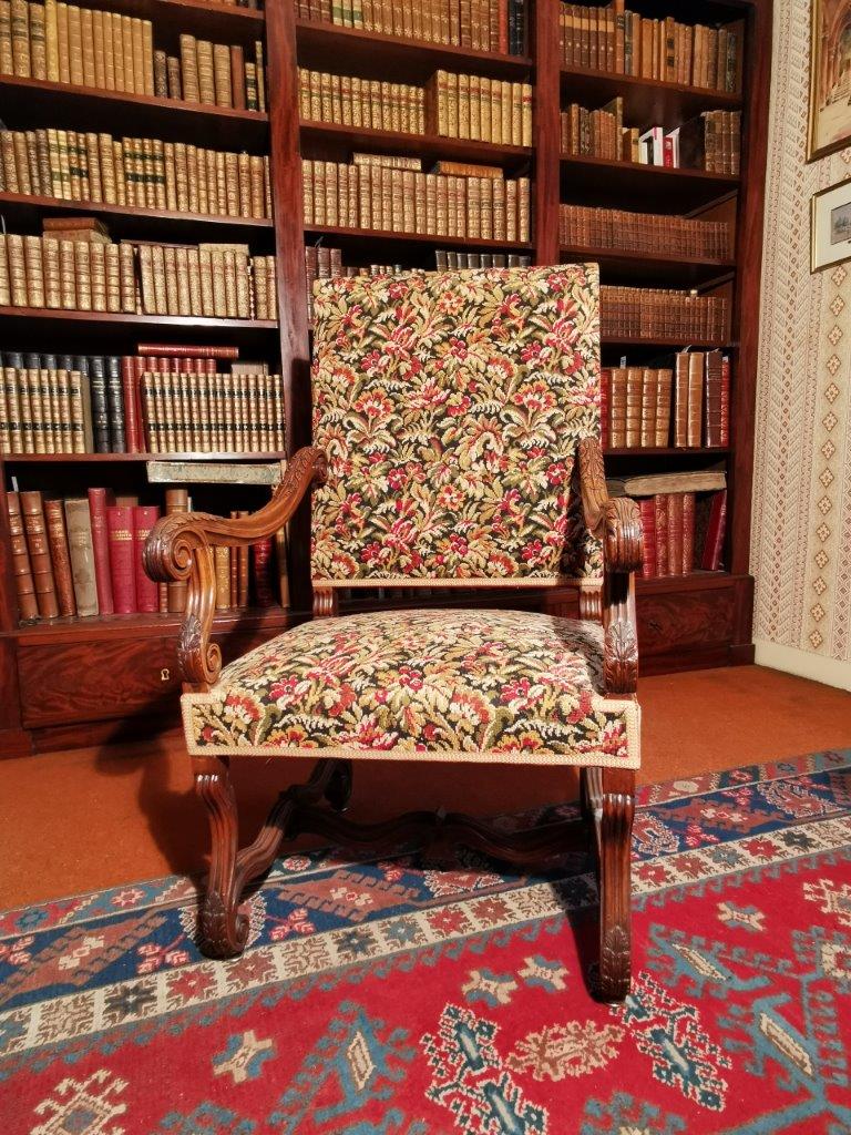 FAUTEUIL à DOSSIER DROIT en bois naturel les accotoirs à enroulements et décor de feuilles d'acanthe. Repose sur quatre pieds réunis par une entretoise en H.