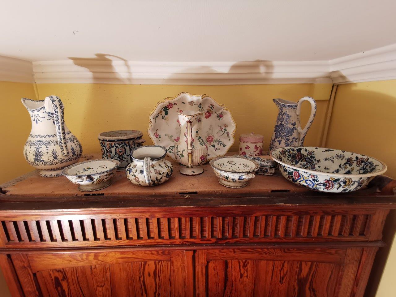 JOINT : FAÏENCES de GIEN au dessus-de l'armoire (pichets, boules à savon, etc.