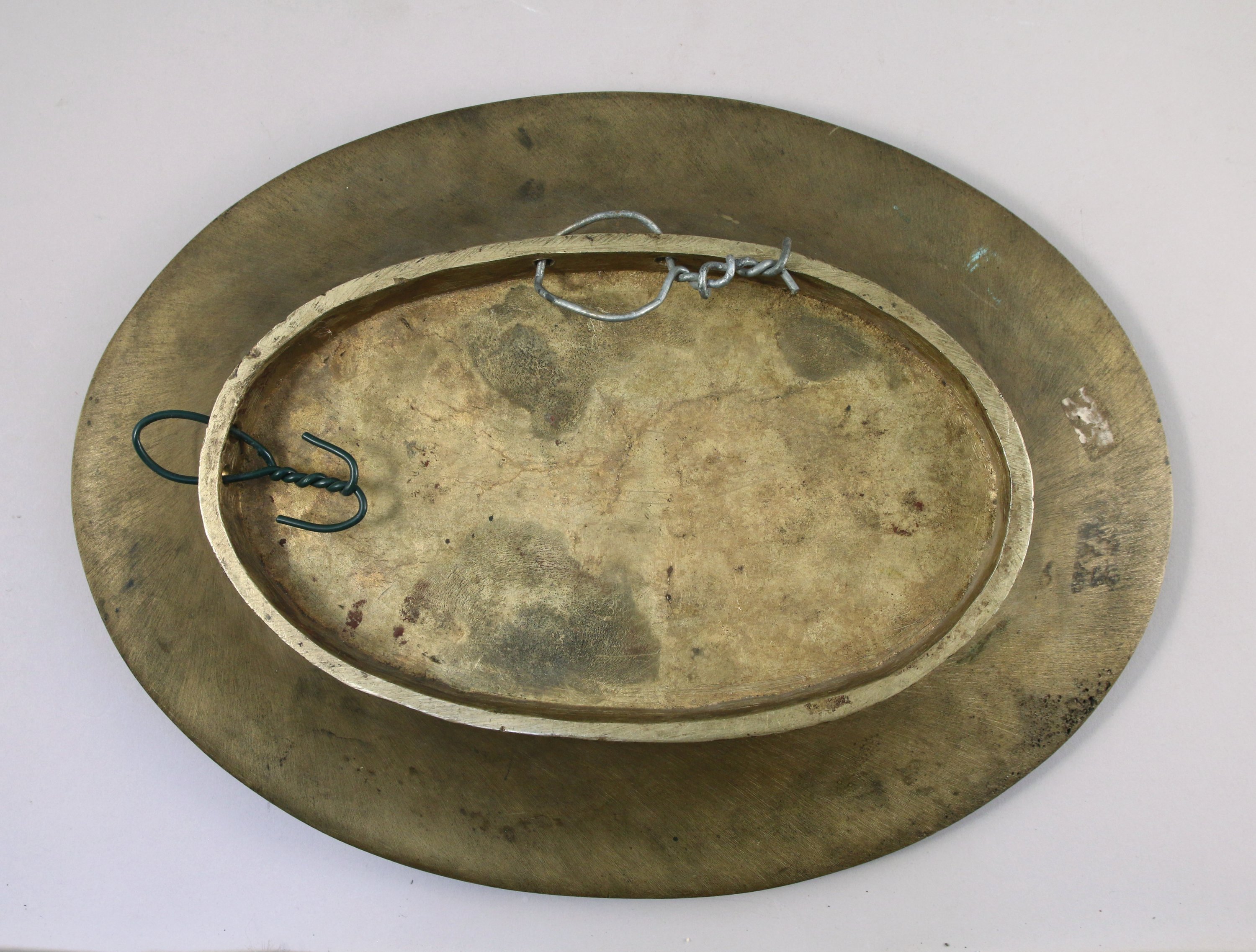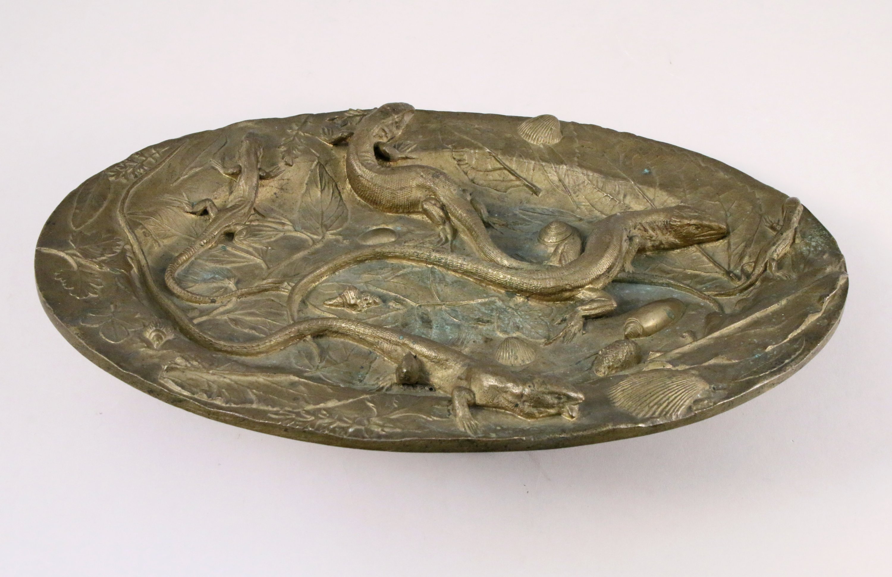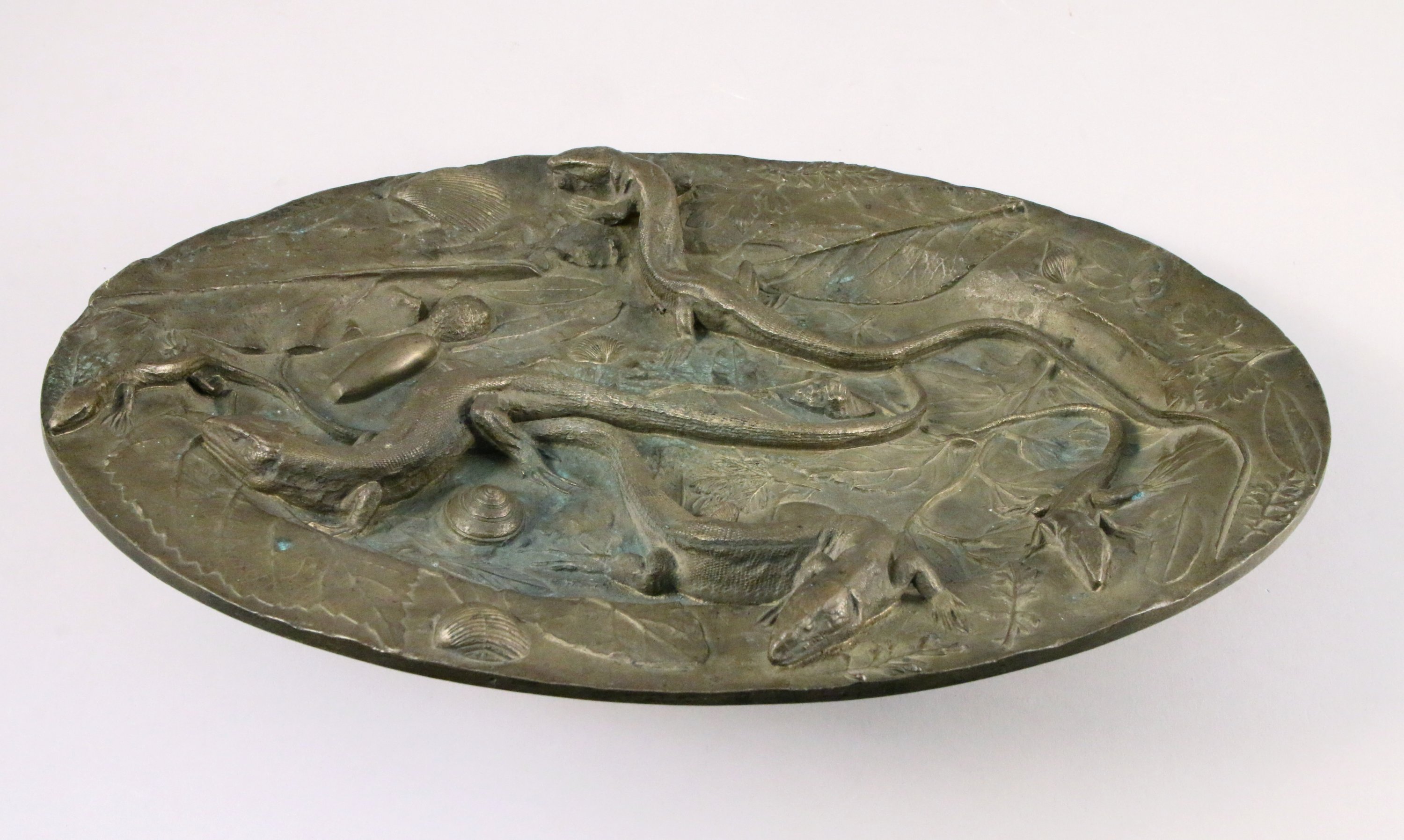 Bronze de forme ovale à décor en relief de lézards et coquillages sur des feuilles.