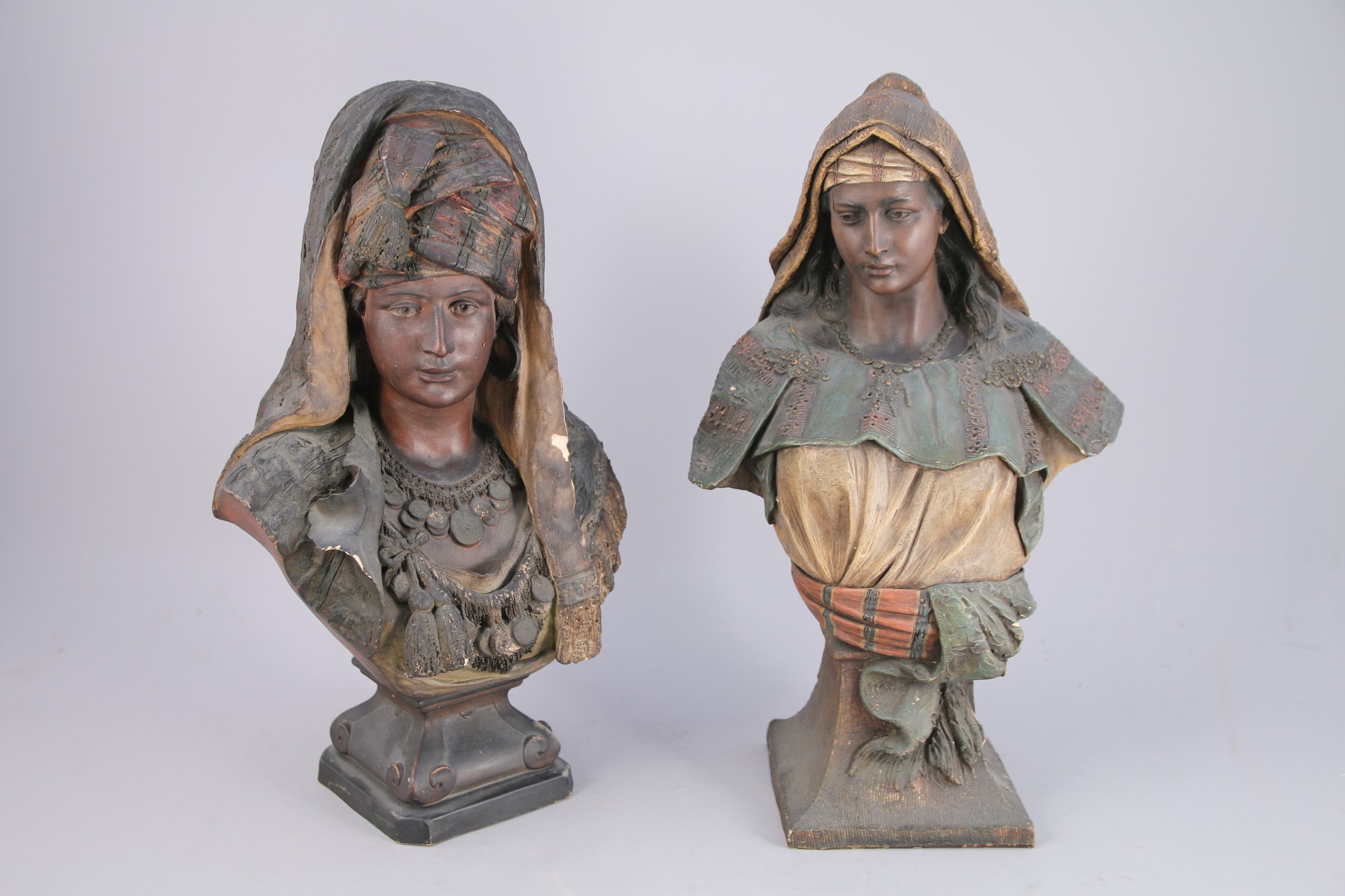 Deux plâtres patinés polychrome sur piédouche. L'un numéroté "512 / 41" et l'autre "527 / 33" avec une plaque "F.Golscheider / Reproduction réservée".