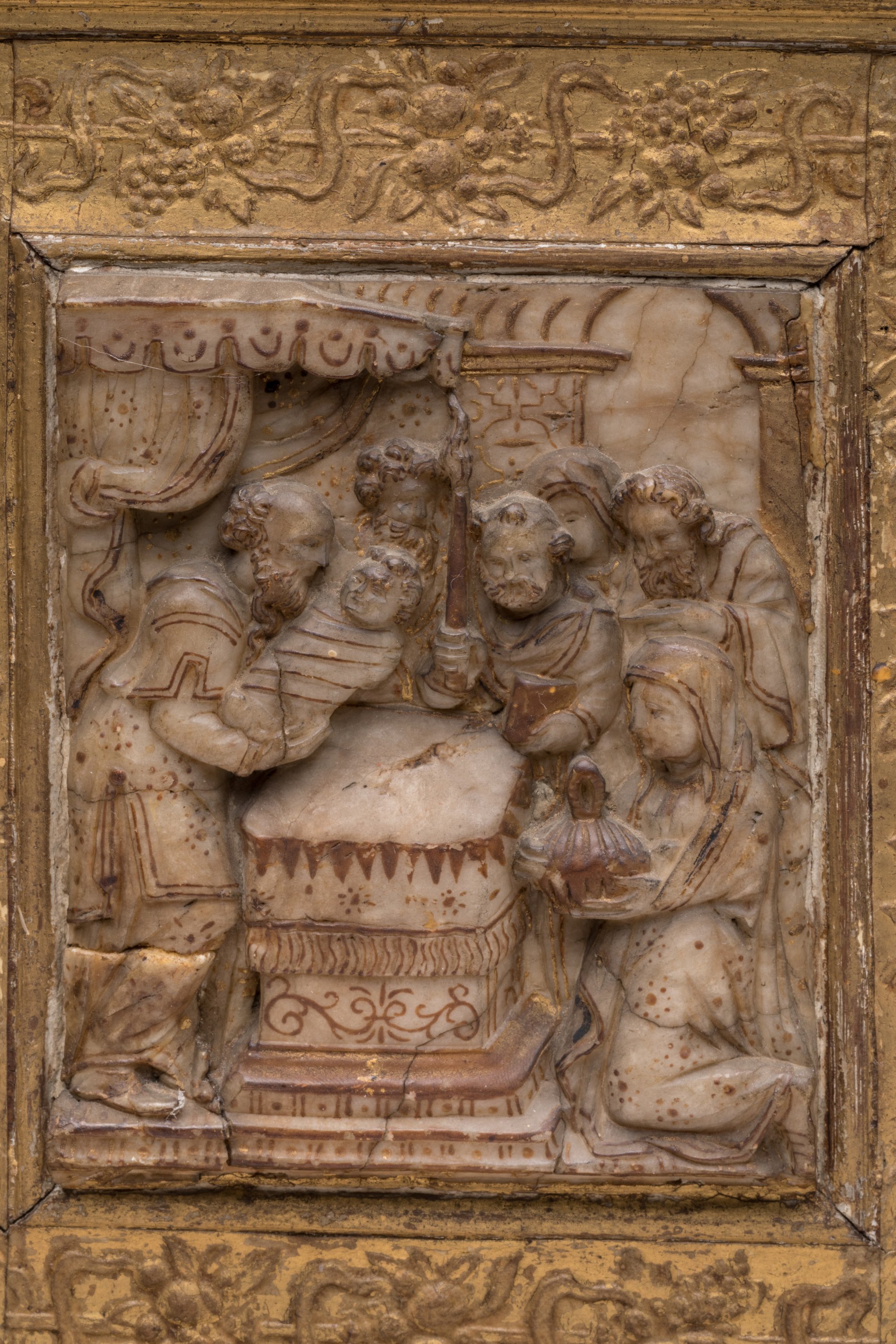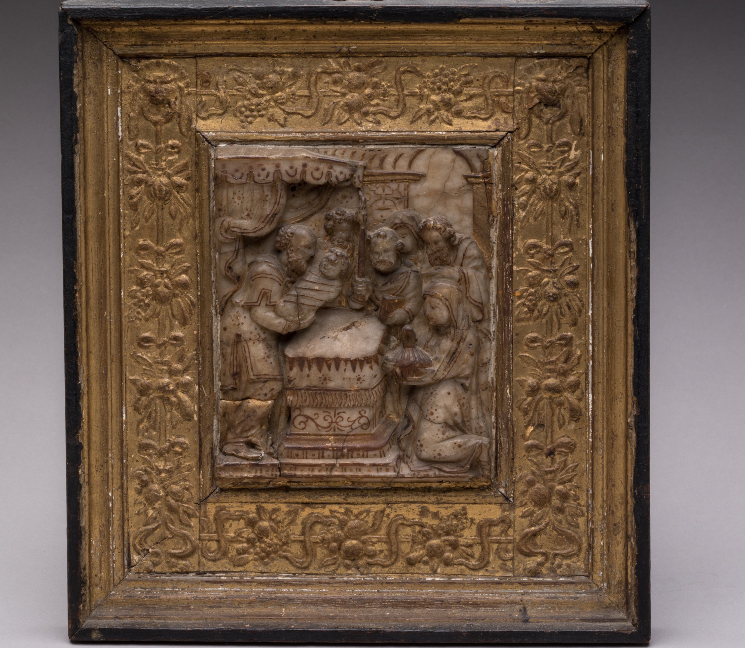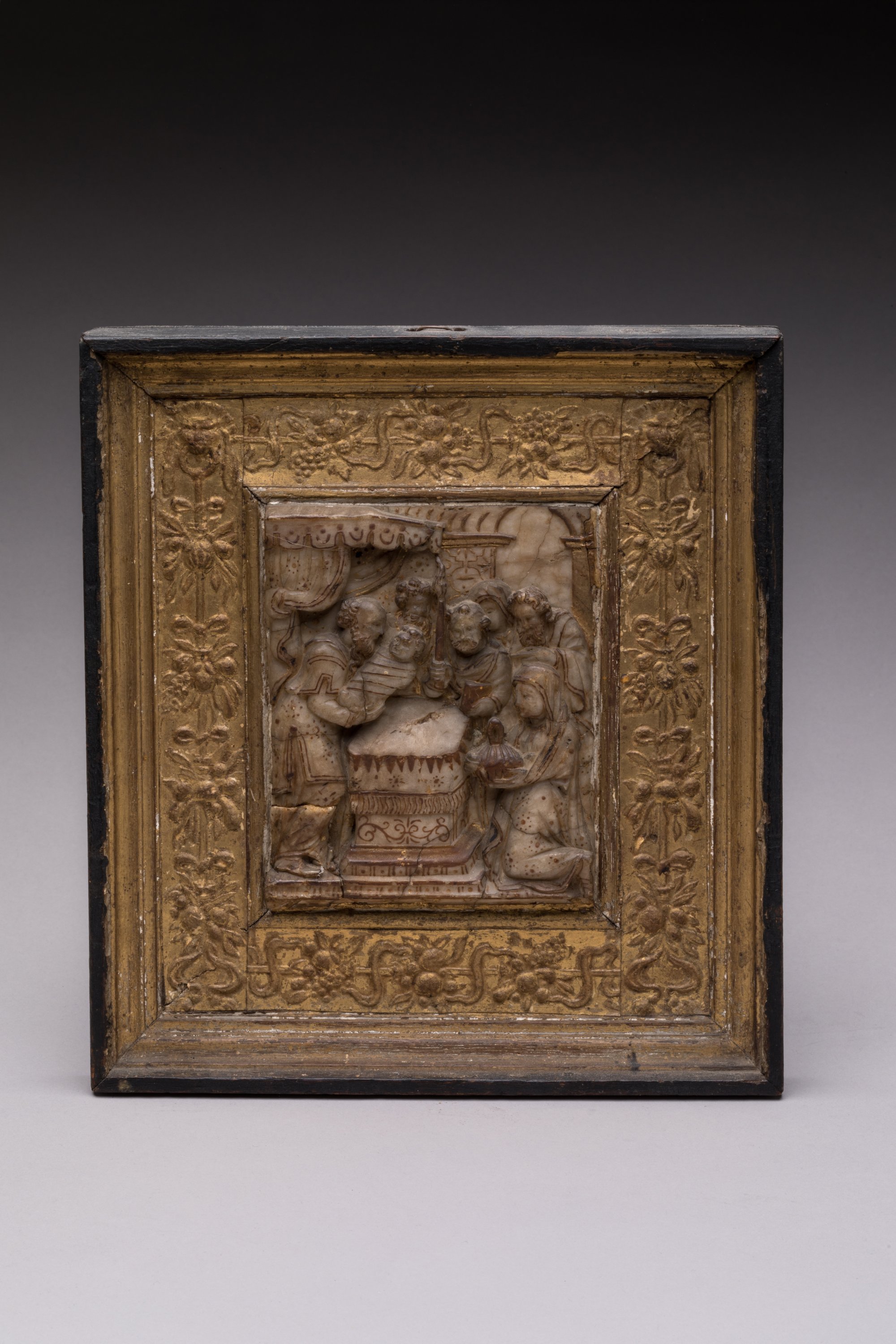 Plaque en albâtre sculpté en relief, avec décors rehaussés d'or.