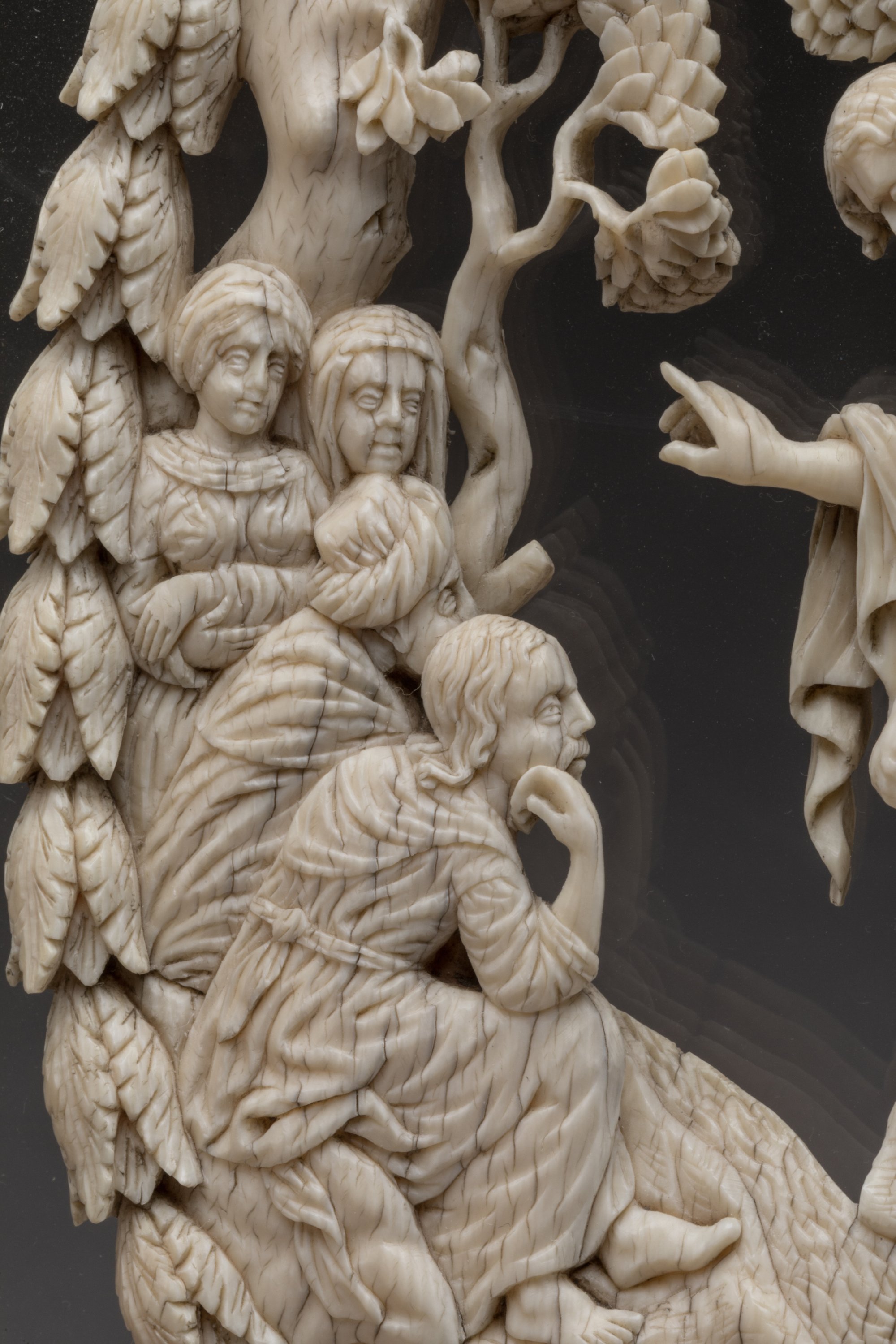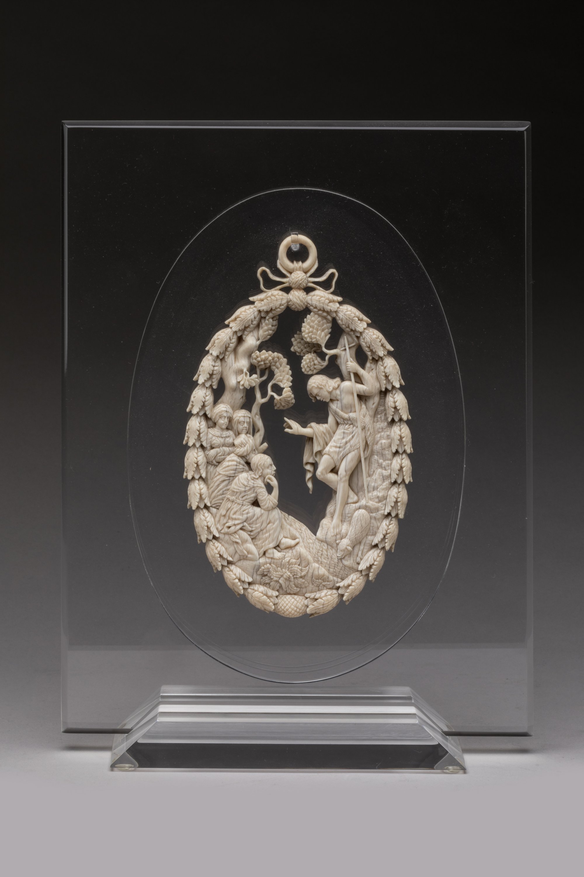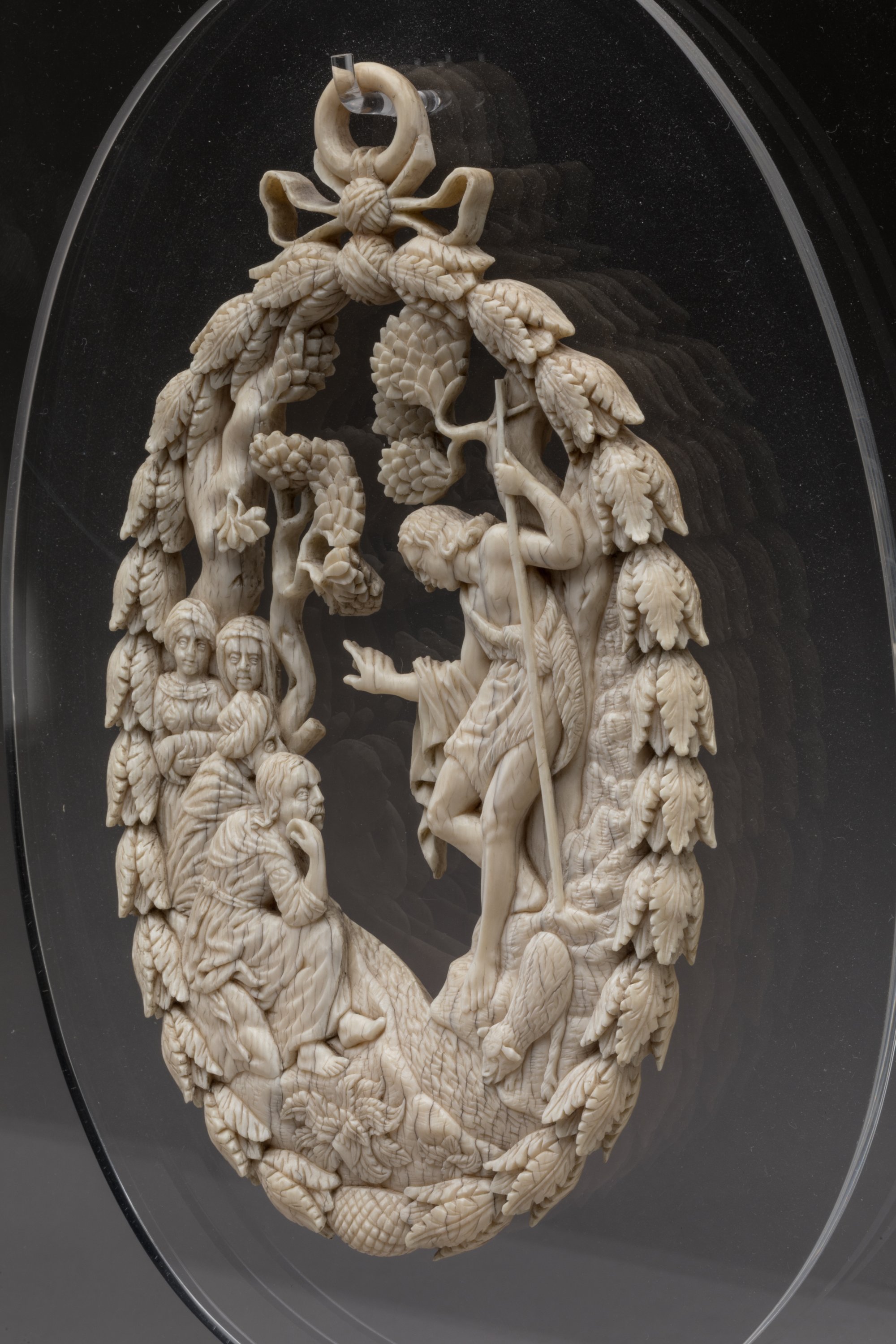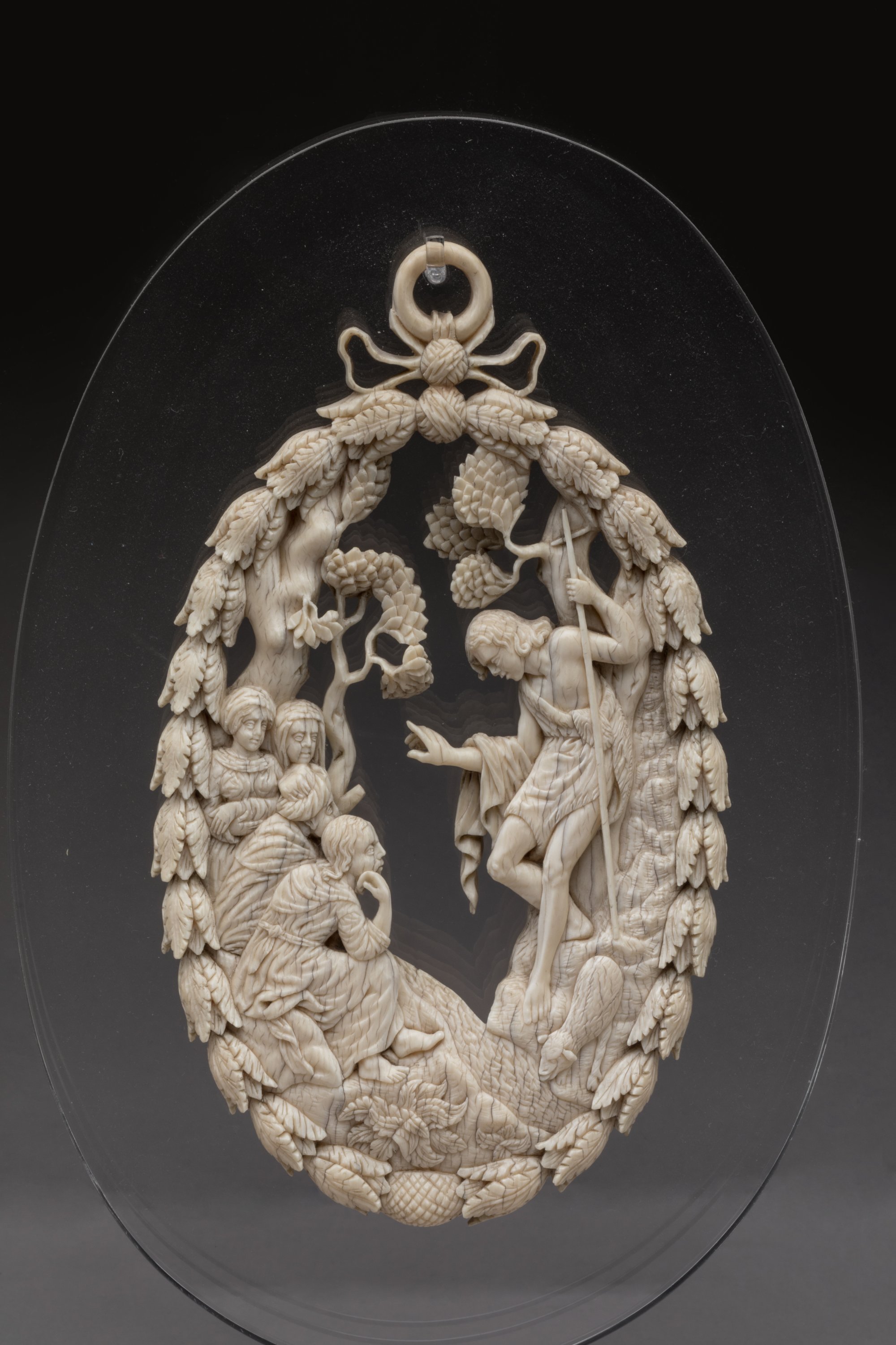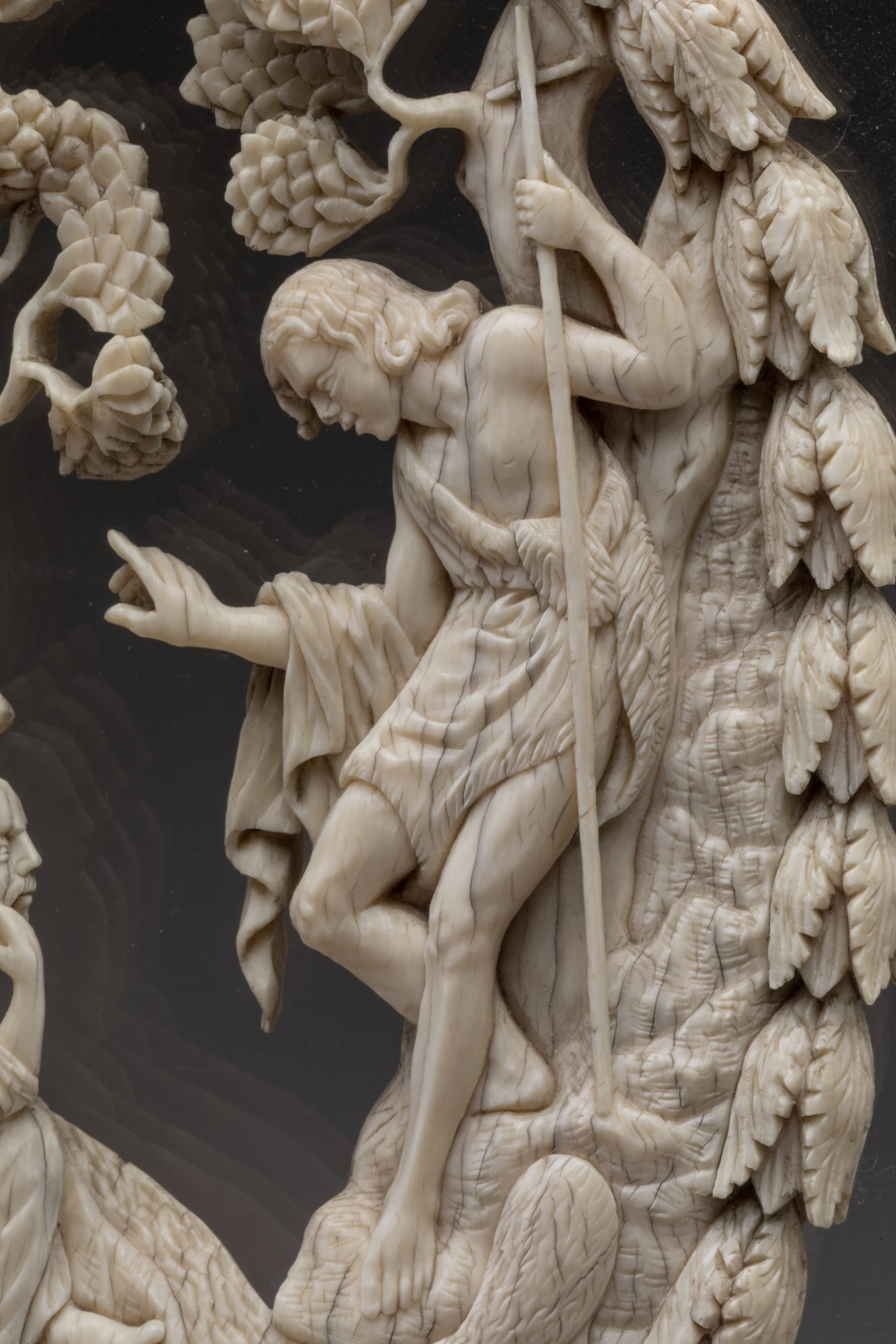 Ce petit objet de dévotion privée en ivoire sinspire de la gravure présentant la scène de la prédication de Jean-Baptiste daprès un original dIppolito Scarsella (1550-1620), diffusée par Raphael II Sadeler (1599-1632), lun des membres dune des dynasties de graveurs flamands les plus réputées du XVIIème siècle.