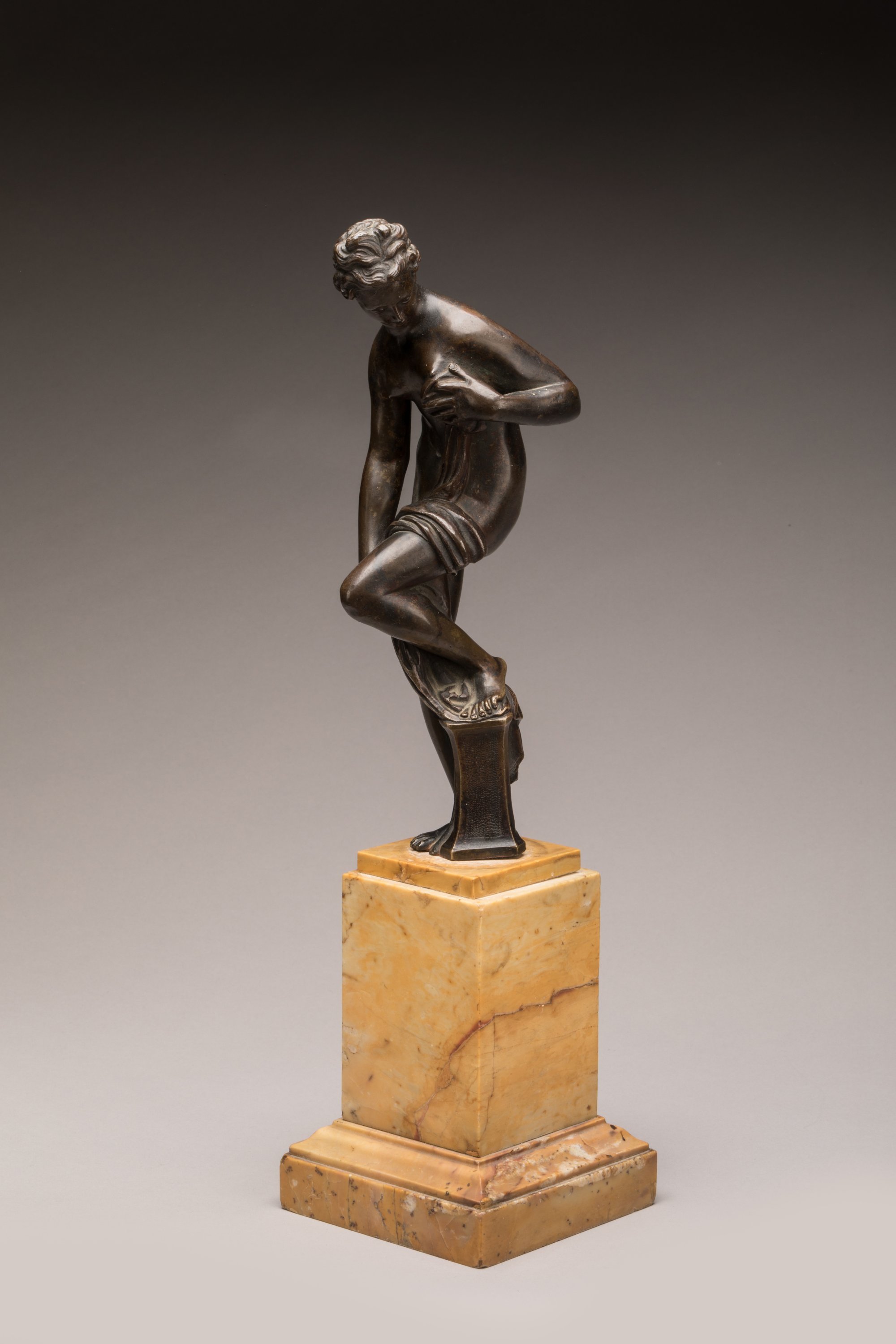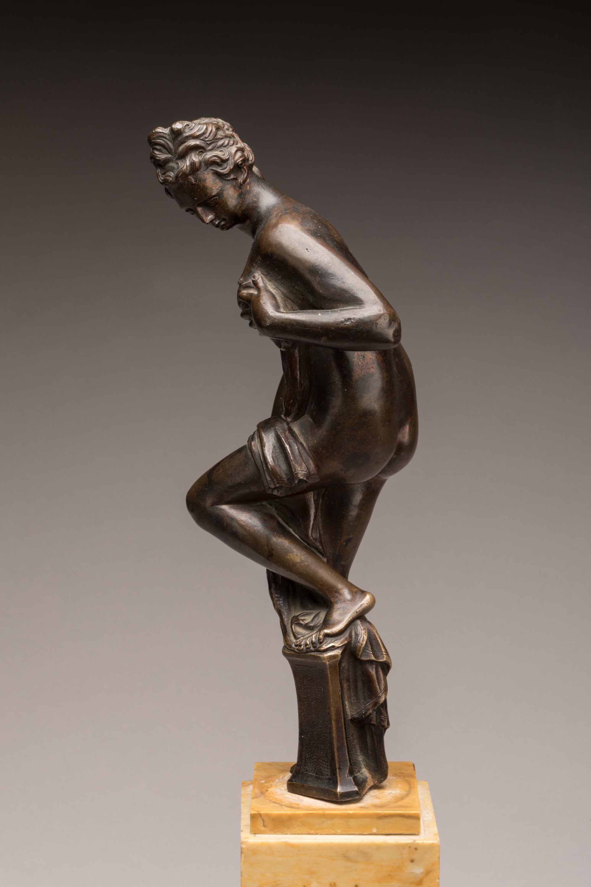 Par sa composition, cette Vénus au bain dérive de la statue monumentale de Jean Bologne, sa dernière oeuvre en marbre exécutée pour Giangiorgio II Cesarini, Marquis de Civitanova en avril 1583 (actuellement conservée au Palazzo Margherita, à Rome, actuellement ambassade des États-Unis). Ce marbre serait inspiré d'un modèle en cire utilisé pour la fonte d'une uvre signée qui est conservée au Kunsthistorisches Museum à Vienne, probablement exécutée vers 1564. Devenue l'une des plus célèbres compositions féminines de Jean Bologne, La Vénus Cesarini a été produite tout d'abord par Antonio et Gianfrancesco Susini avec de légères variations, puis par des générations d'artistes. Notre exemplaire est aussi à rapprocher d'une autre uvre du même artiste, la Petite Vénus au bain. On relève en effet la présence d'un seul drapé qu'elle presse sur le sein gauche, au lieu de deux dans la version originale. Le linge tombe ensuite le long de son flanc, faisant un retour sur sa cuisse gauche. Outre le drapé unique, un certain nombre de détails, comme la dimension légèrement réduite (25 cm au lieu de 33 cm) ou l'absence de socle circulaire, font supposer une fonte plus tardive d'un atelier italien, à l'instar des versions de 25,7 cm de haut de Massimiliano Soldani-Benzi (1656-1740). Notre statuette présente une fonte soignée dont la patine mordorée est vraisemblablement assombrie au XIXe siècle.