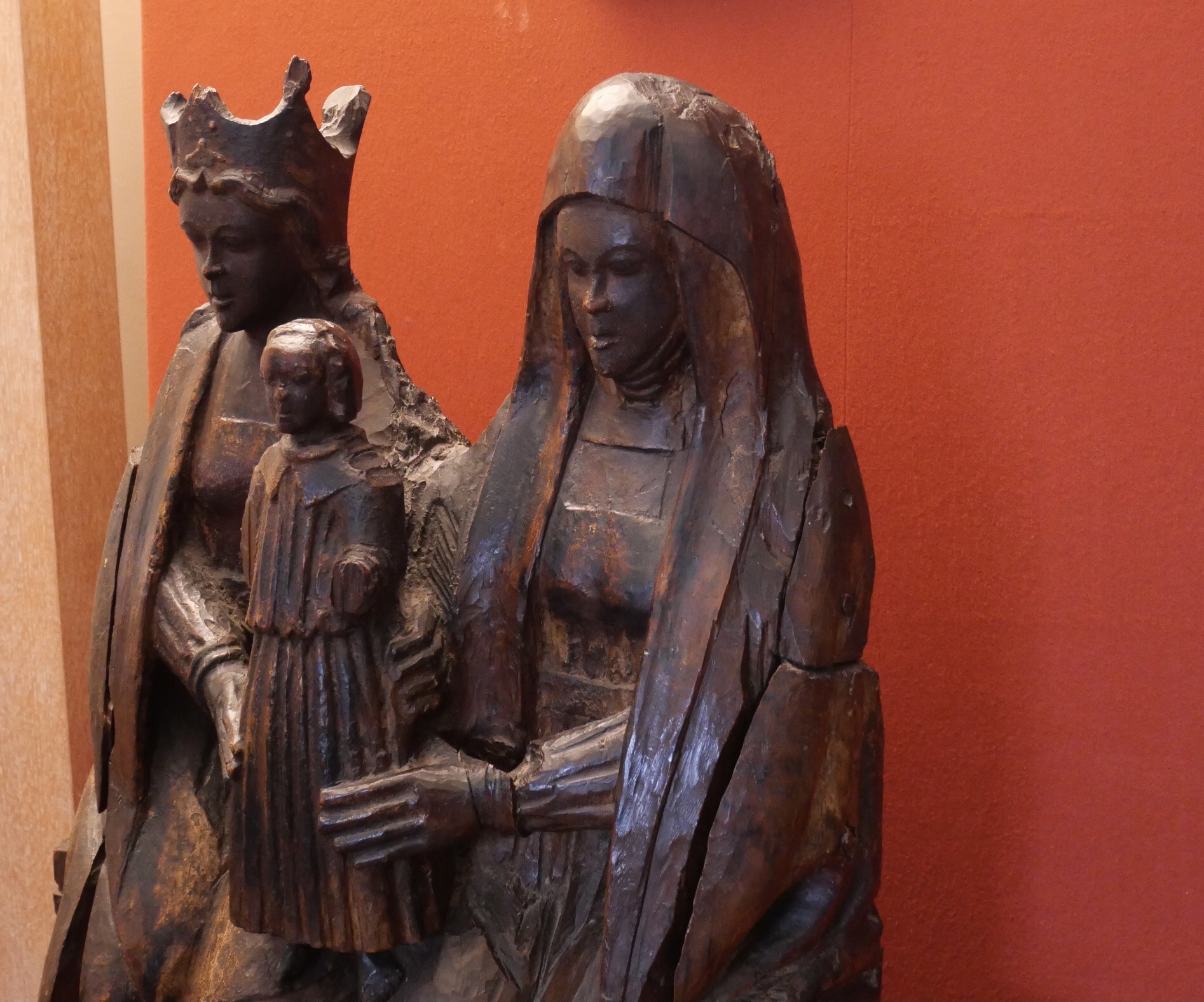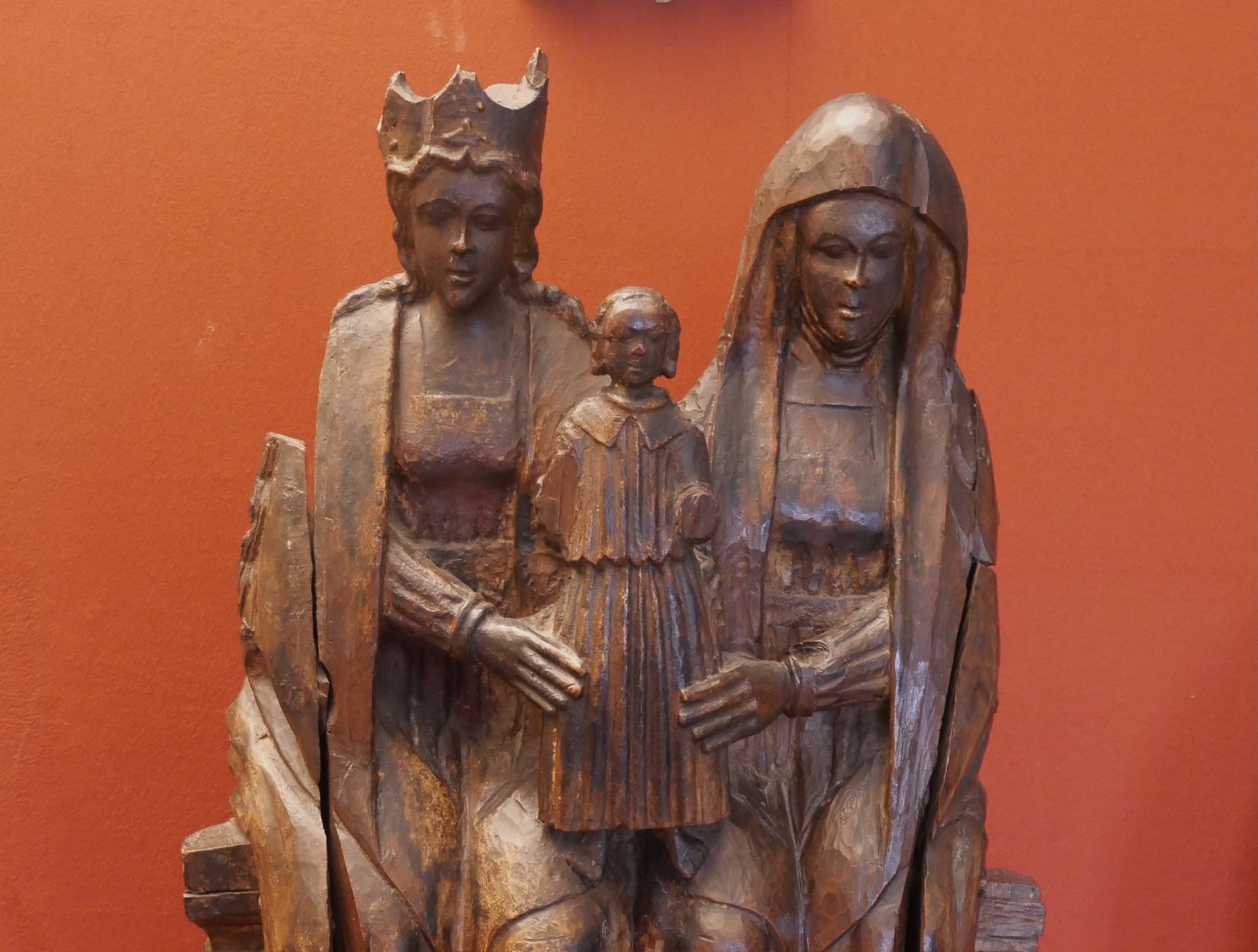 Anne et la Vierge Marie présentent le Christ enfant, debout sur leurs genoux, selon une iconographie appelée Sainte Anne trinitaire. La Bible ne fait pas cas de la généalogie de la Vierge, et par extension de la vie de Ste Anne, mais celle-ci connue un vif succès grâce à la Légende Dorée de Jacques de Voragine à la fin du Moyen Age. A la suite des visions de sainte Colette de Corbie au XVème siècle, ses représentations se multiplient et spécialement celle dont sinspire notre uvre : la figuration dune Trinita Humanissima dans une relation toute hiératique. La grand-mère de Jésus joue effectivement un rôle fondamental dans la conception de la Trinité : regroupée avec la Vierge et lEnfant Jésus, Anne fait contrepoids à la Trinité divine composée du Père du Fils et du Saint Esprit. Elle intervient aussi dans une conception trinitaire très féminine de la Sainte Famille, dans laquelle elle se substitue à Joseph.
