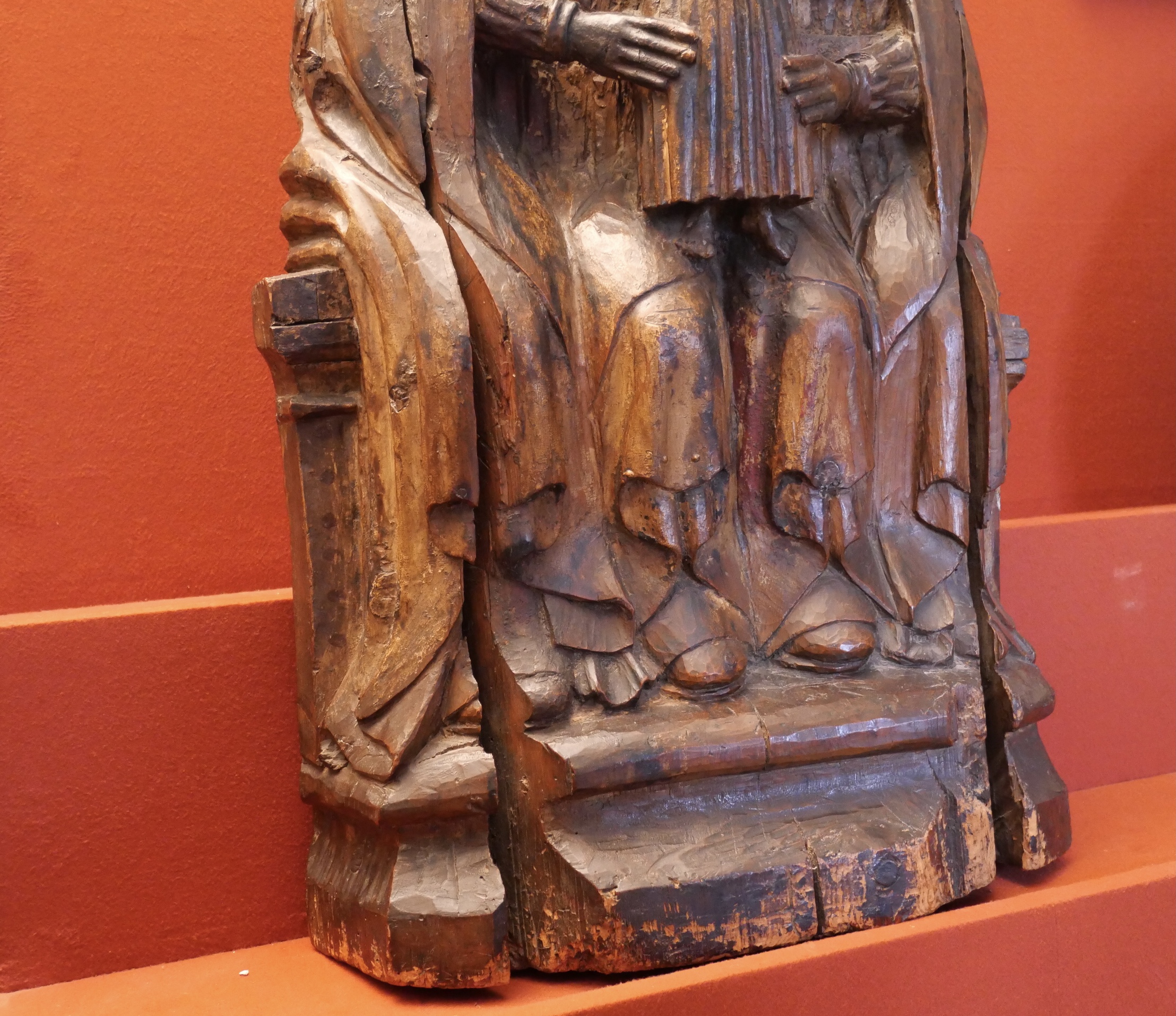 Groupe sculpté en fort relief en bois, traces de dorure et polychromie.