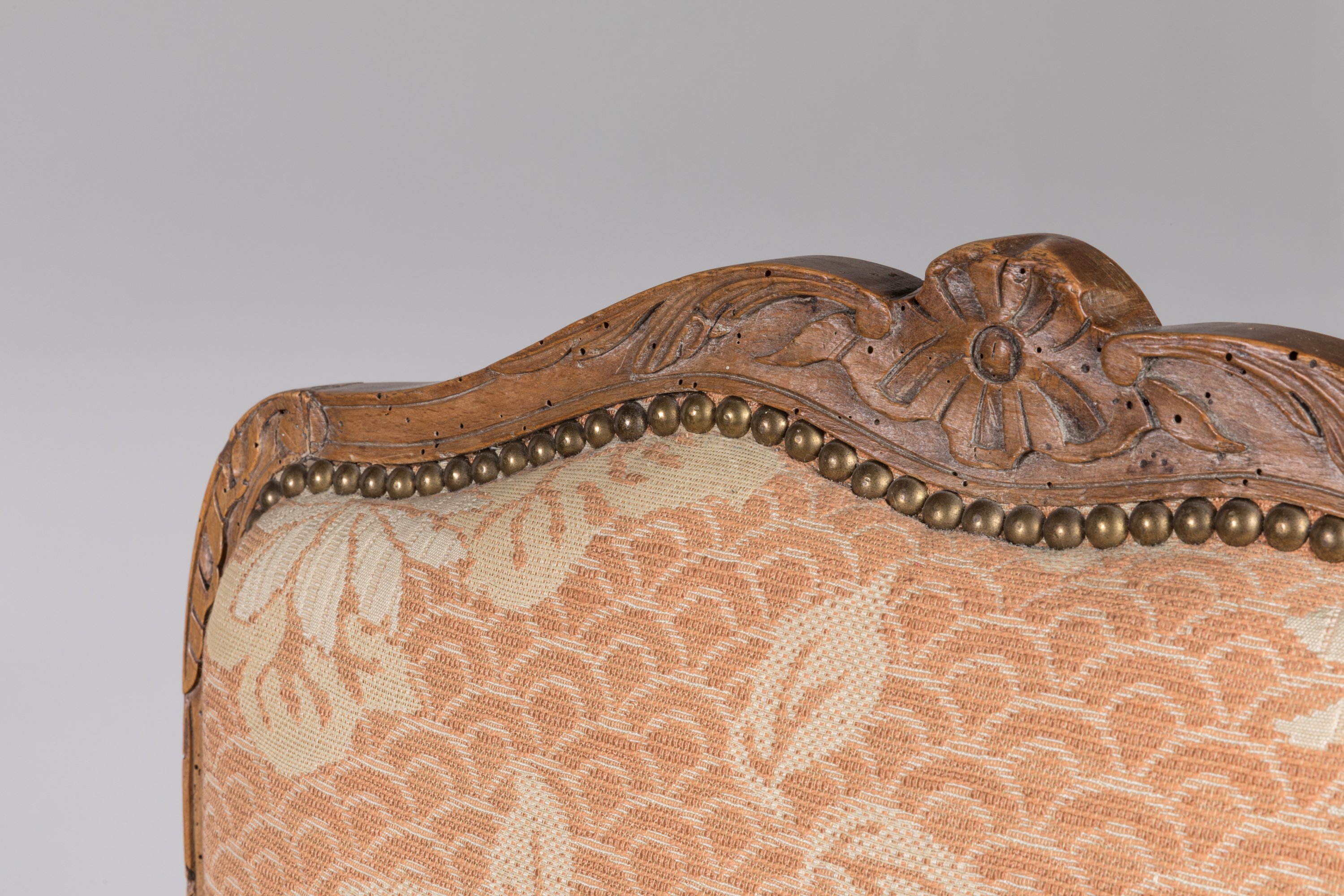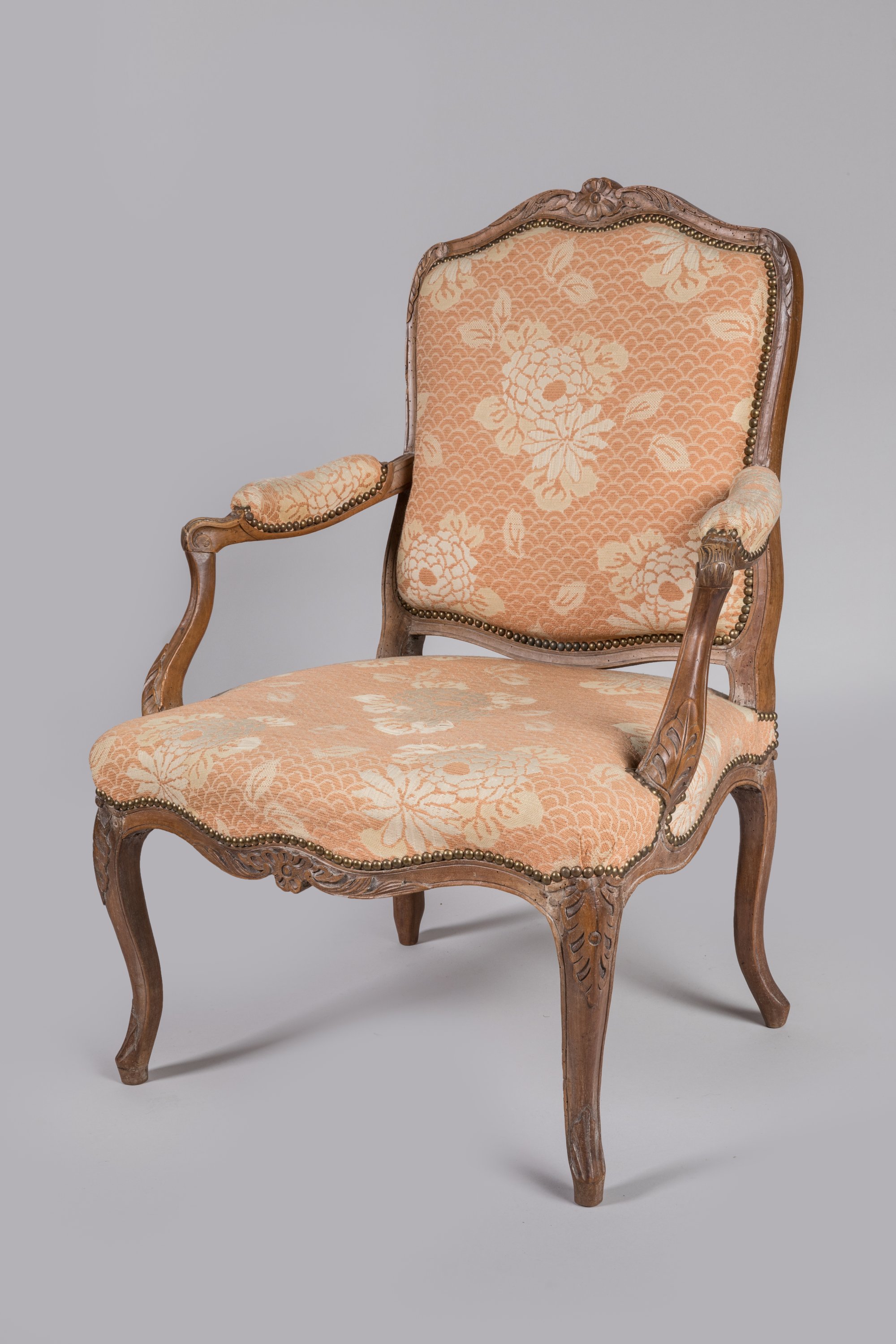 en hêtre mouluré et sculpté, le dossier violoné décoré à l'amortissement d'une fleur entourée de rinceaux d'acanthe, les accotoirs à manchettes se terminant par une feuille d'acanthe et un enroulement reposent sur des consoles en coup de fouet orné d'un décor feuillagé. La ceinture chantournée offre un décor de fleurette et rinceaux. Quatre pieds cambrés en console.